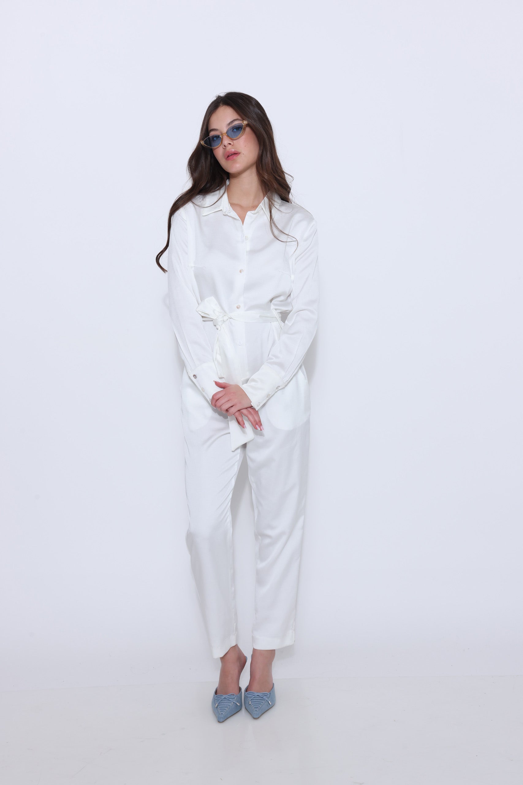 אוברול שרוולים ארוכים מבד סאטן עם כפתורים וחגורה עם קשירה
