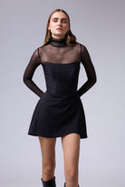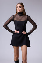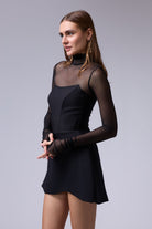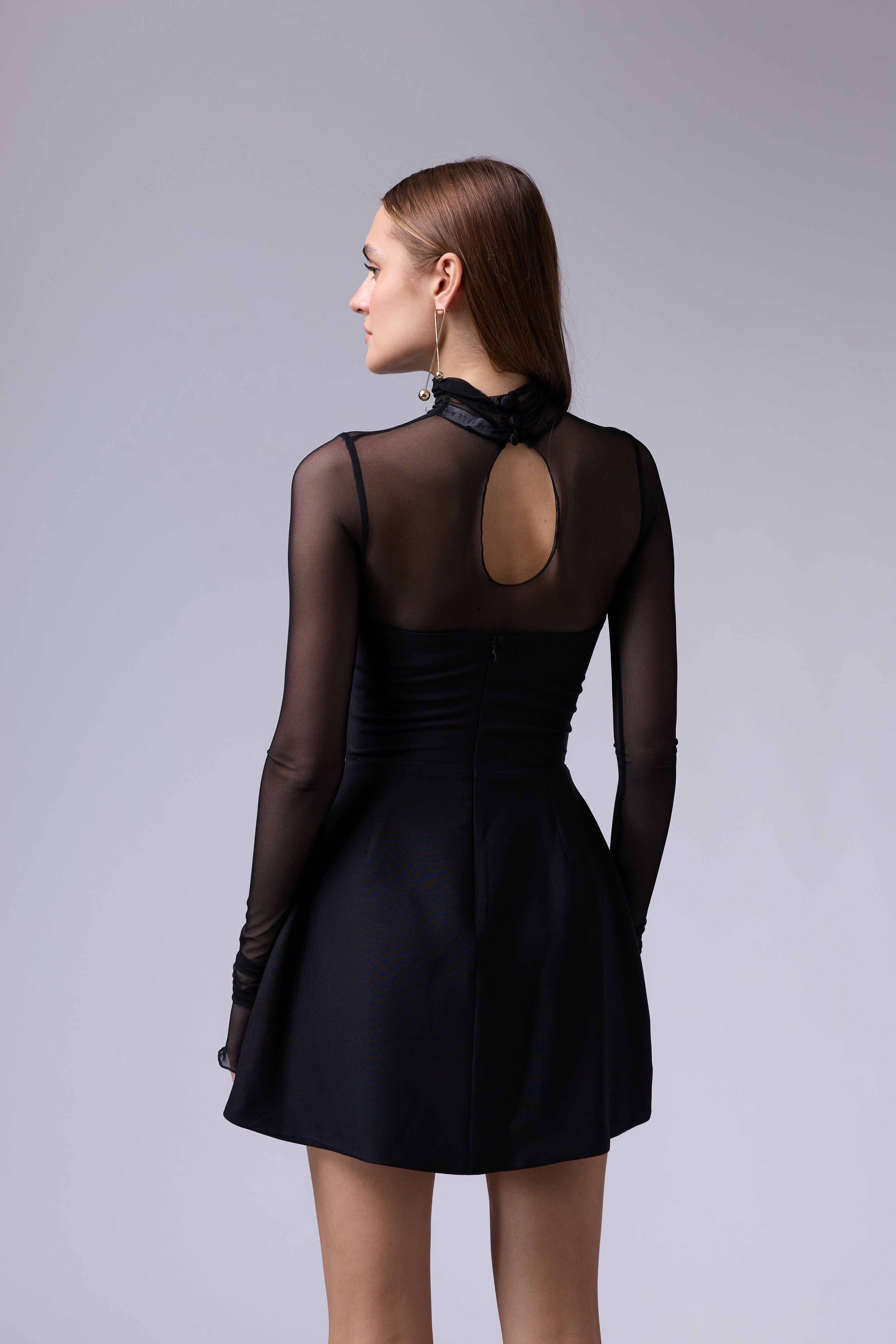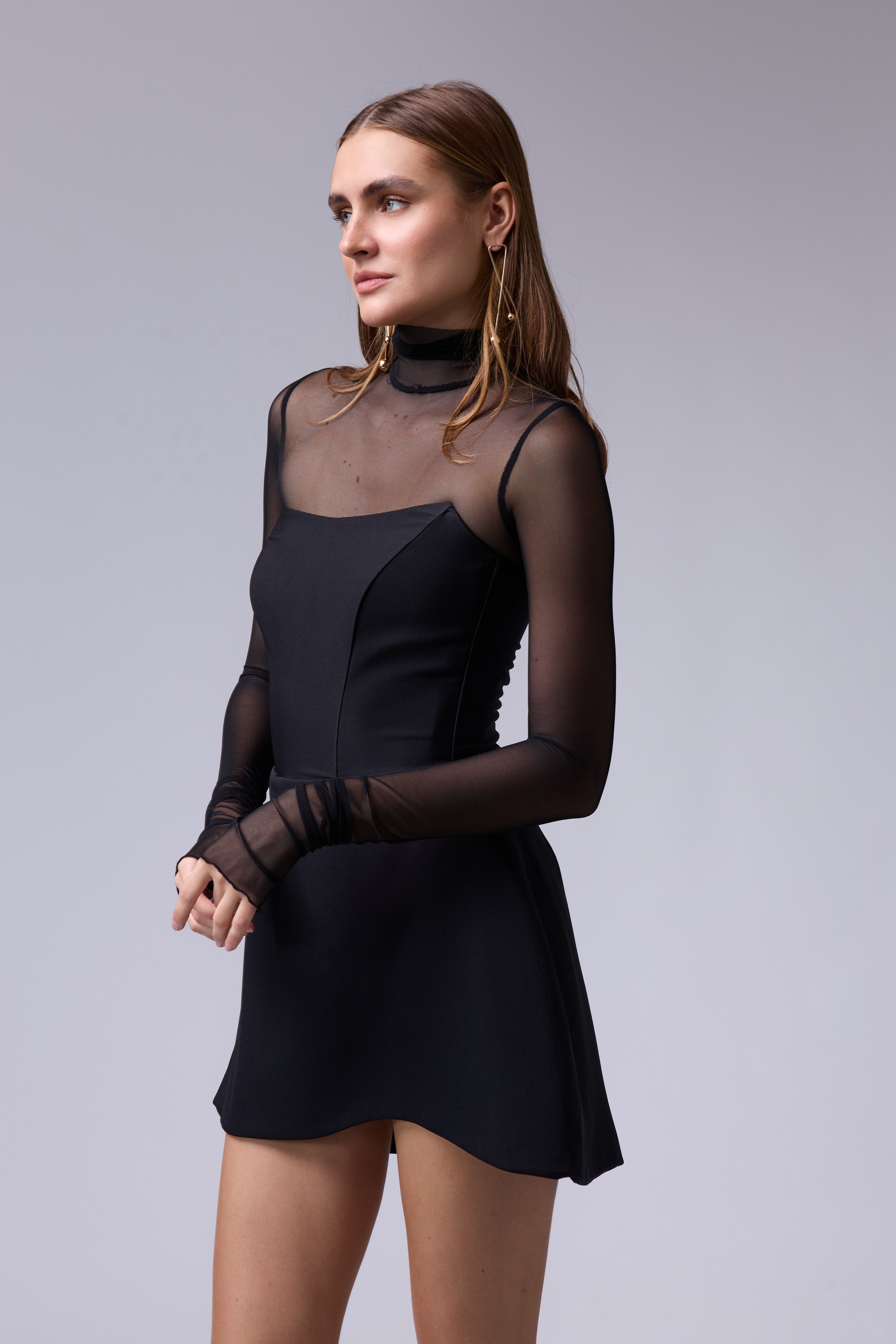 שמלה מיני סטרפלס בלון מבד מונקו בשילוב של בגד גוף נפרד שקוף וסקסי