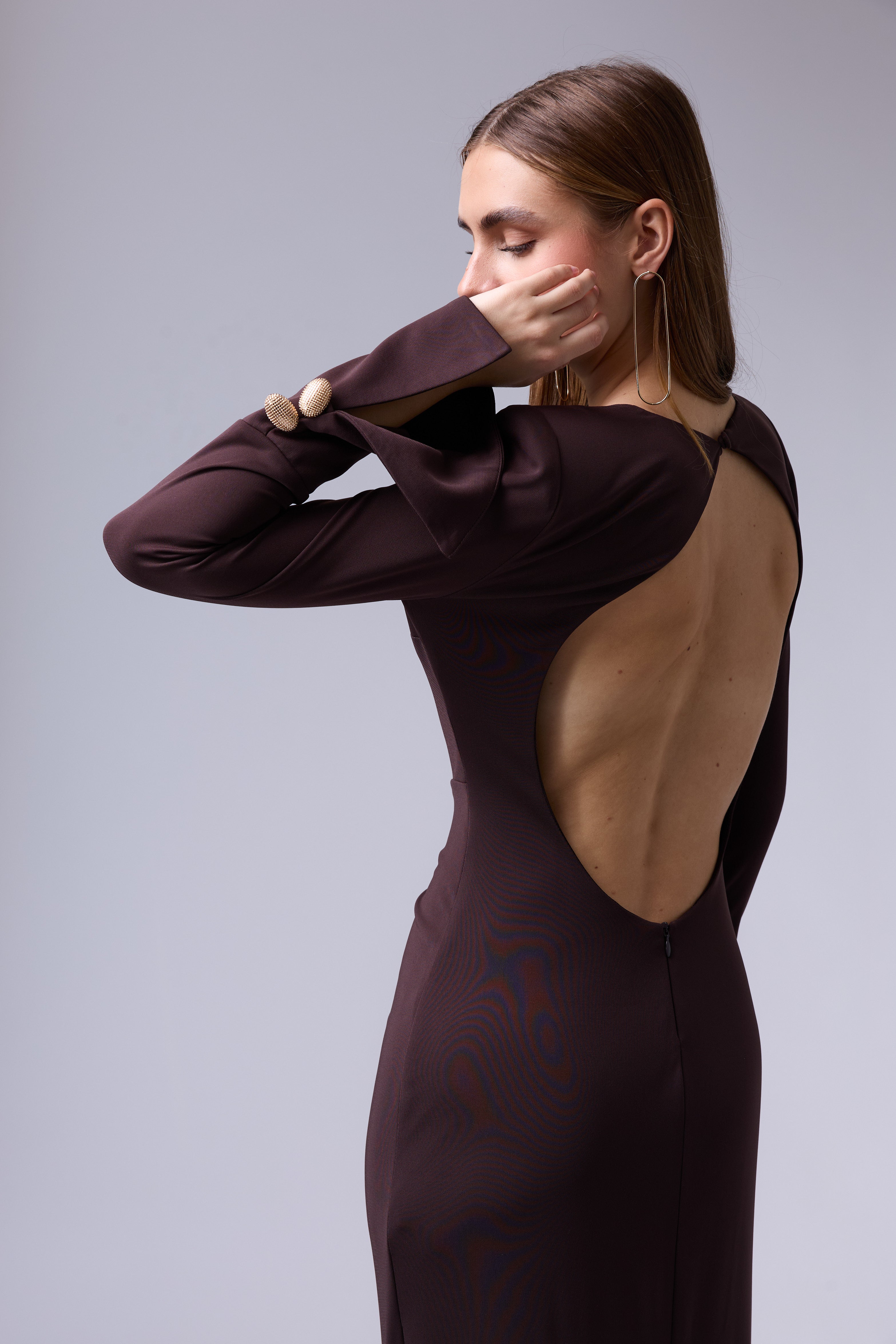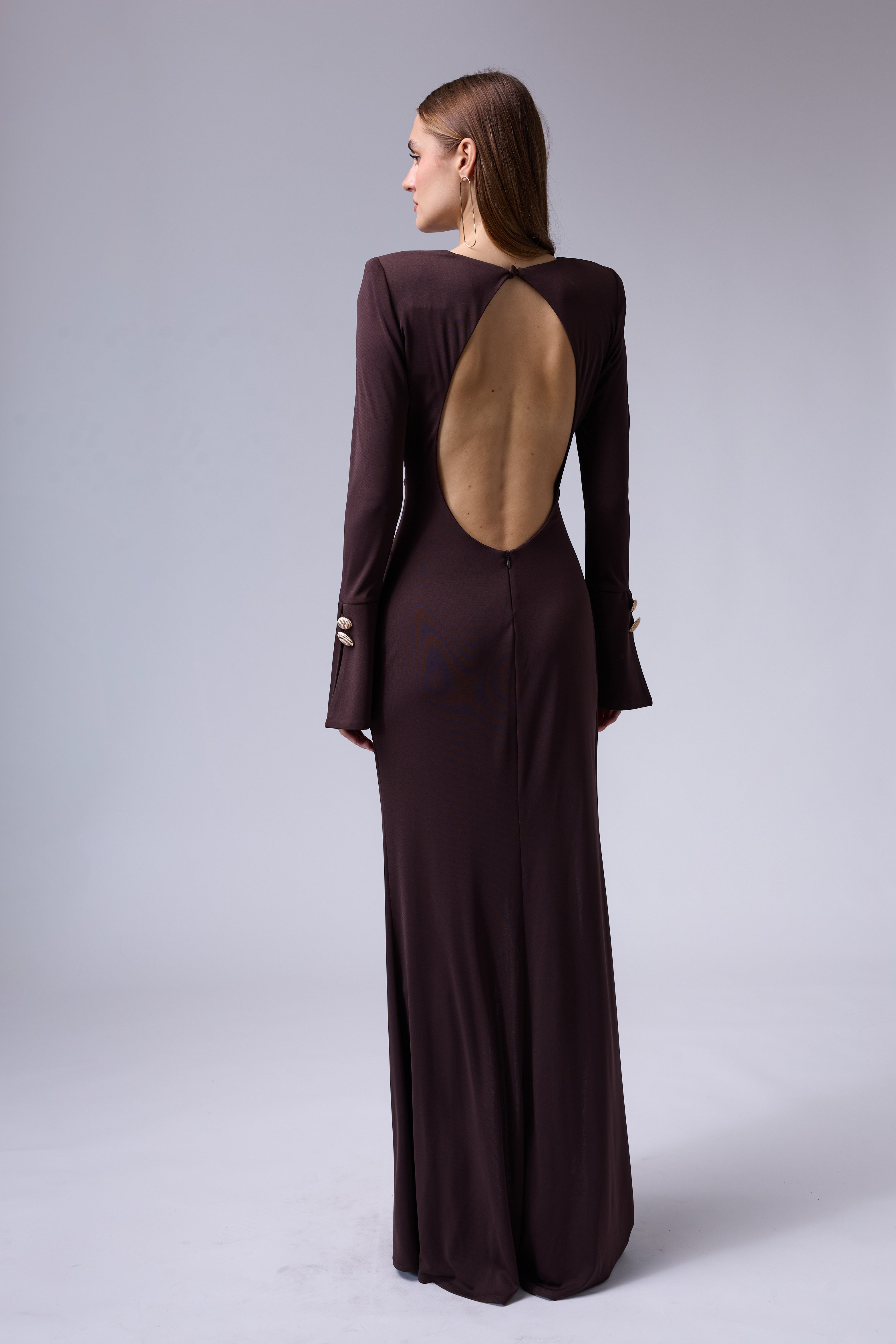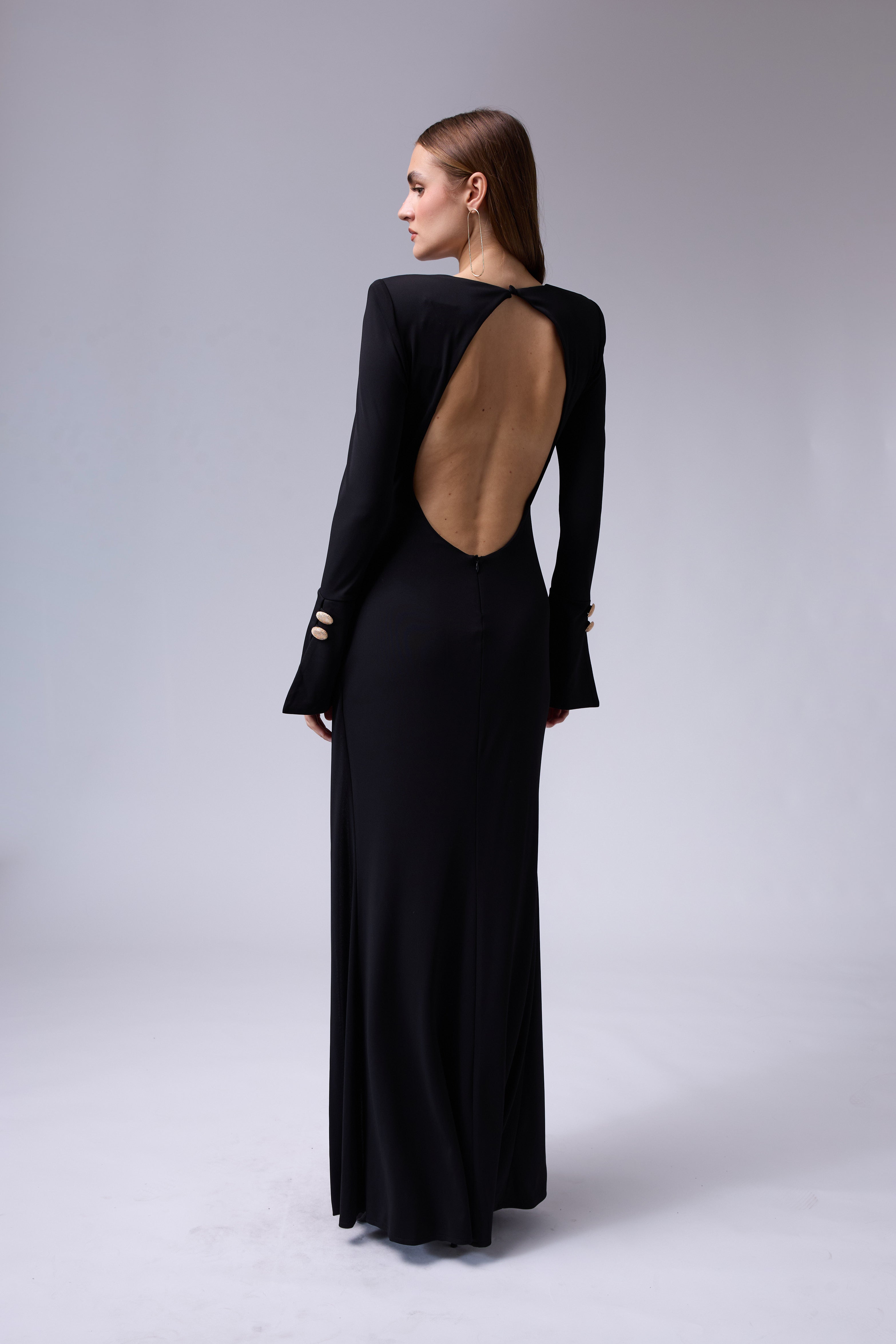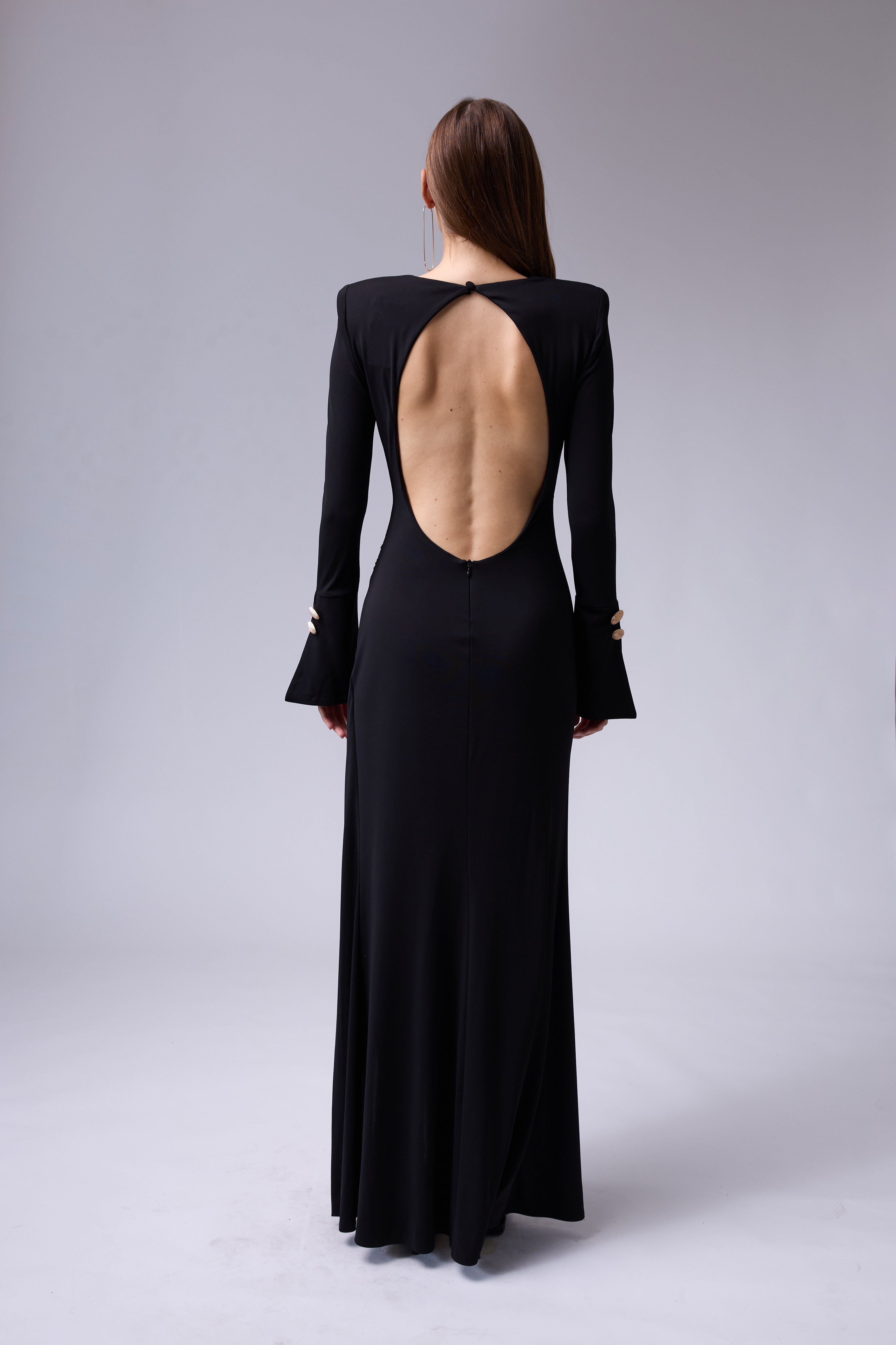 מקסי עם גב פתוח ושרוול עם חפתים מזהב שסע עמוק מקדימה וביטנה שמחטבת