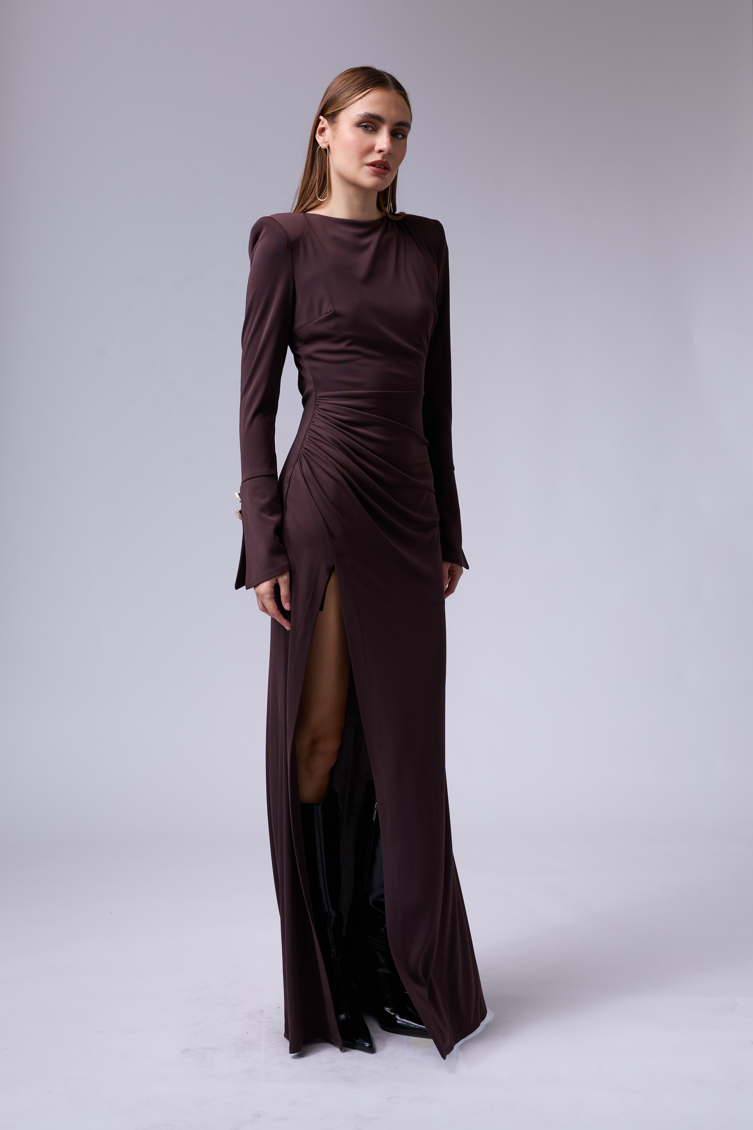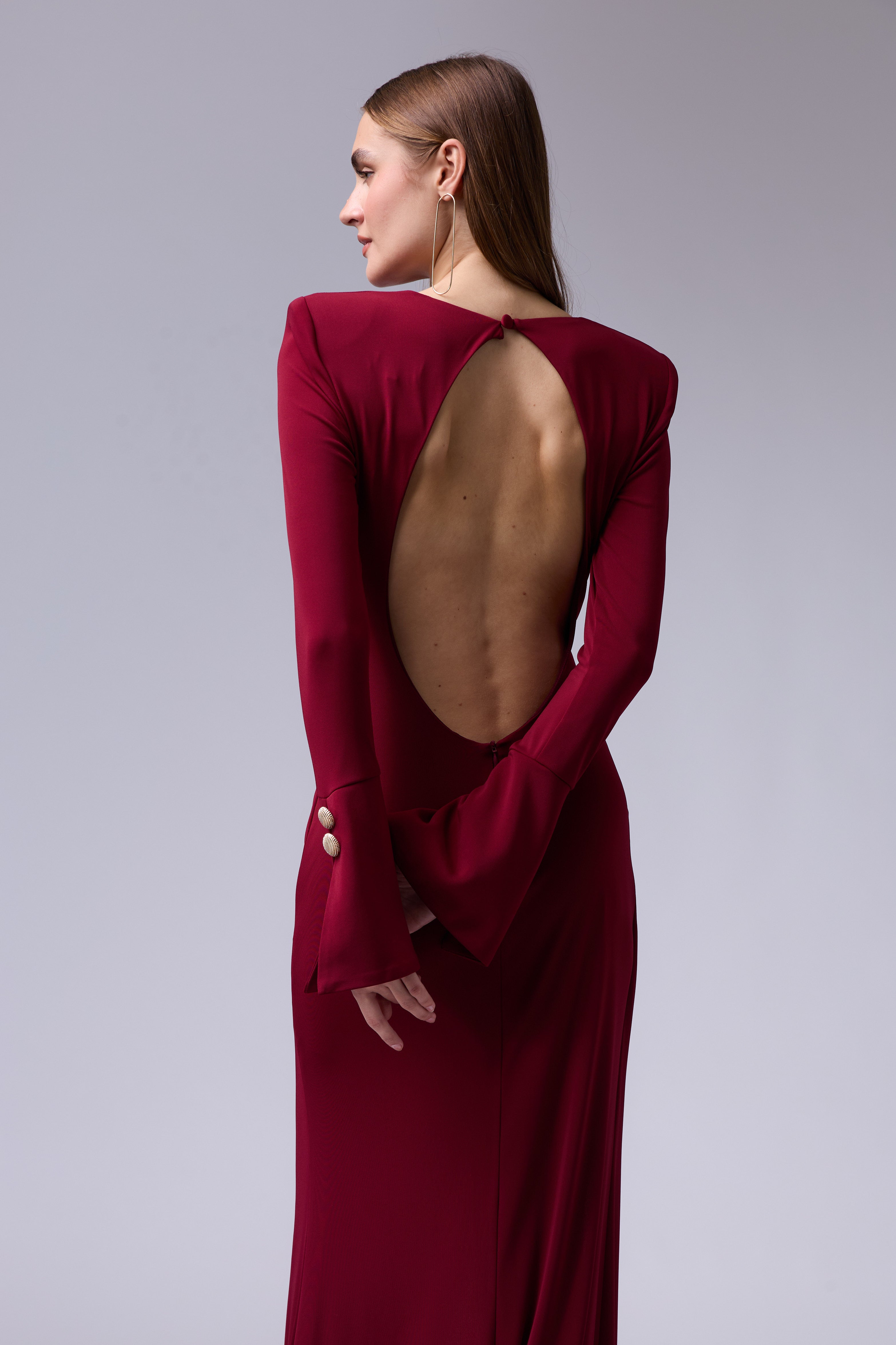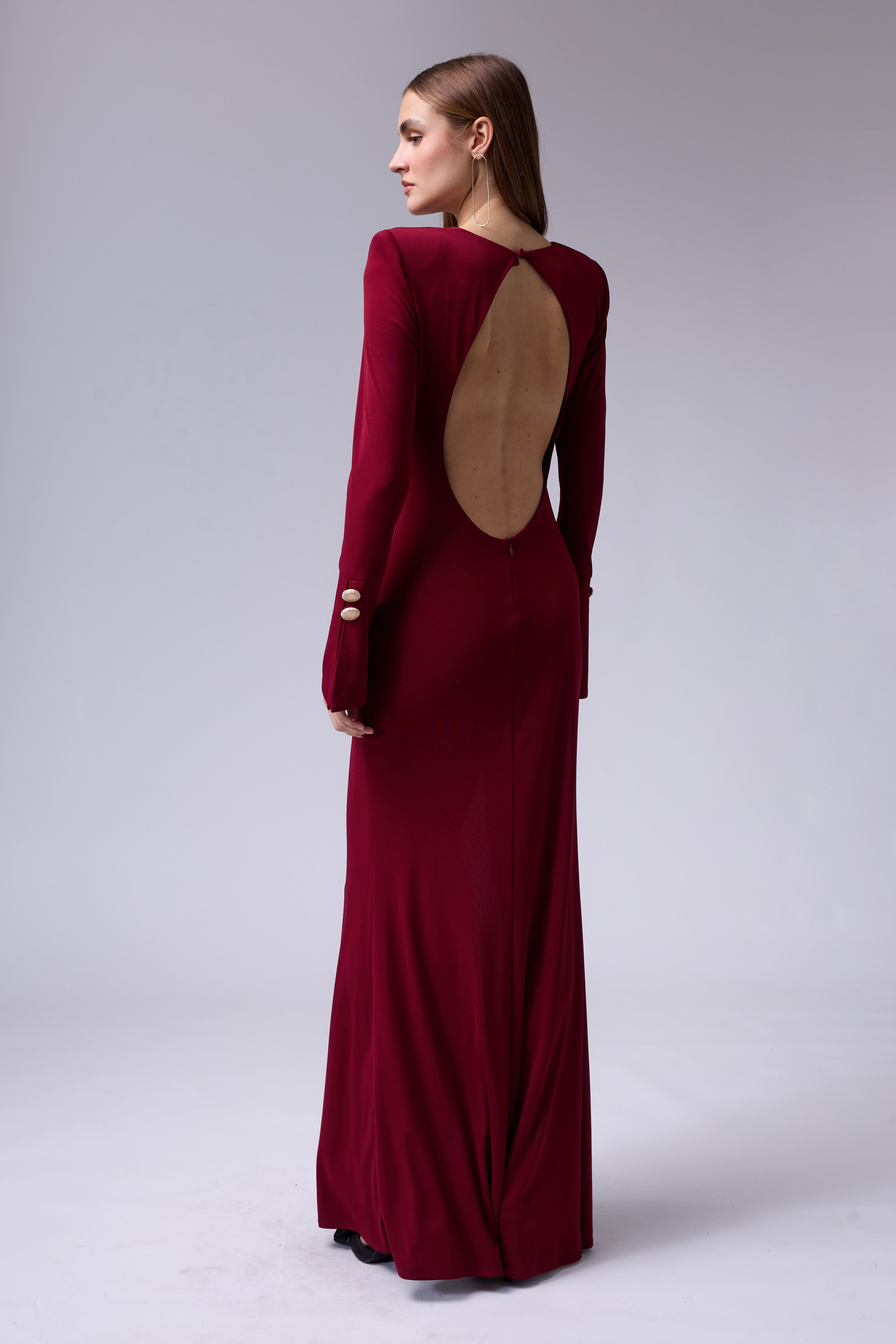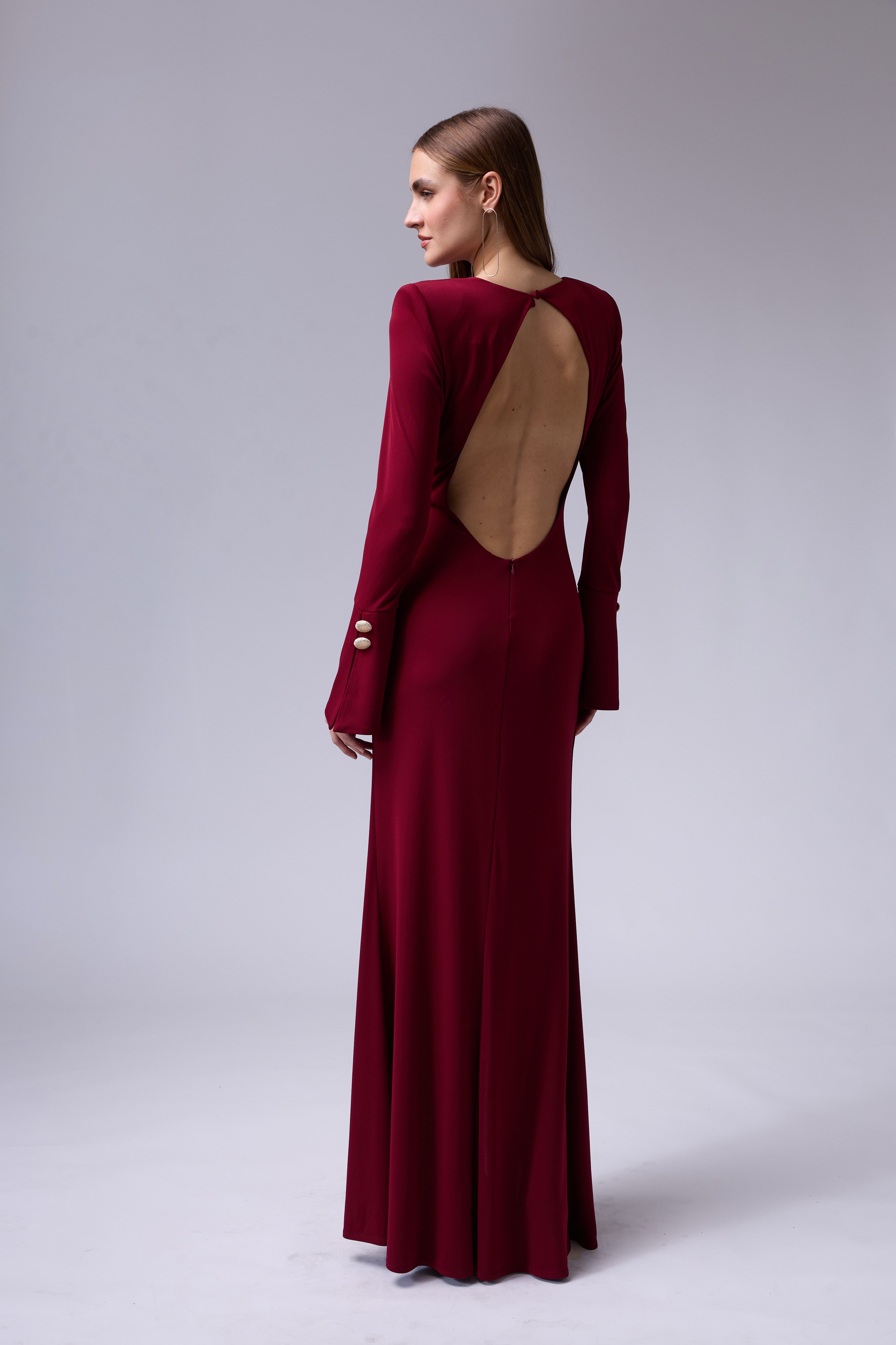 מקסי עם גב פתוח ושרוול עם חפתים מזהב שסע עמוק מקדימה וביטנה שמחטבת