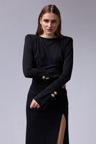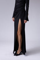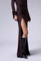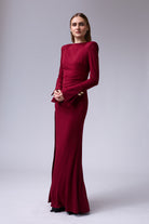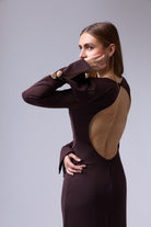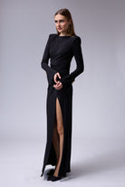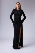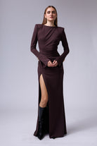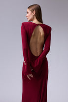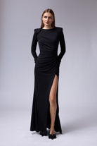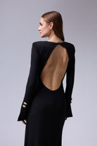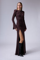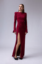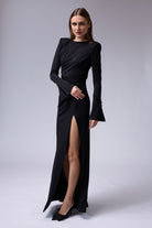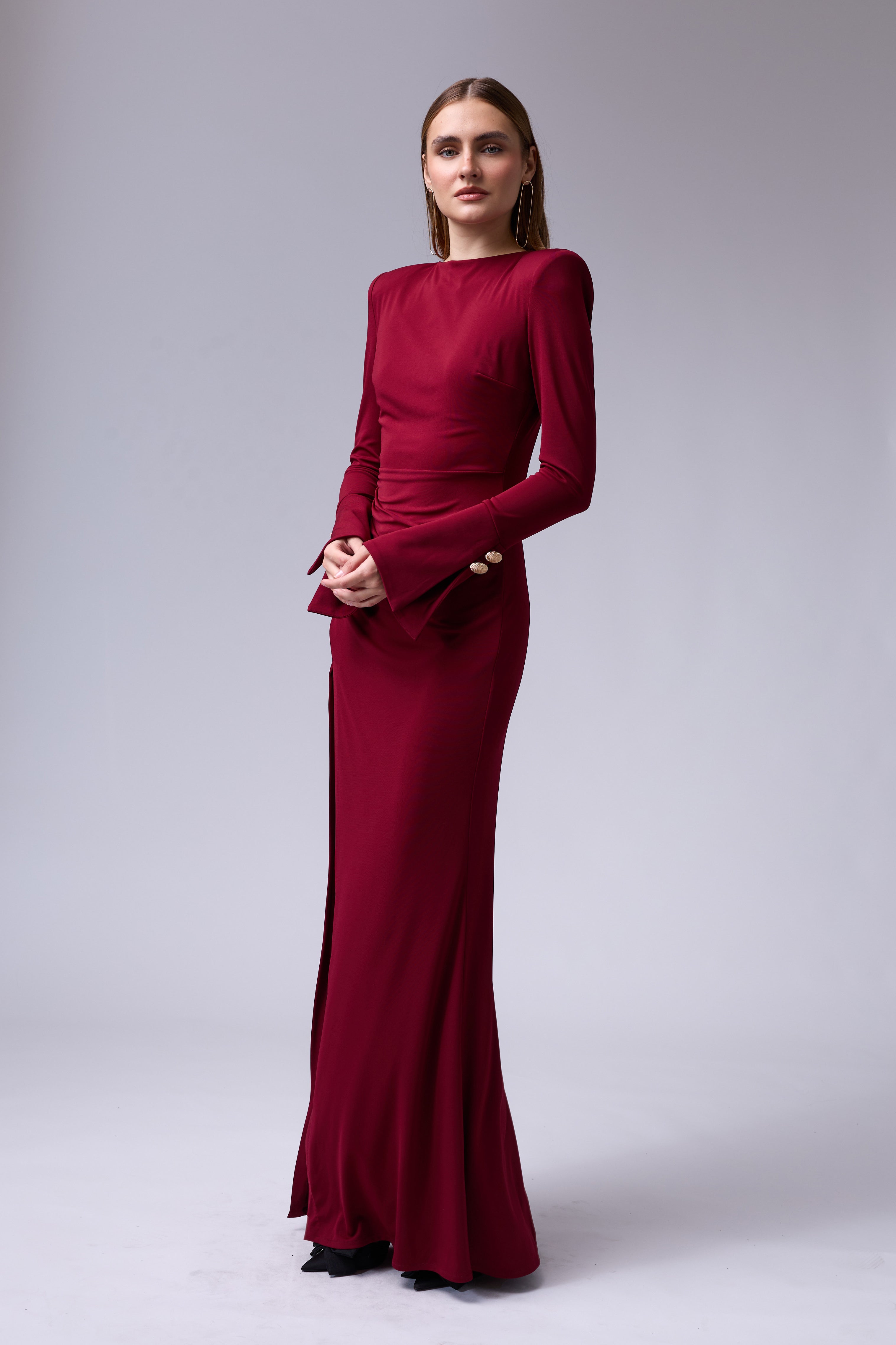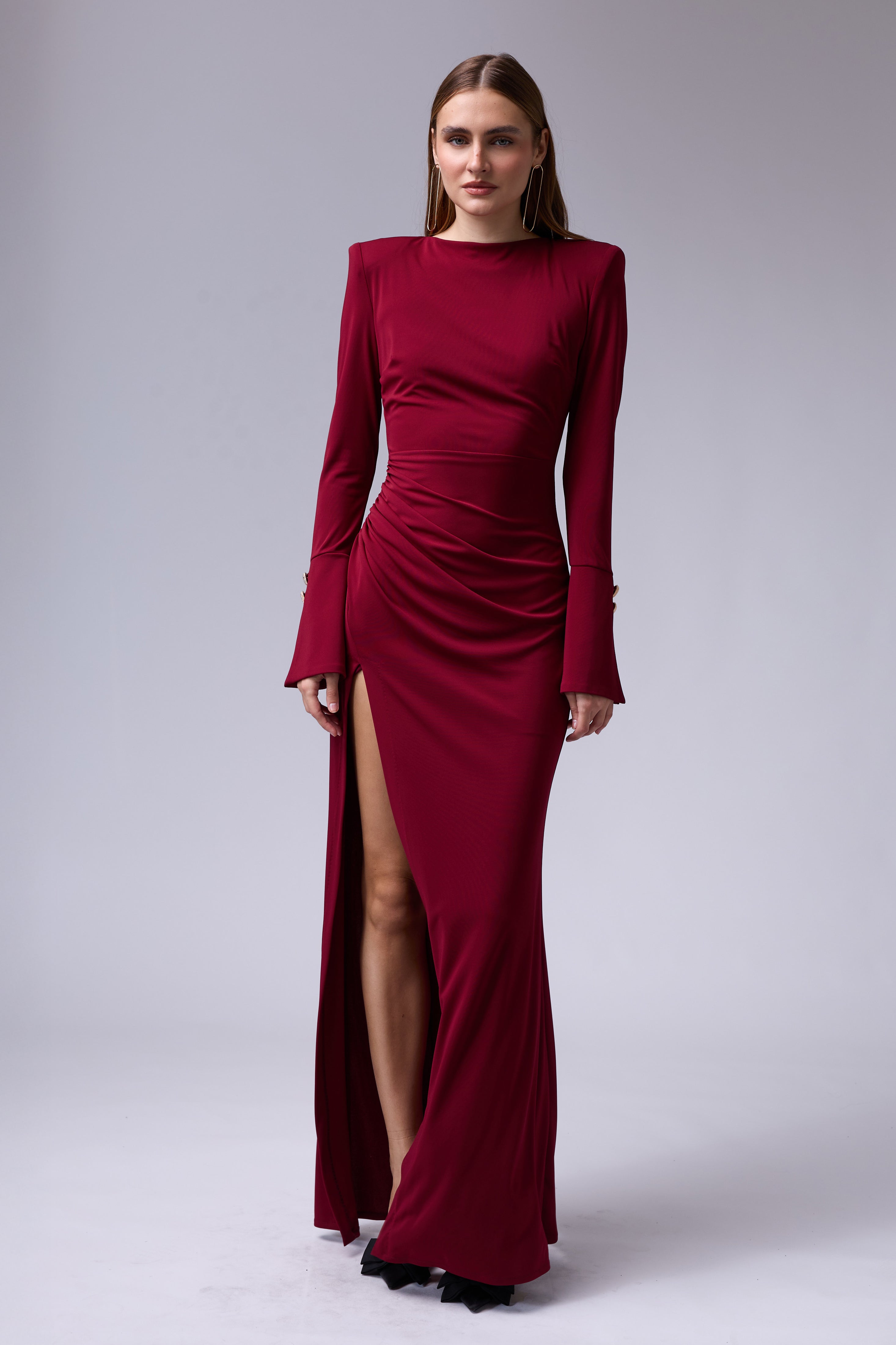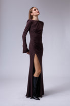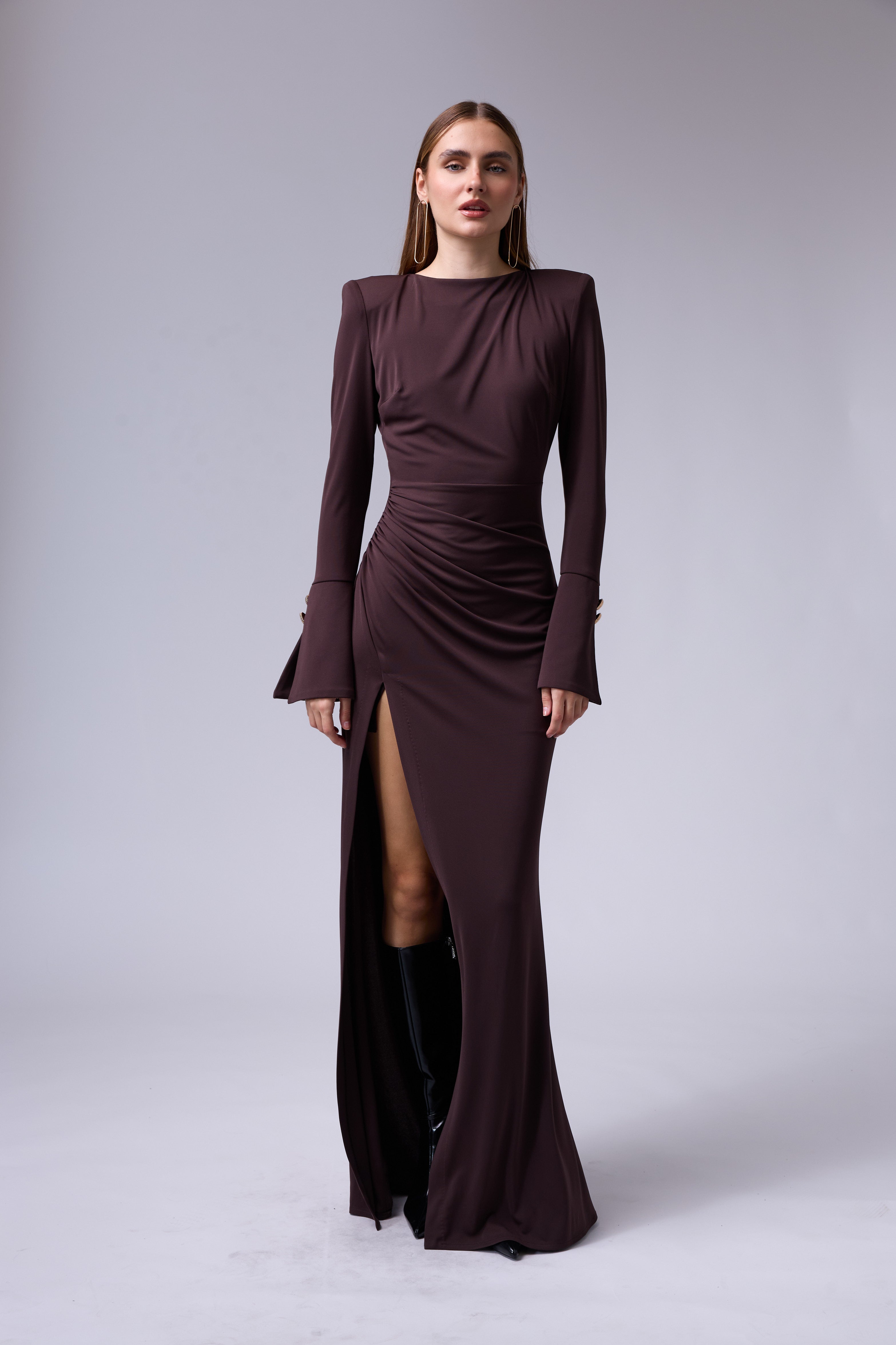 מקסי עם גב פתוח ושרוול עם חפתים מזהב שסע עמוק מקדימה וביטנה שמחטבת