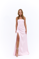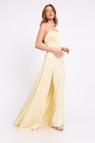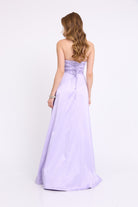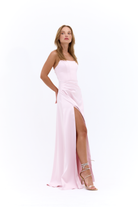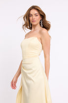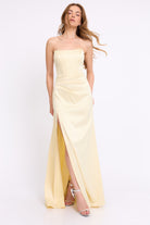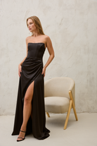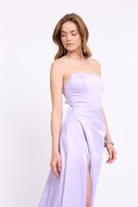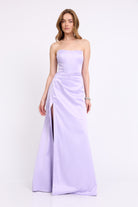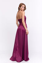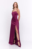 שמלה מקסי סטרפלס בגזרה מחוך מחטב ומחמיא למראה יוקרתי ועשיר, כיווצים במותן ושסע בצד הרגל מבד סאטן עבה ואיכותי