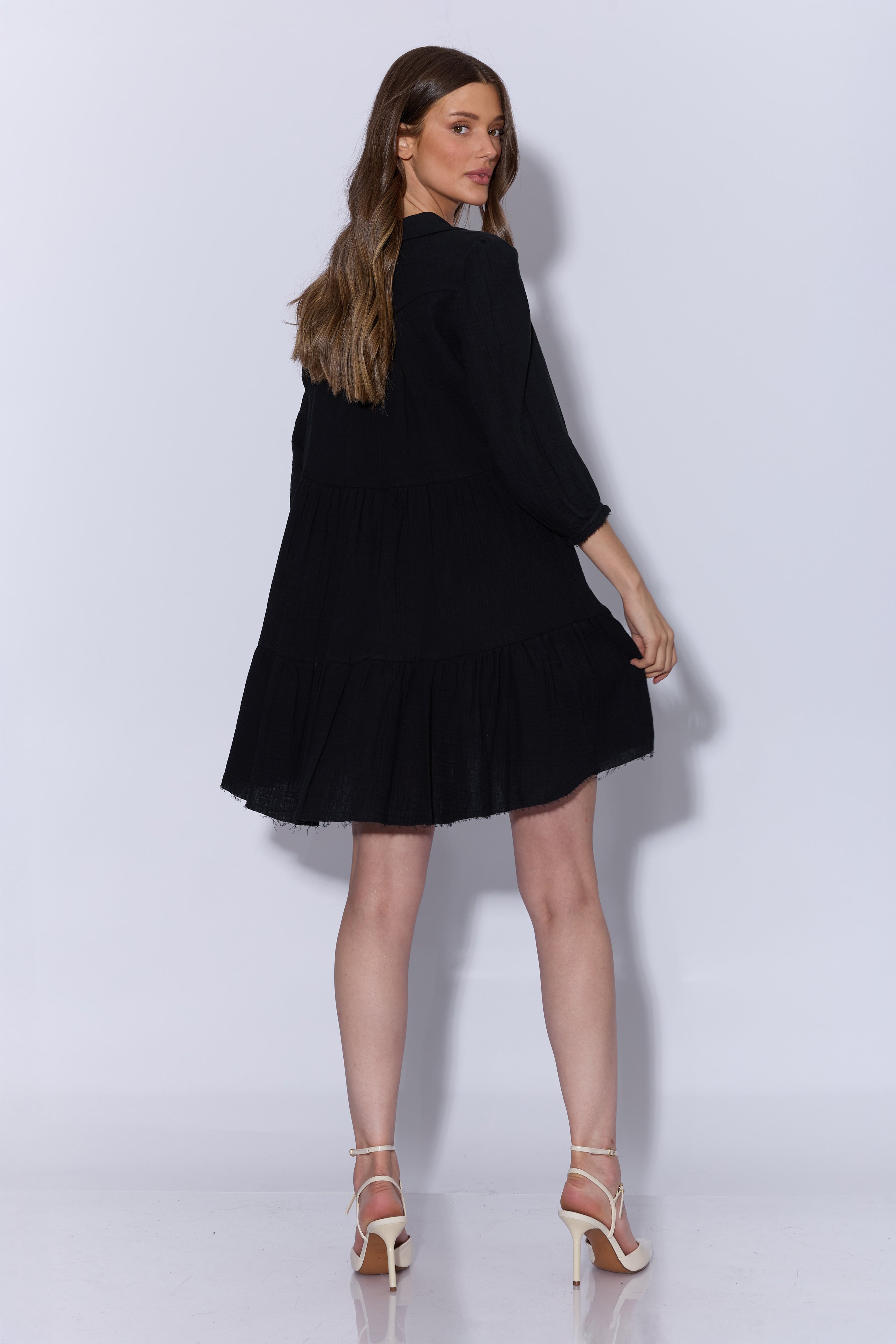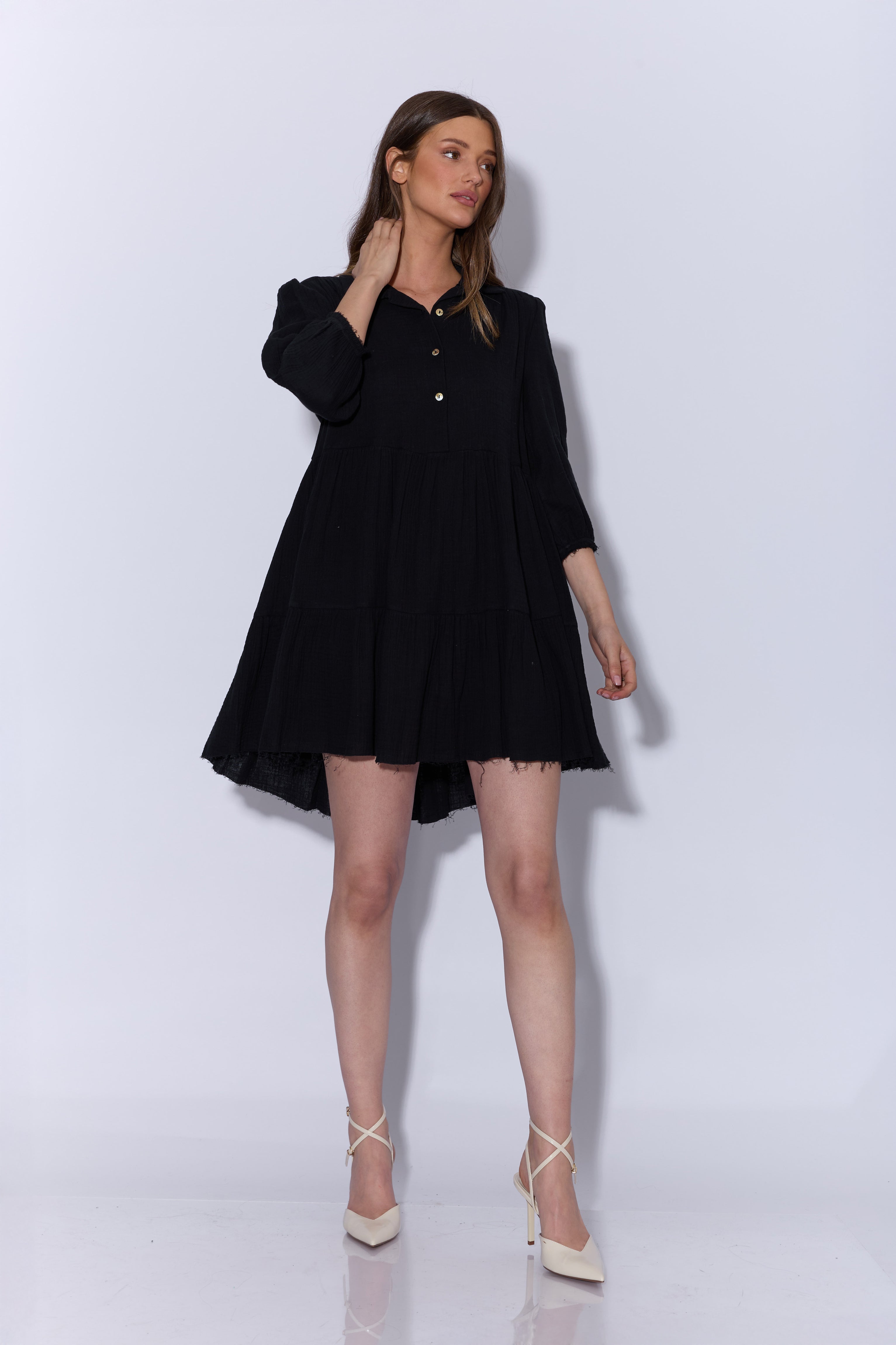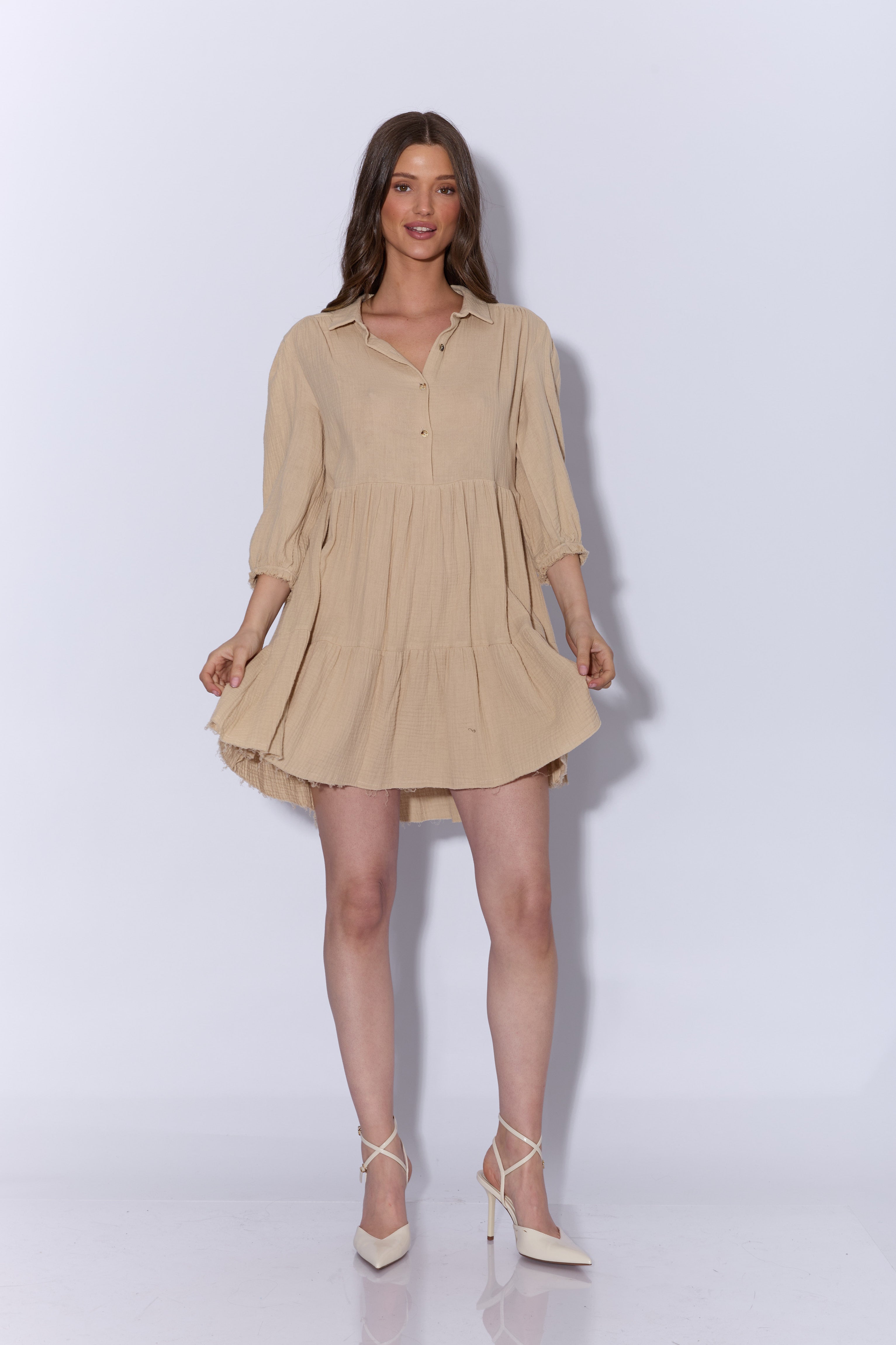 שמלה בגזרה רחבה עם שרוול 3/4 מכופתרת עד המותן מבד חיתול דק ונעים