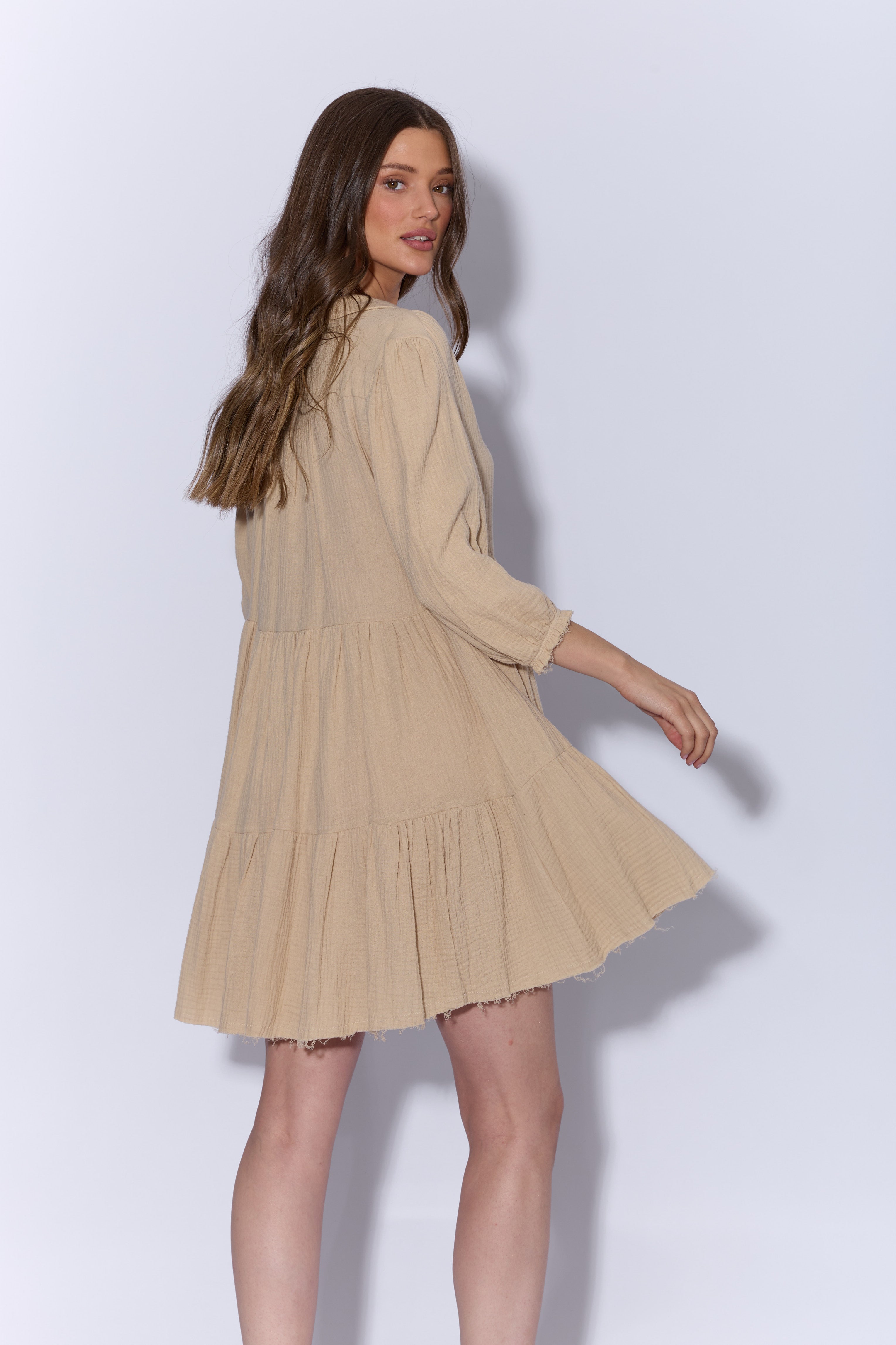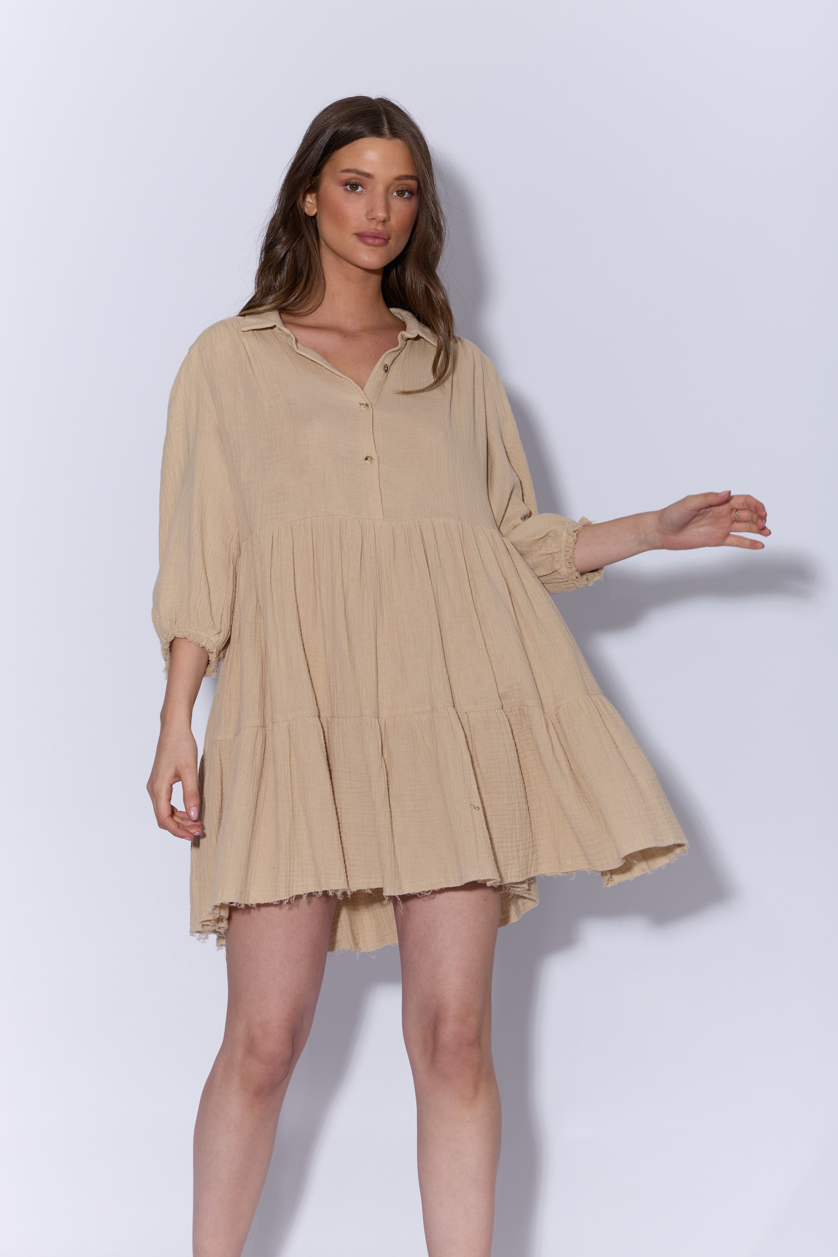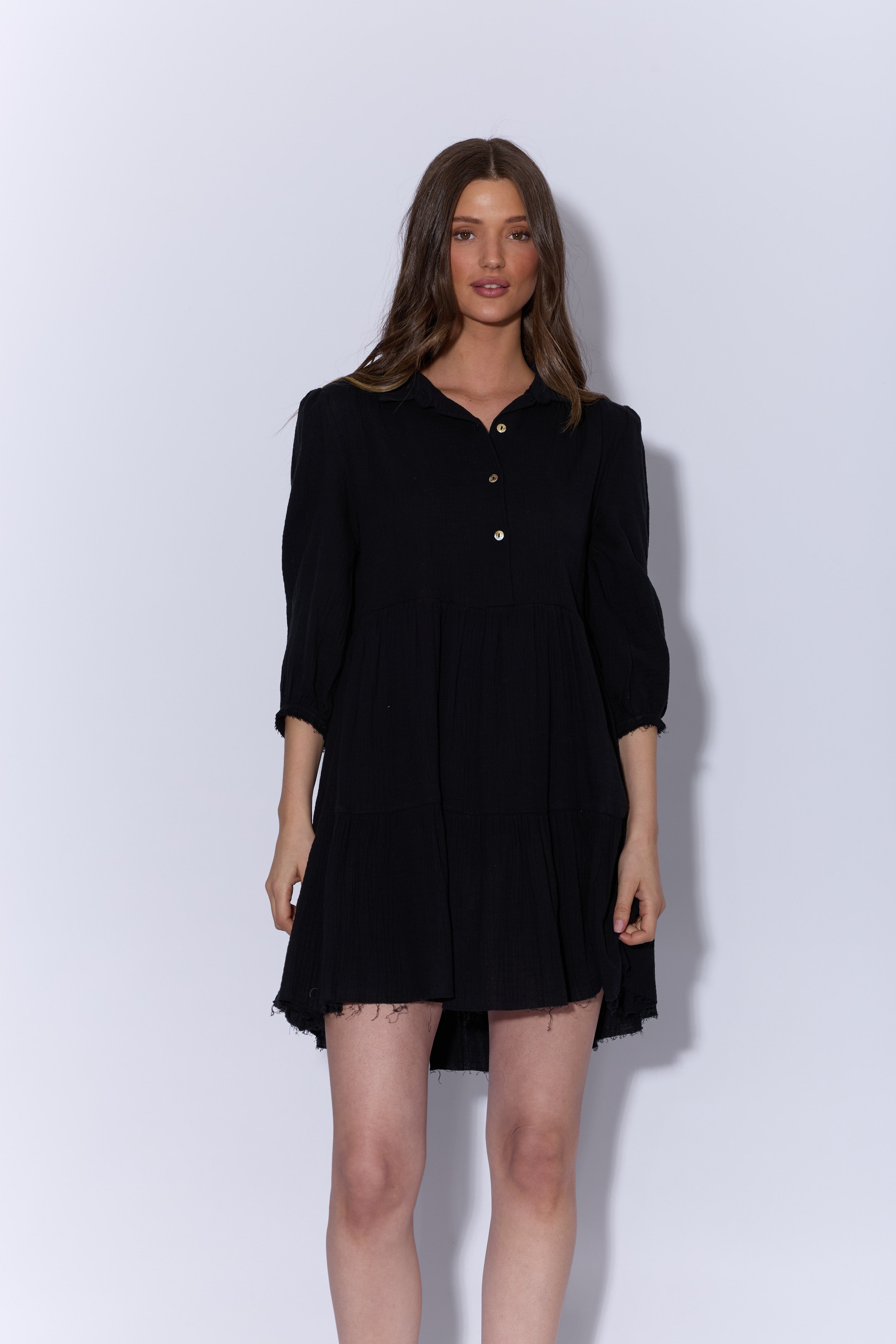 שמלה בגזרה רחבה עם שרוול 3/4 מכופתרת עד המותן מבד חיתול דק ונעים