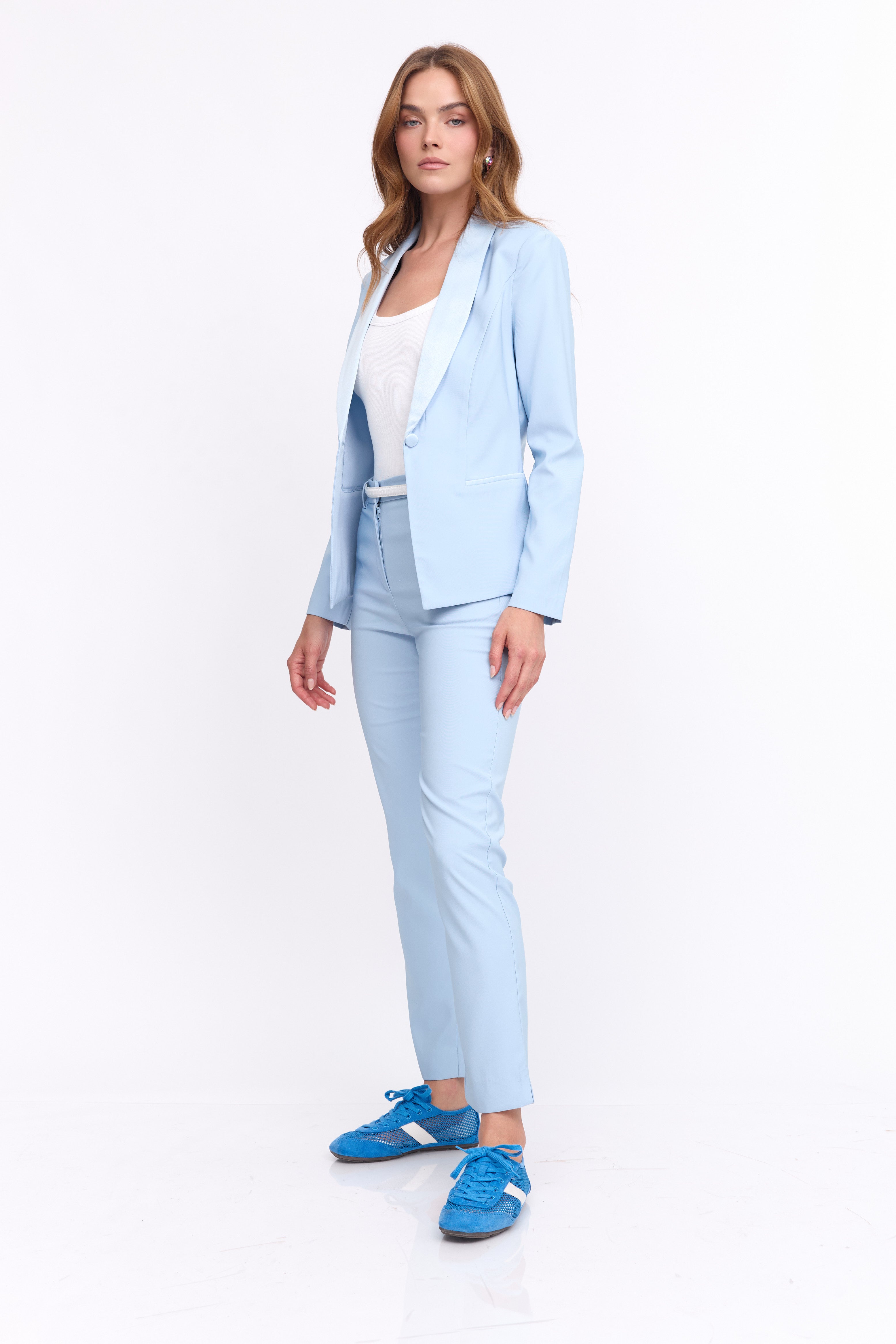 חליפה שני חלקים  מחויטת,  ג'קט עם צווארון מבד סאטן  ,מכנסיים בגזרת ישרה עם כיסים בצדדים