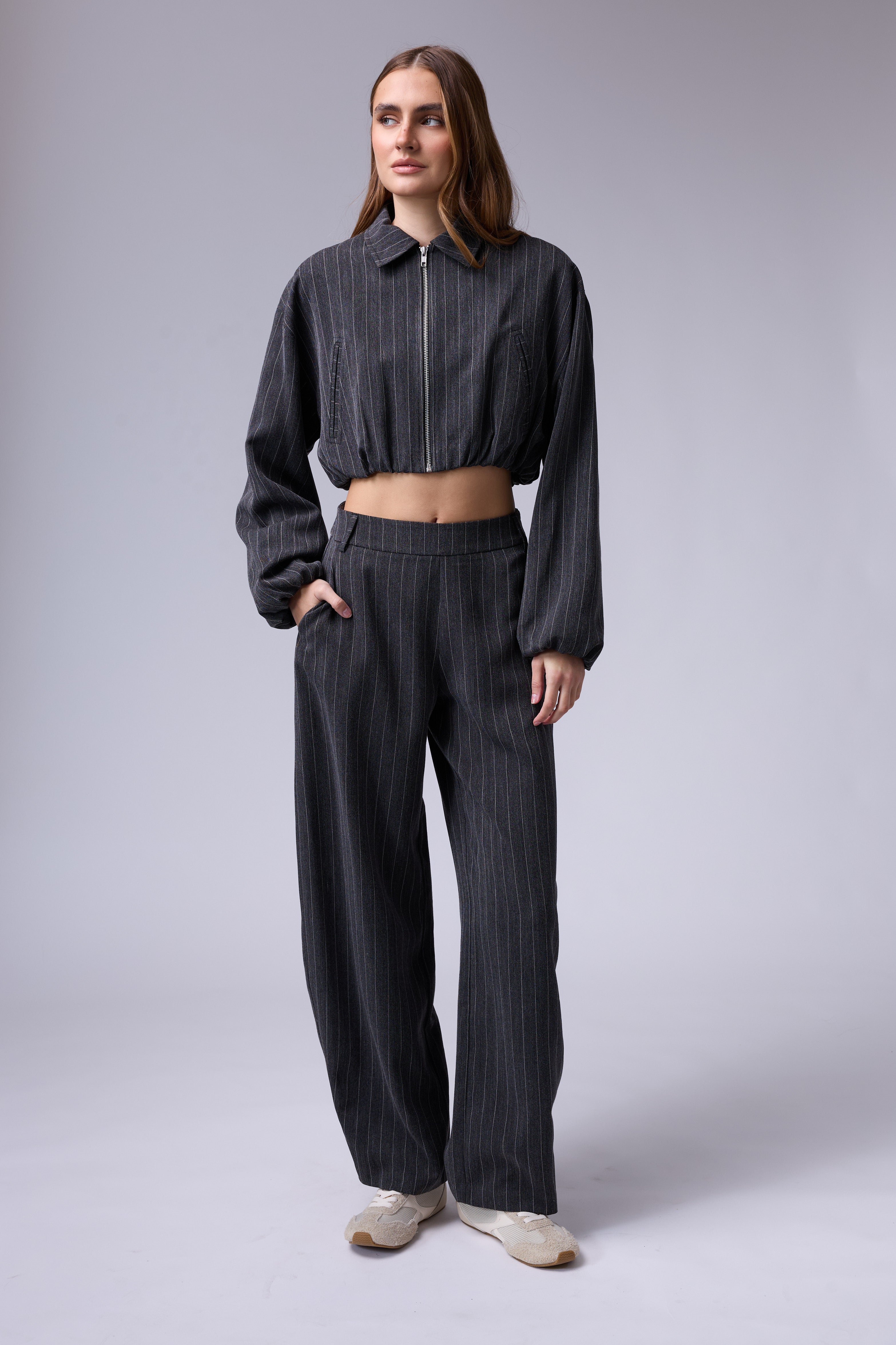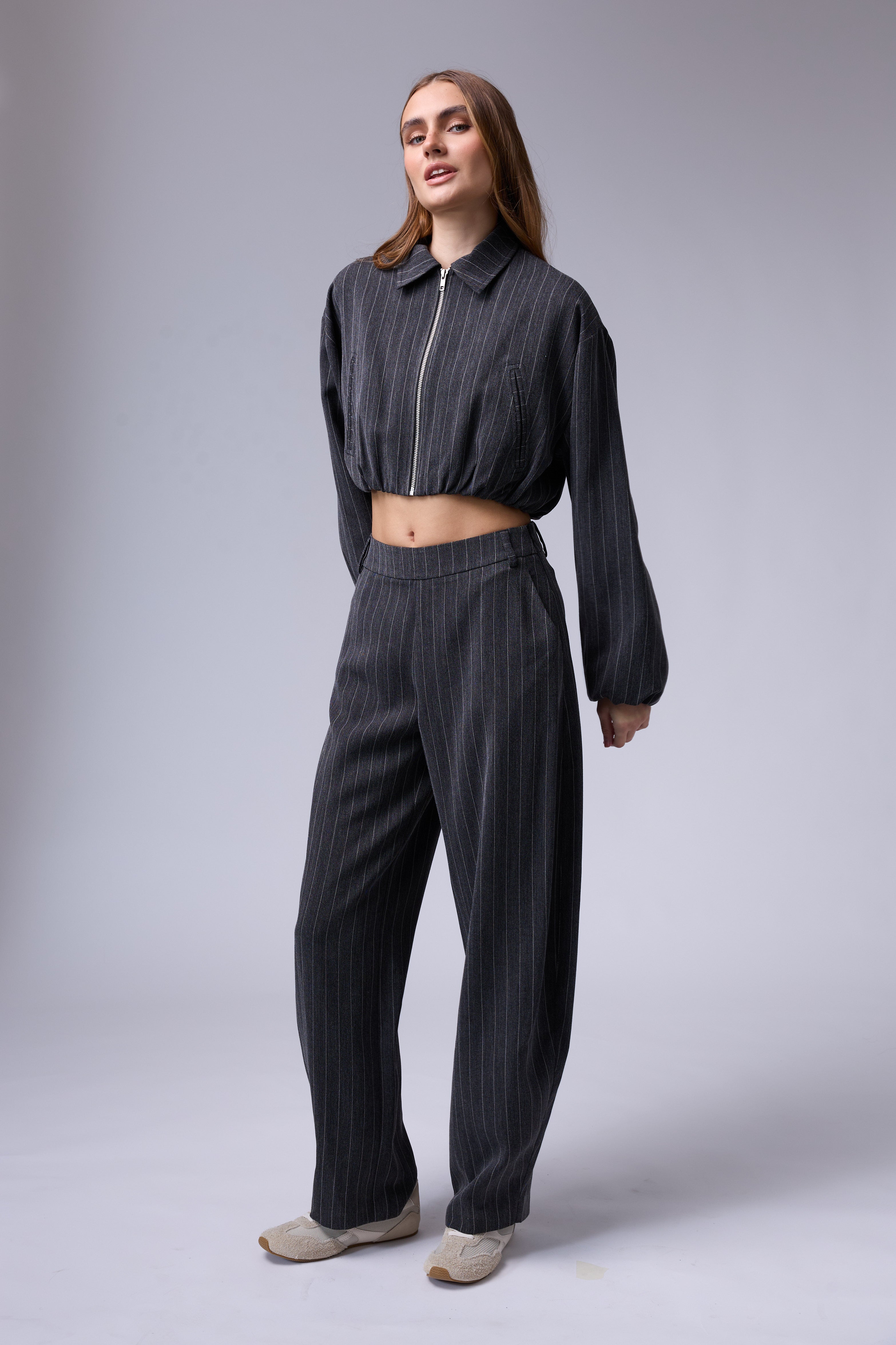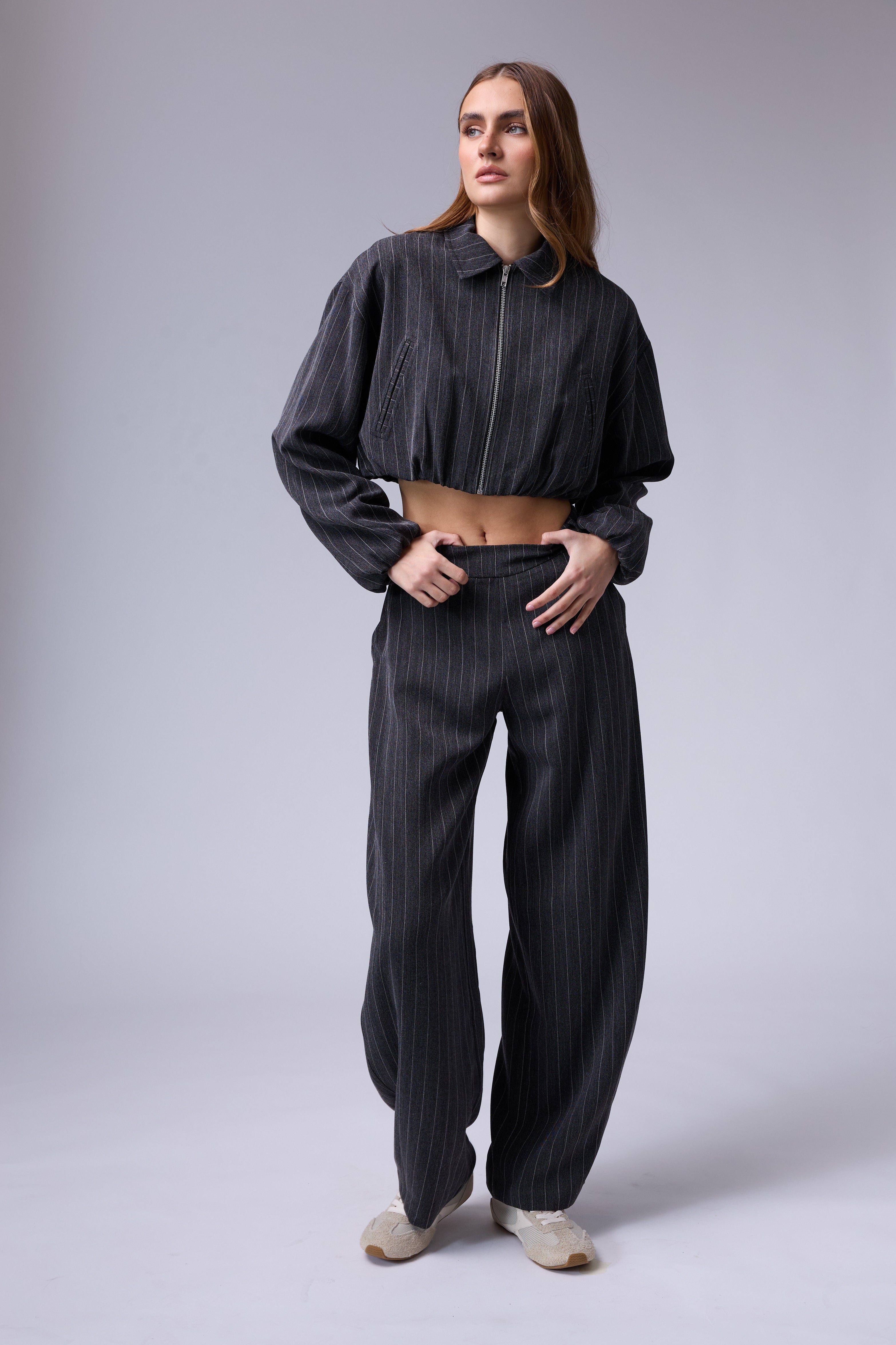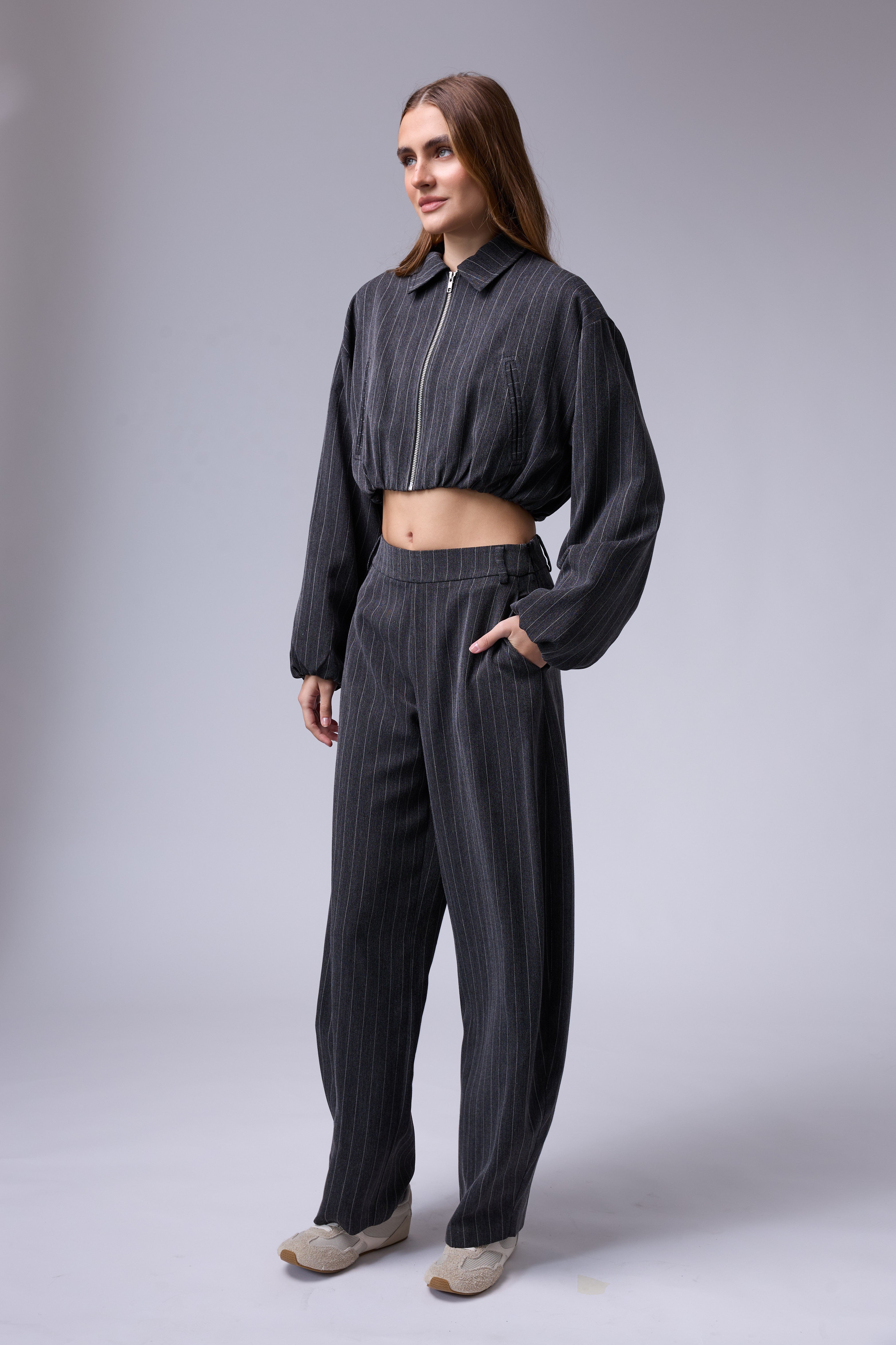 חליפת פסים מכנס בלון עם רוכסן בצד וג'קט עם רוכסן ושרוולים גדולים עם גימור של גומי בסיום