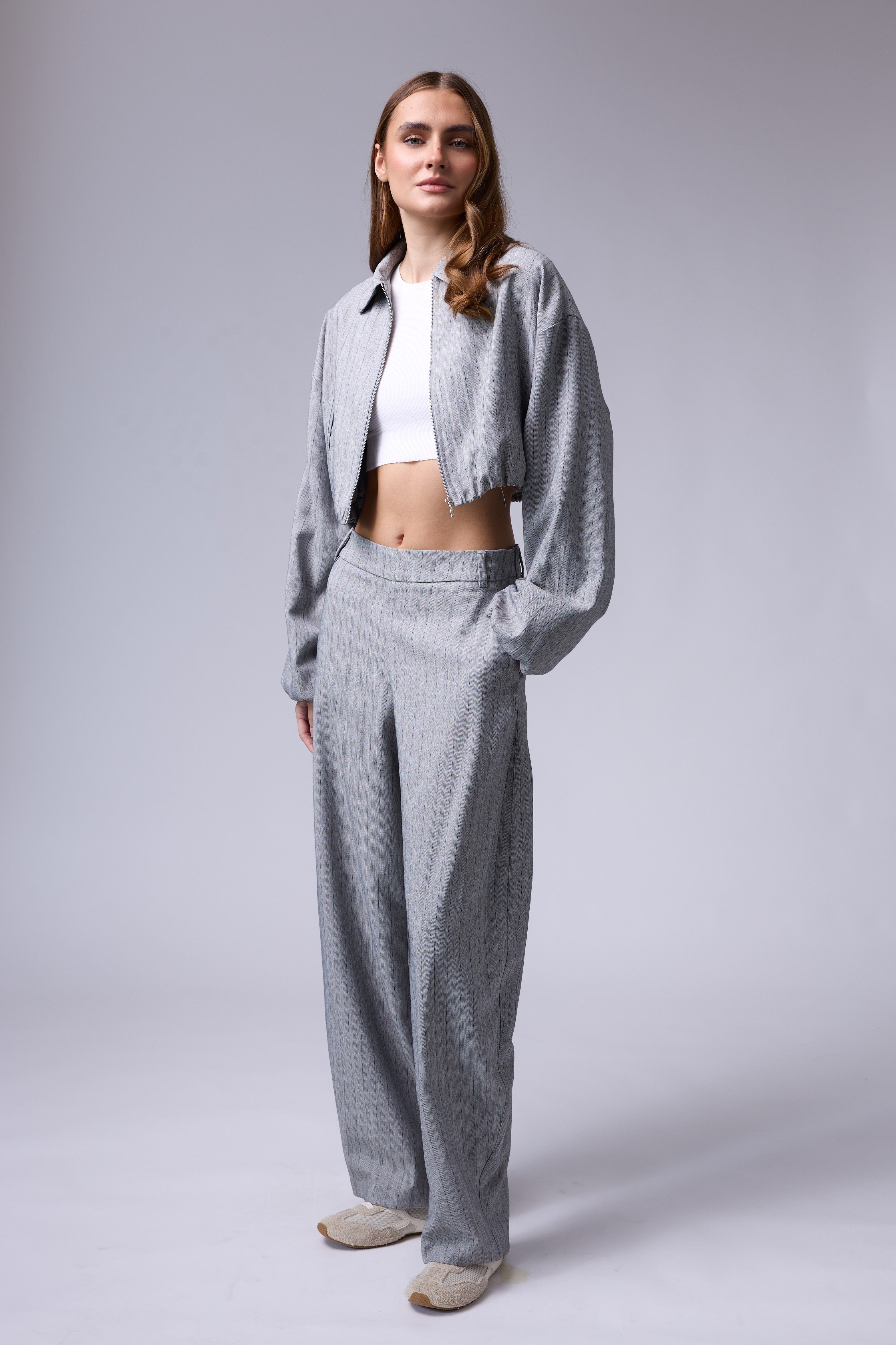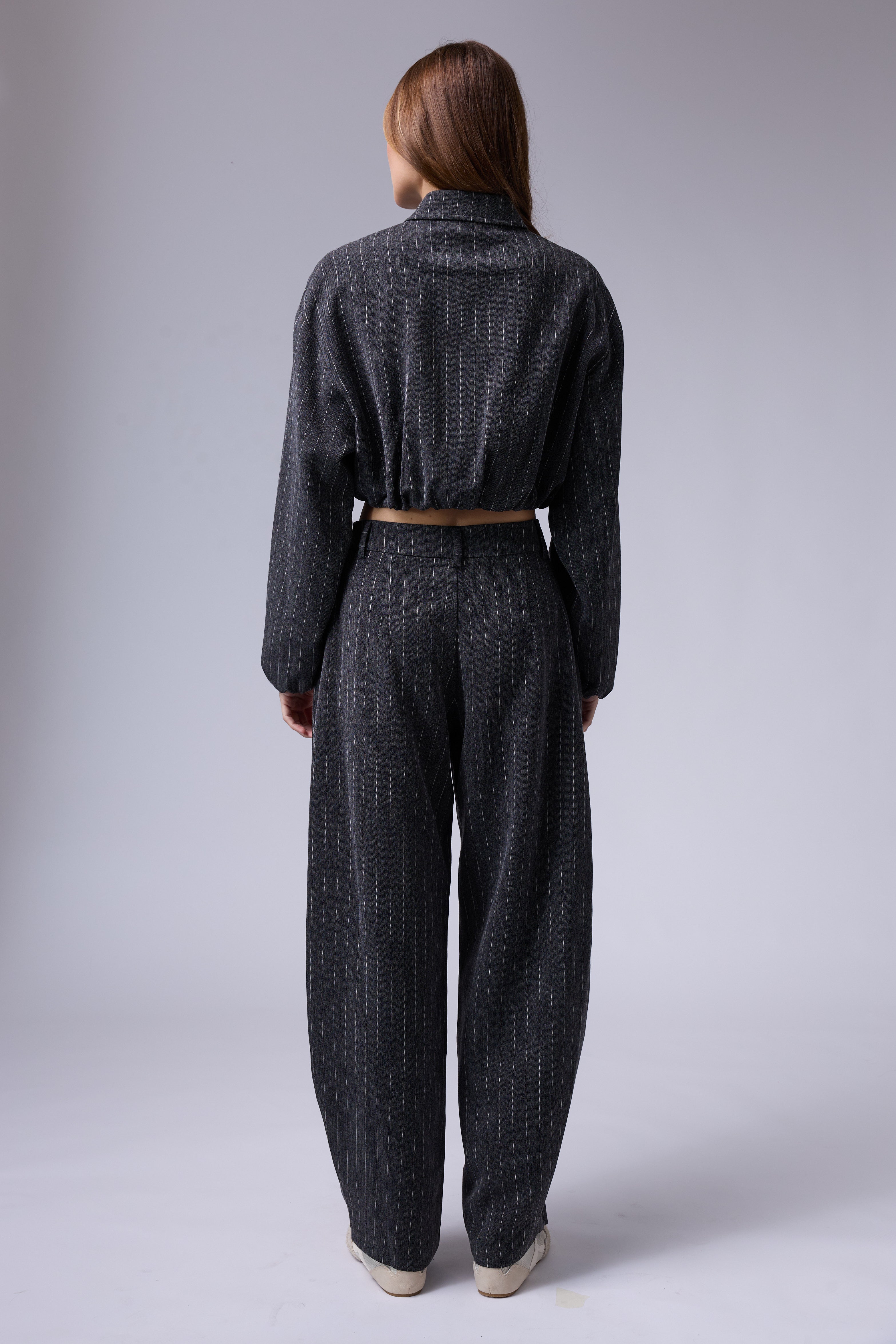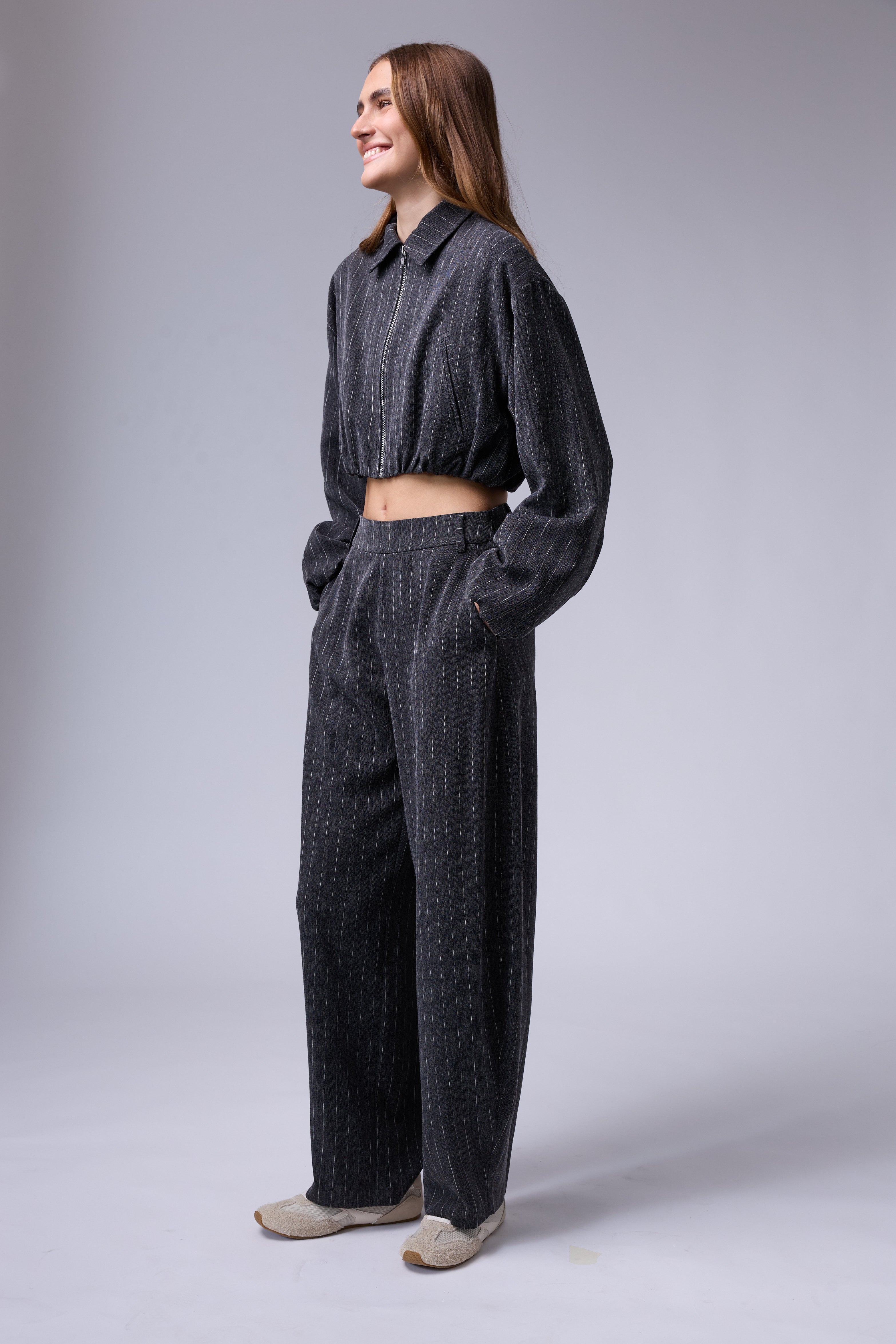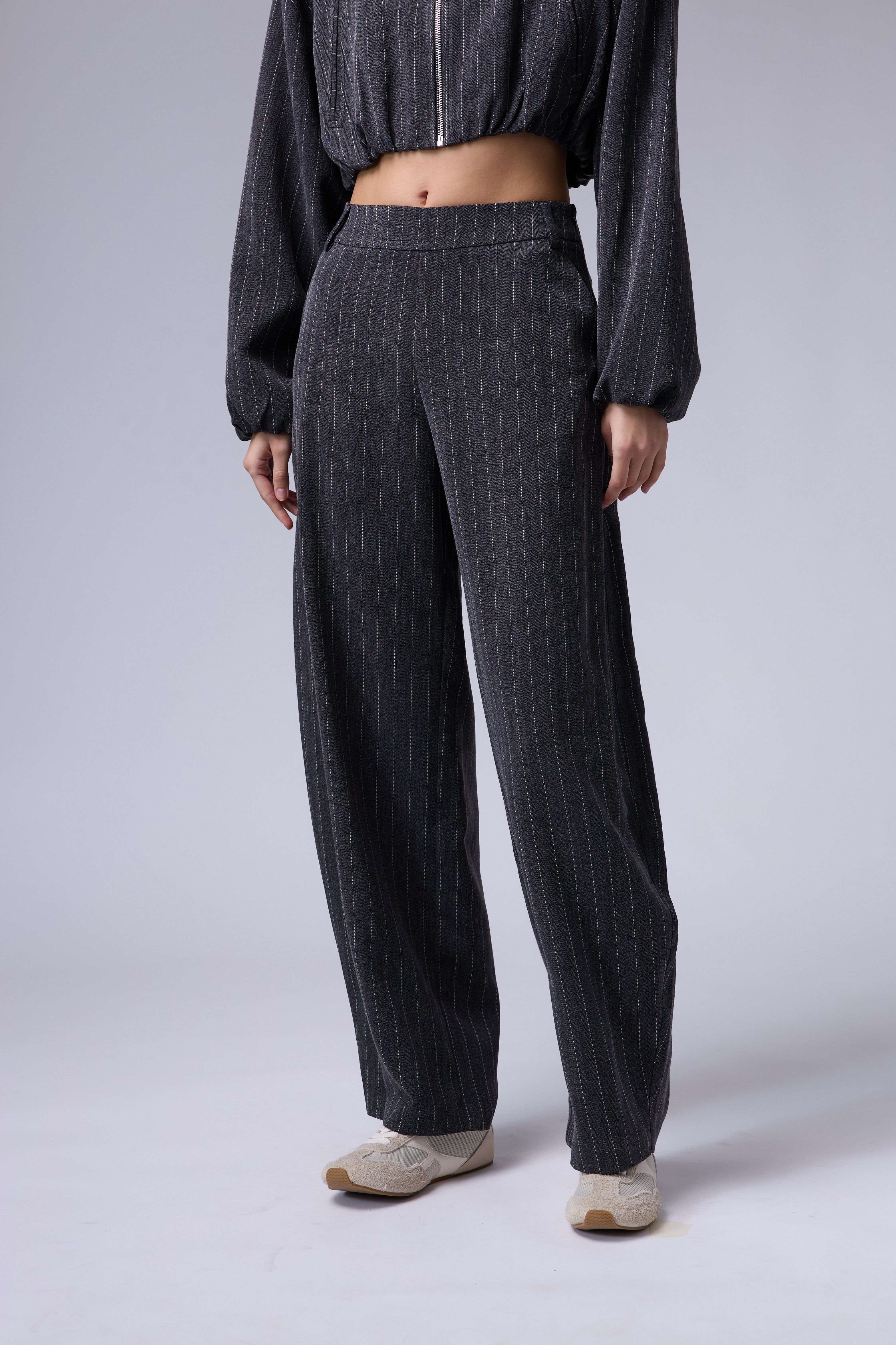 חליפת פסים מכנס בלון עם רוכסן בצד וג'קט עם רוכסן ושרוולים גדולים עם גימור של גומי בסיום