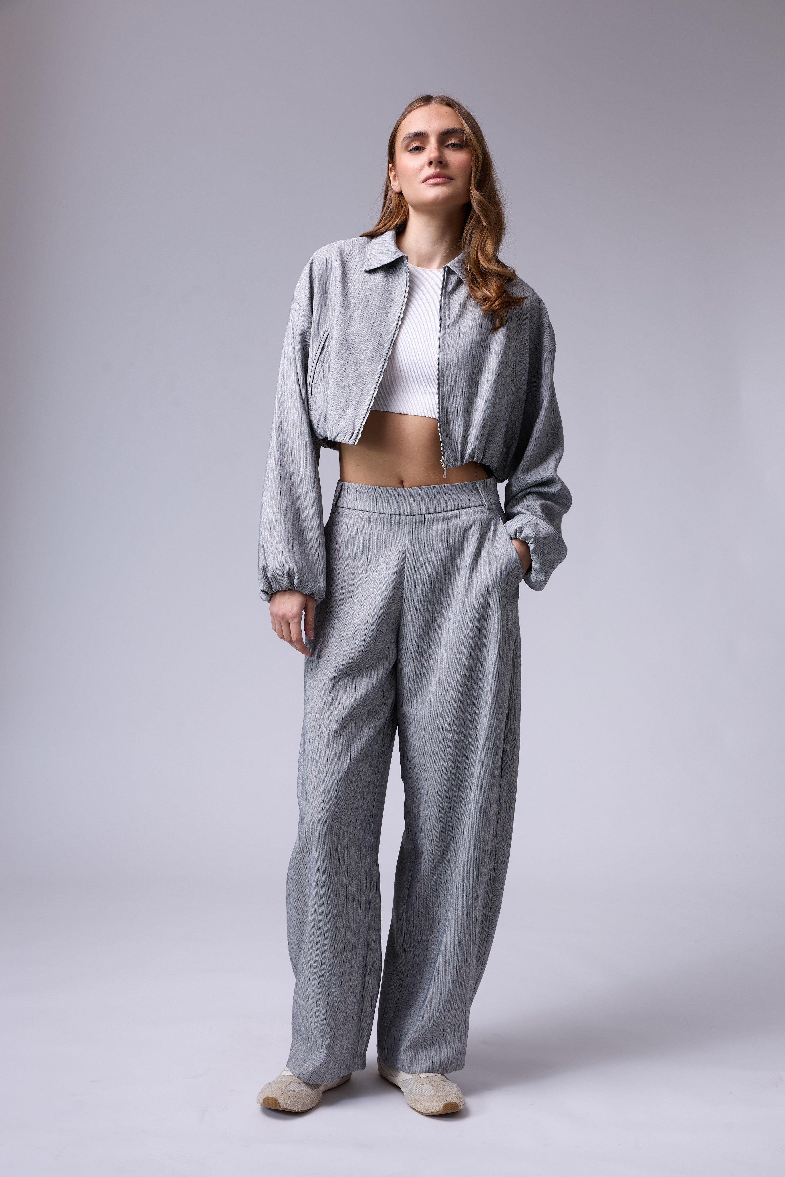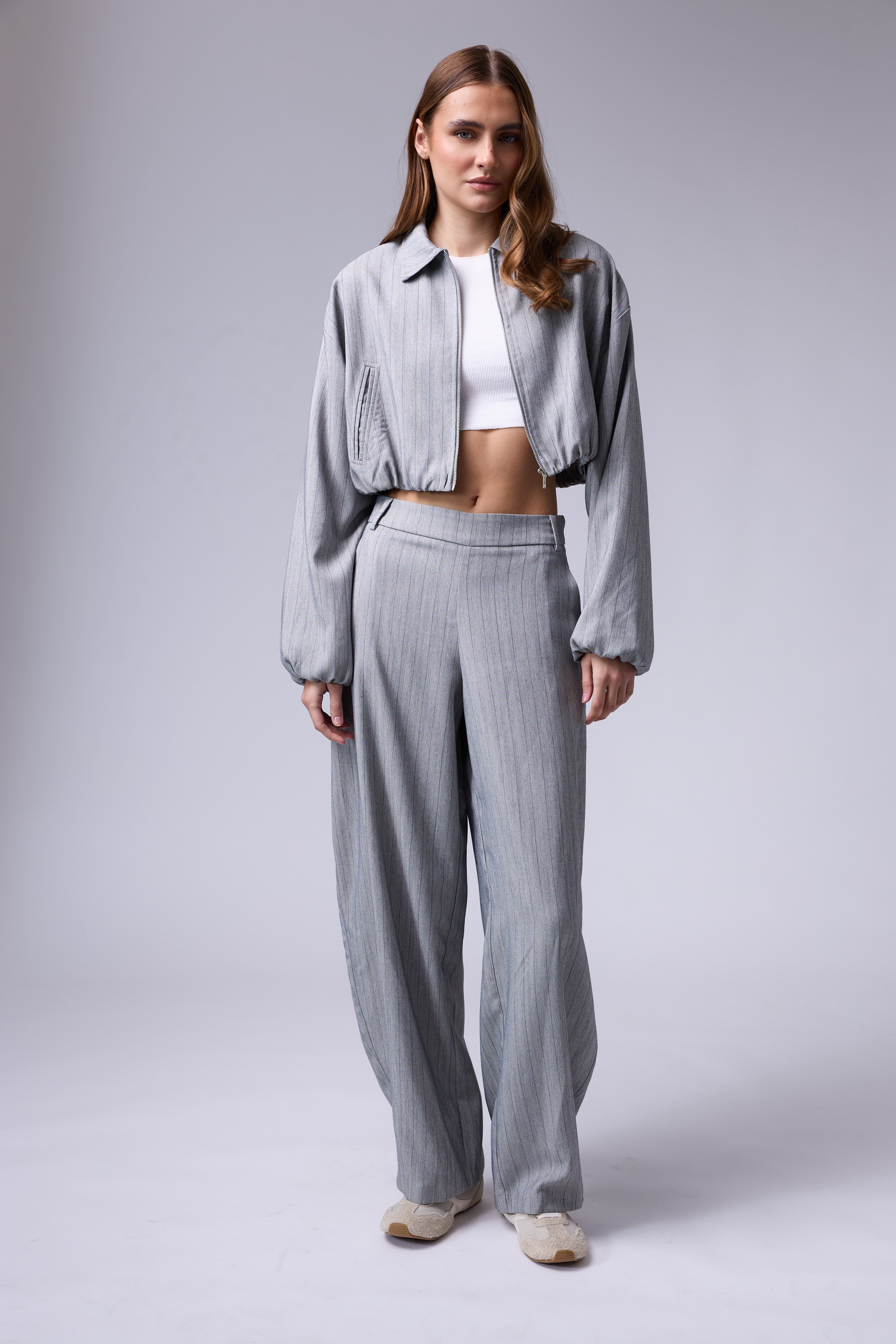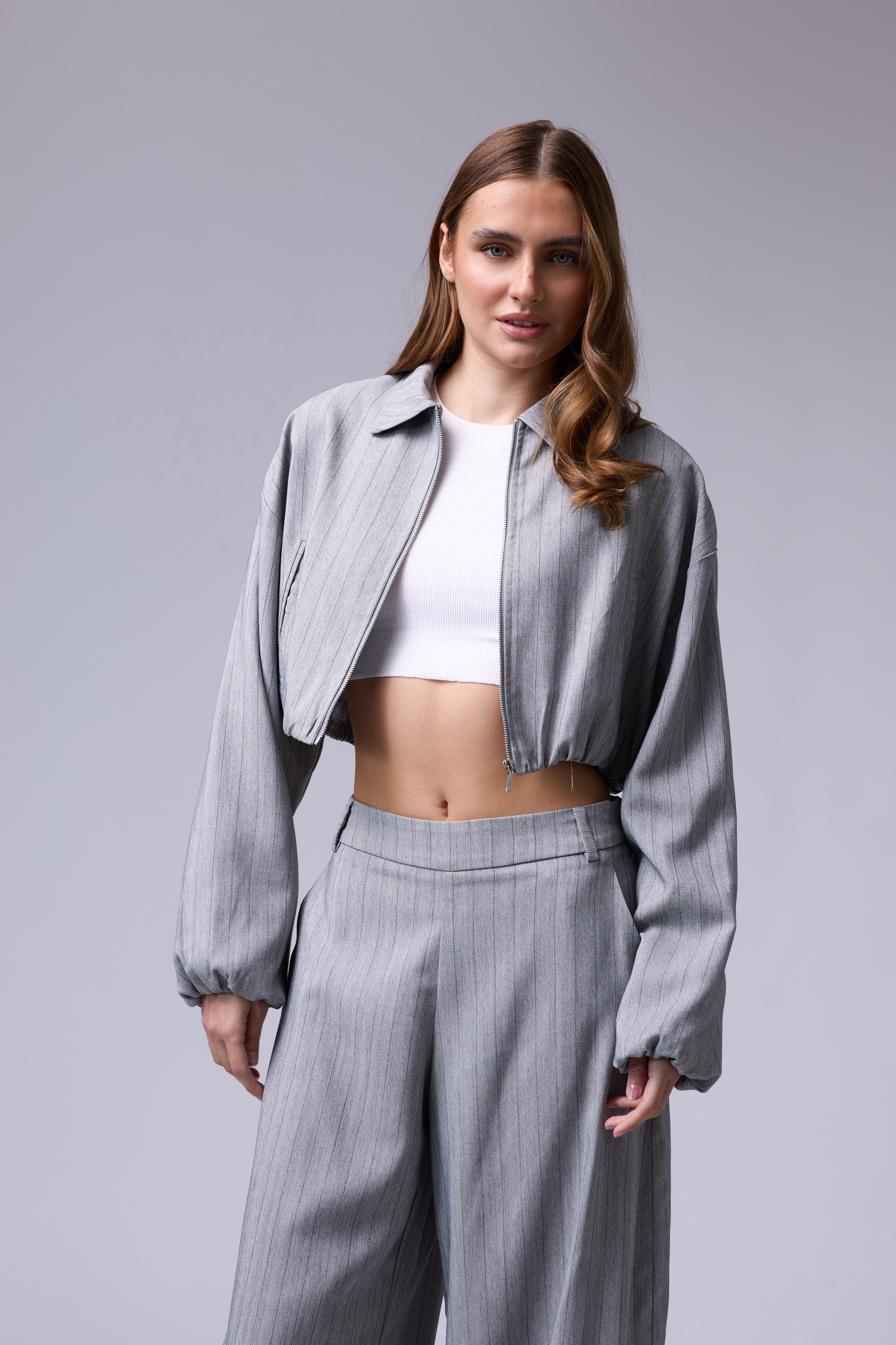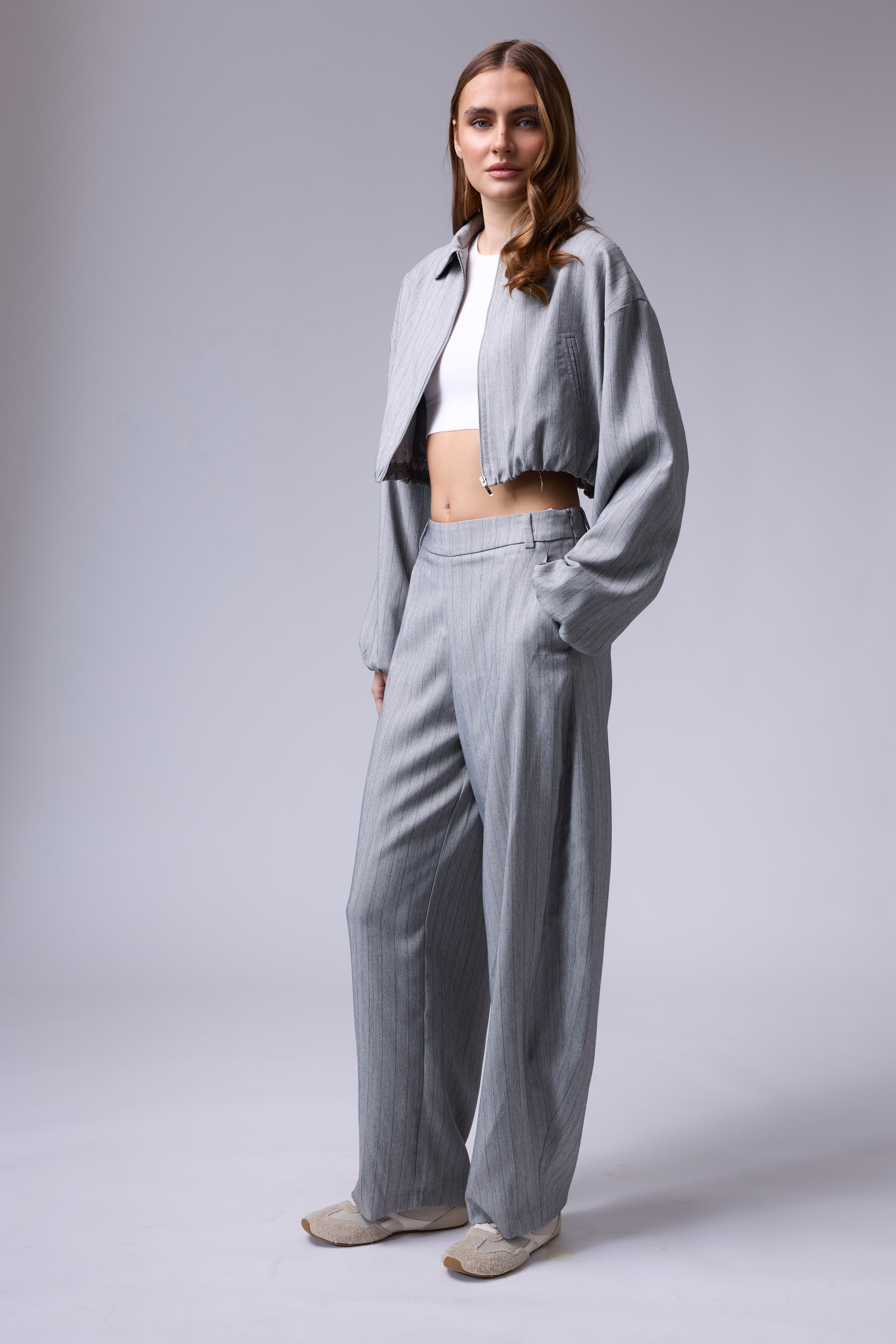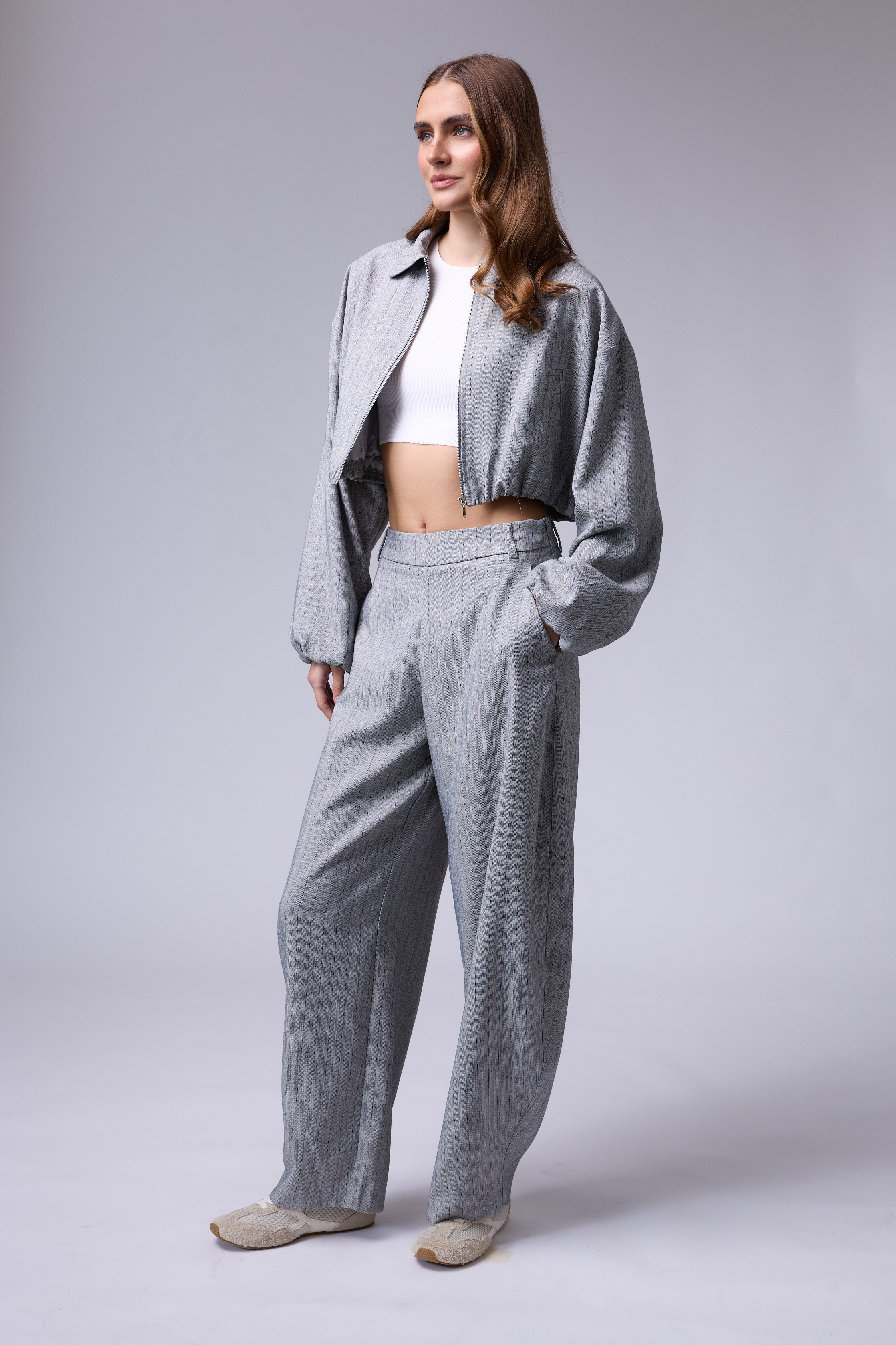 חליפת פסים מכנס בלון עם רוכסן בצד וג'קט עם רוכסן ושרוולים גדולים עם גימור של גומי בסיום