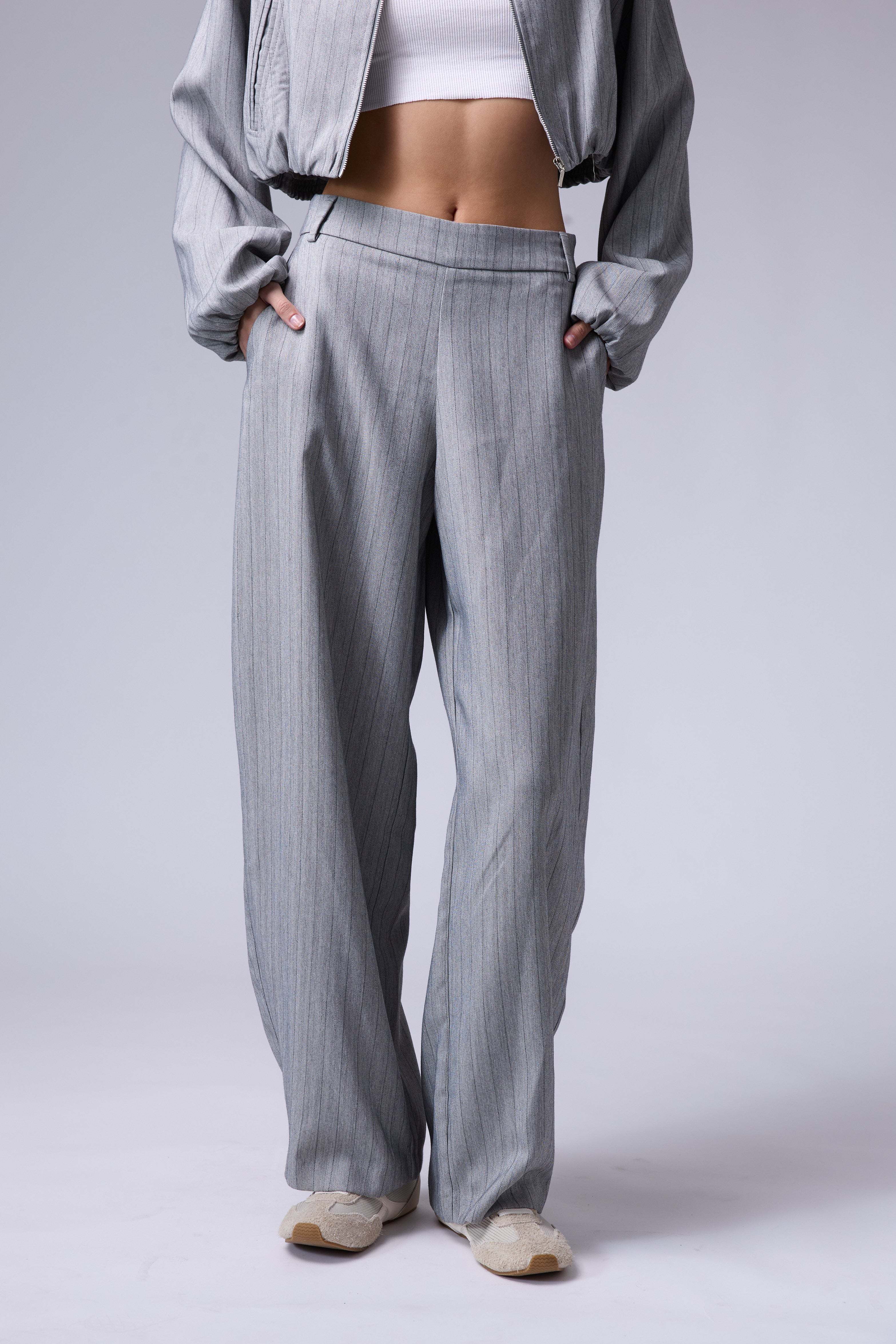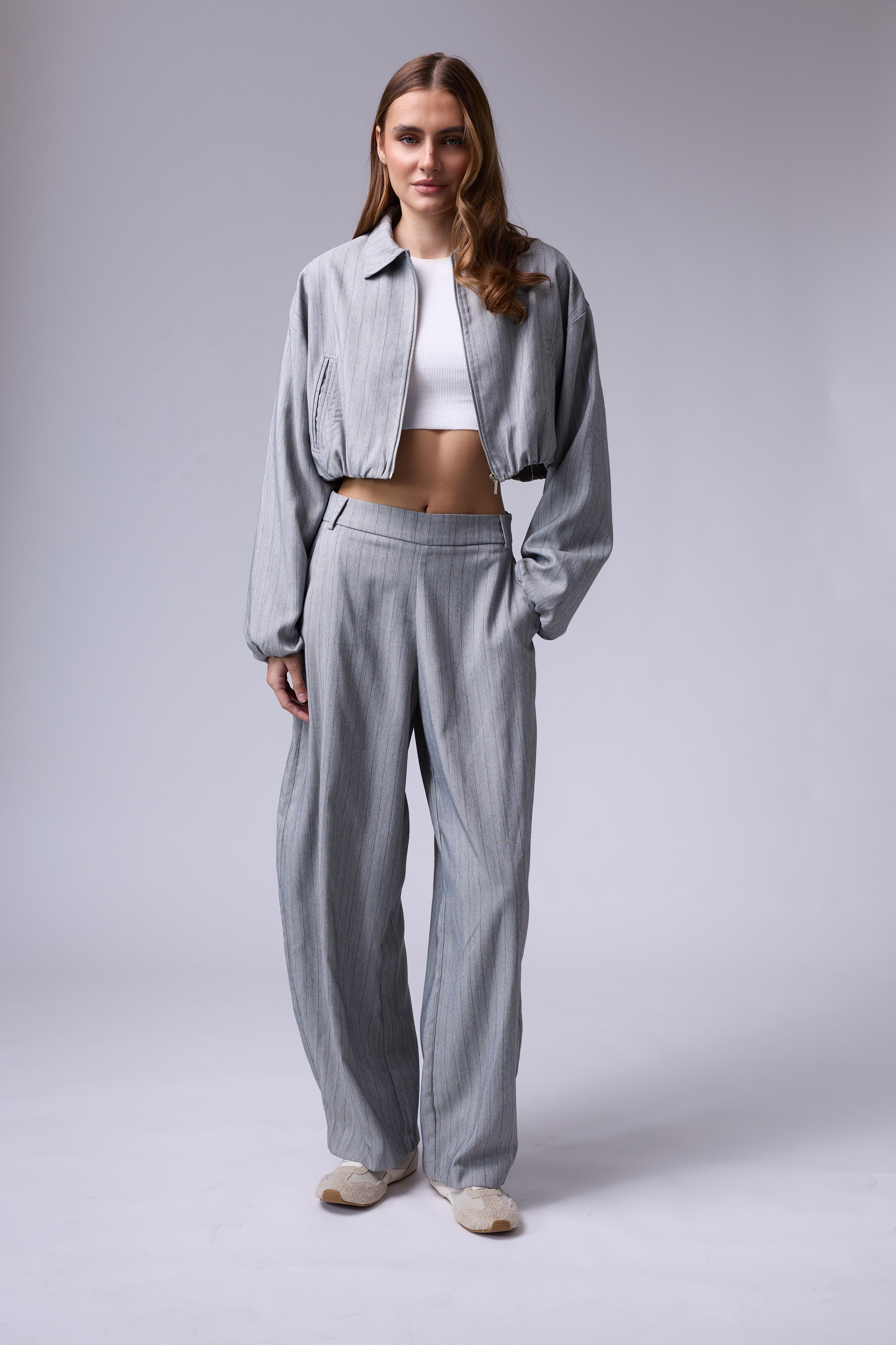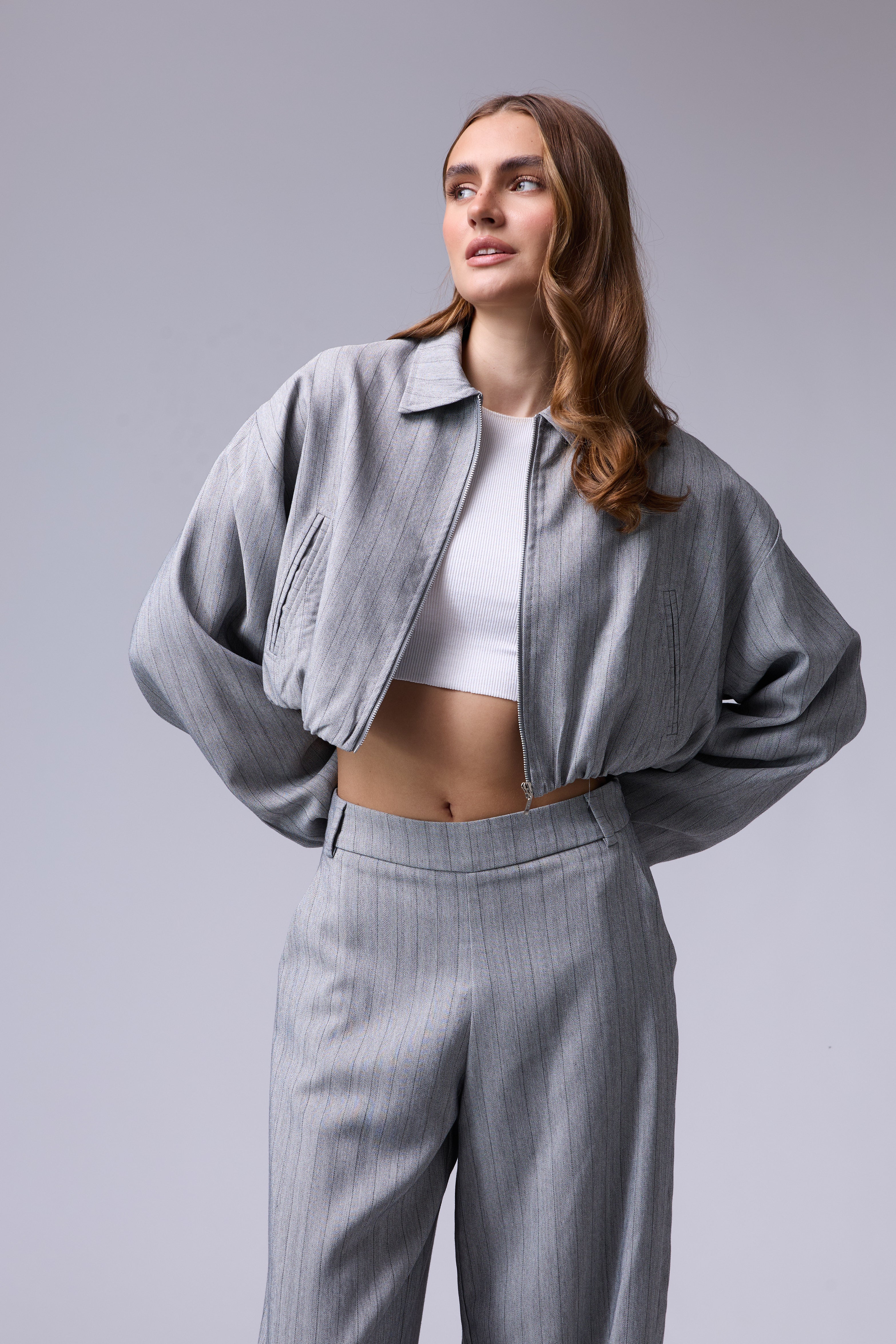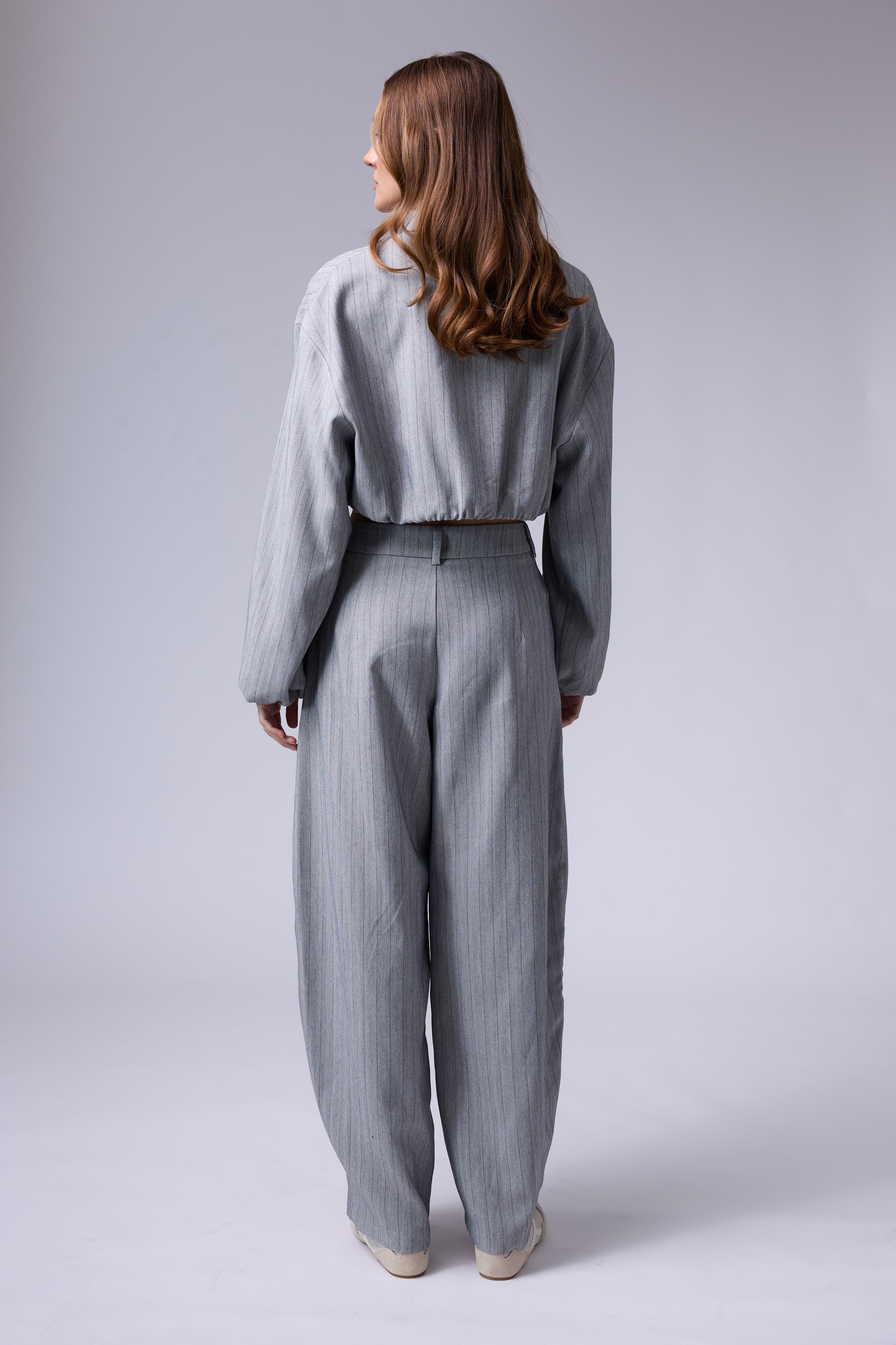 חליפת פסים מכנס בלון עם רוכסן בצד וג'קט עם רוכסן ושרוולים גדולים עם גימור של גומי בסיום