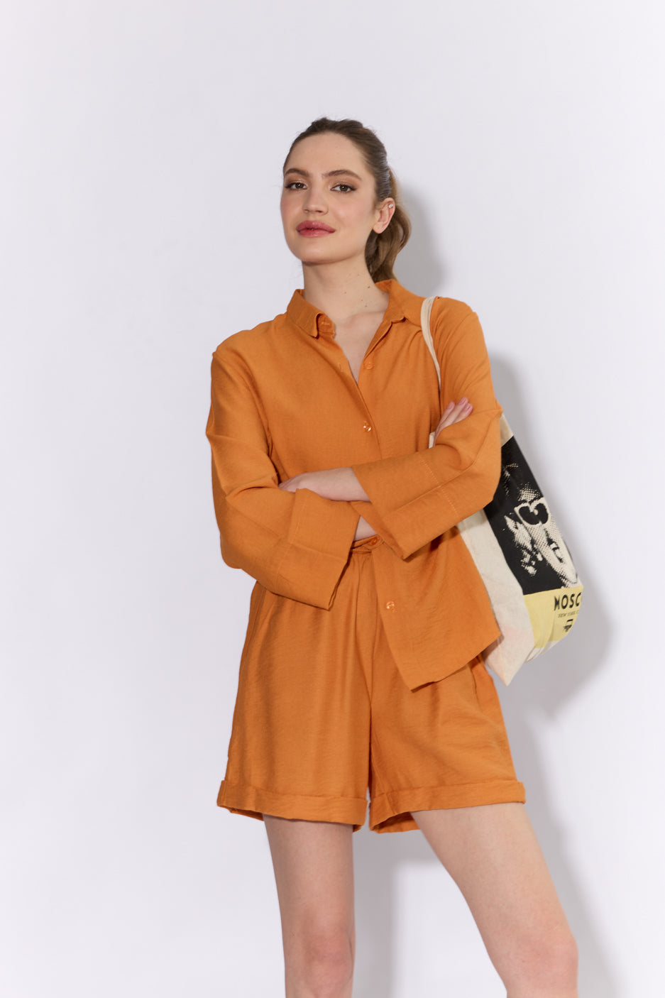 חליפה שני חלקים , מכנס קצר עם שרוך וחולצה מכופתרת שרוולים רחבים מבד פשתן איכותי