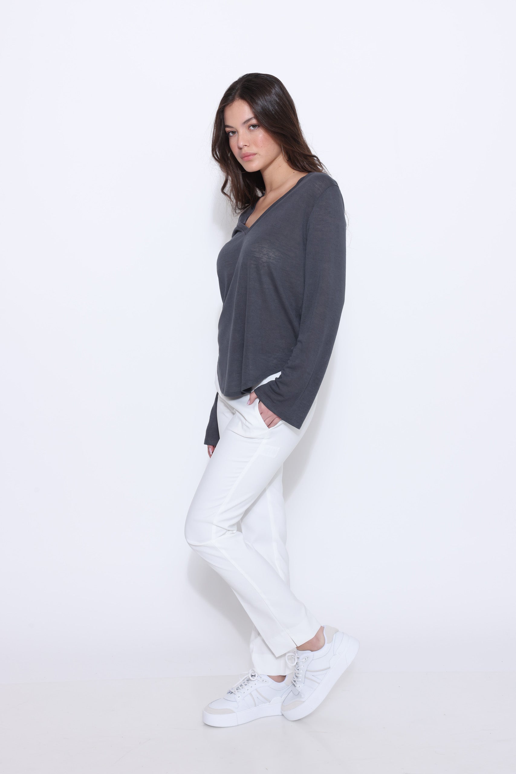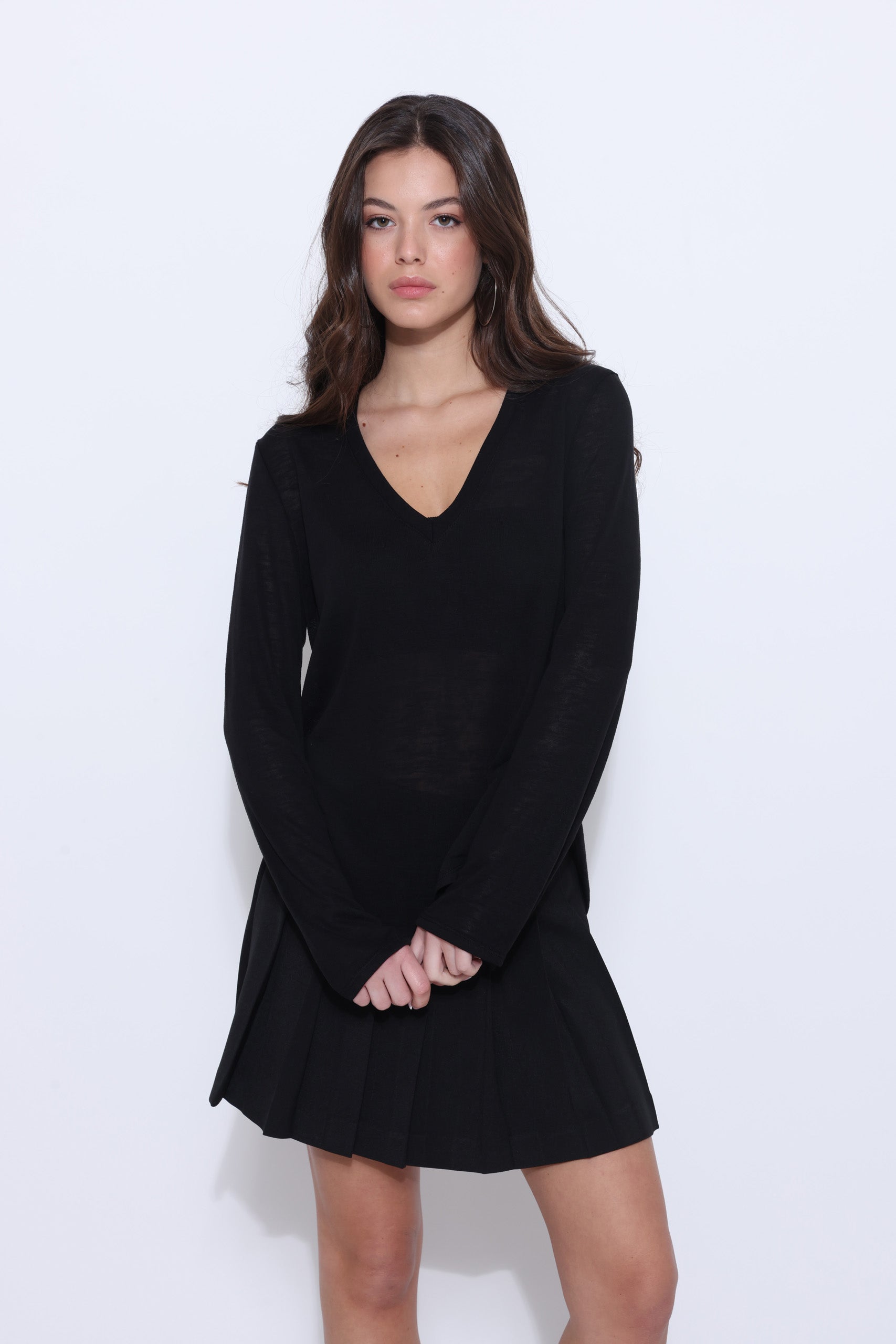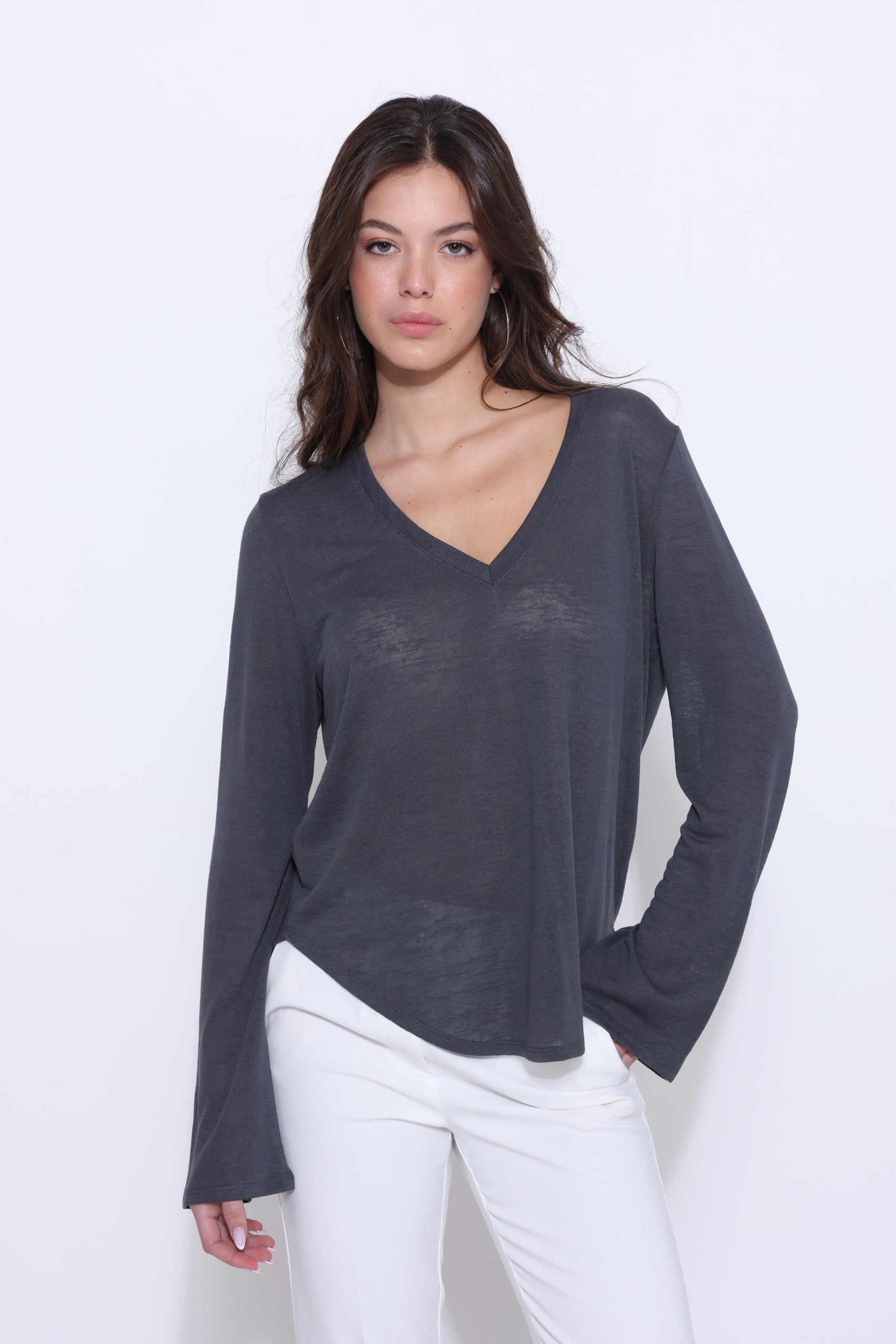חולצה סריג מבד דק עם מחשוף וי ושרוולים ארוכים מתרחבים