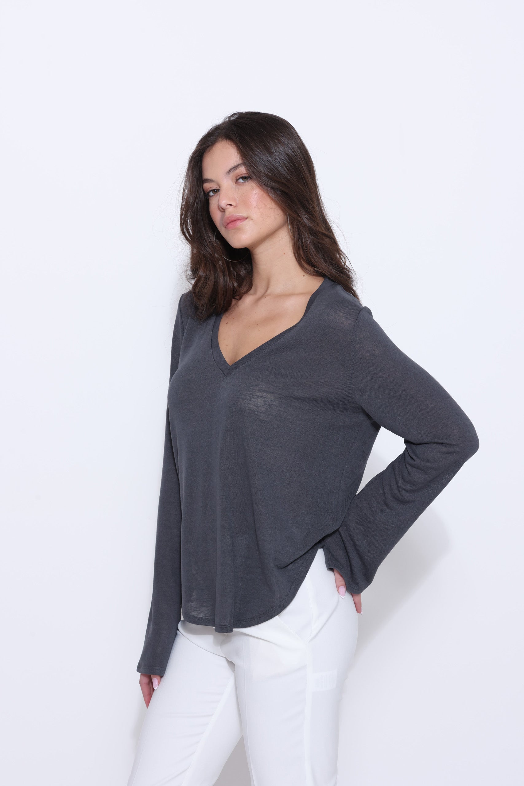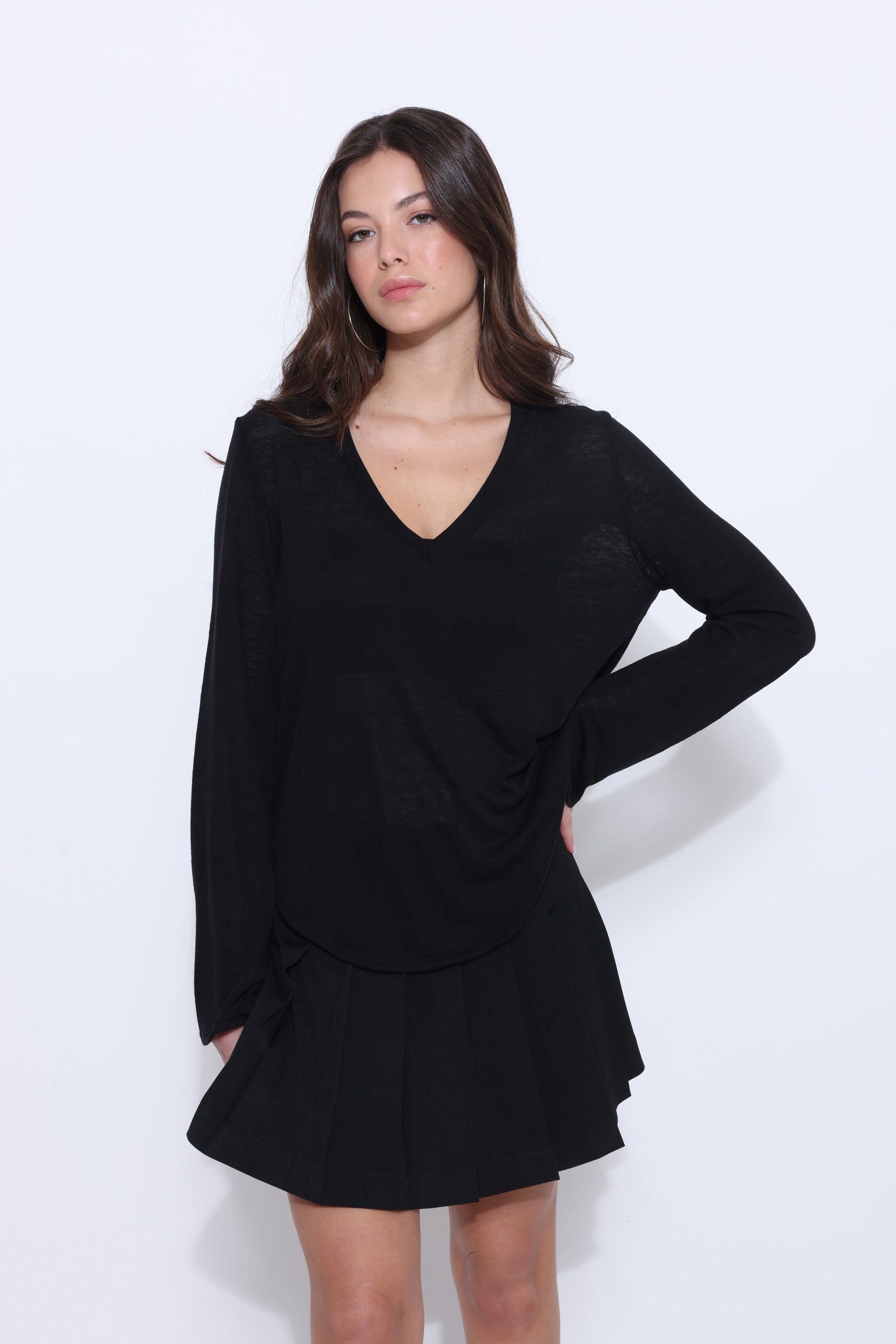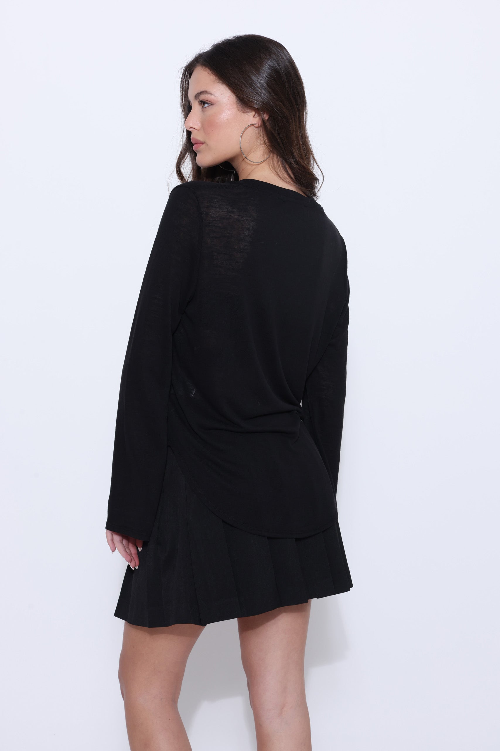 חולצה סריג מבד דק עם מחשוף וי ושרוולים ארוכים מתרחבים