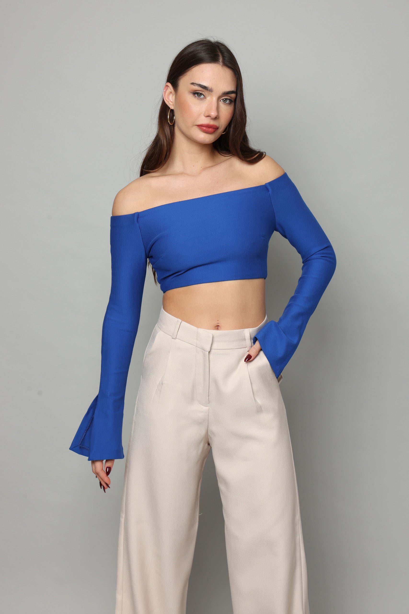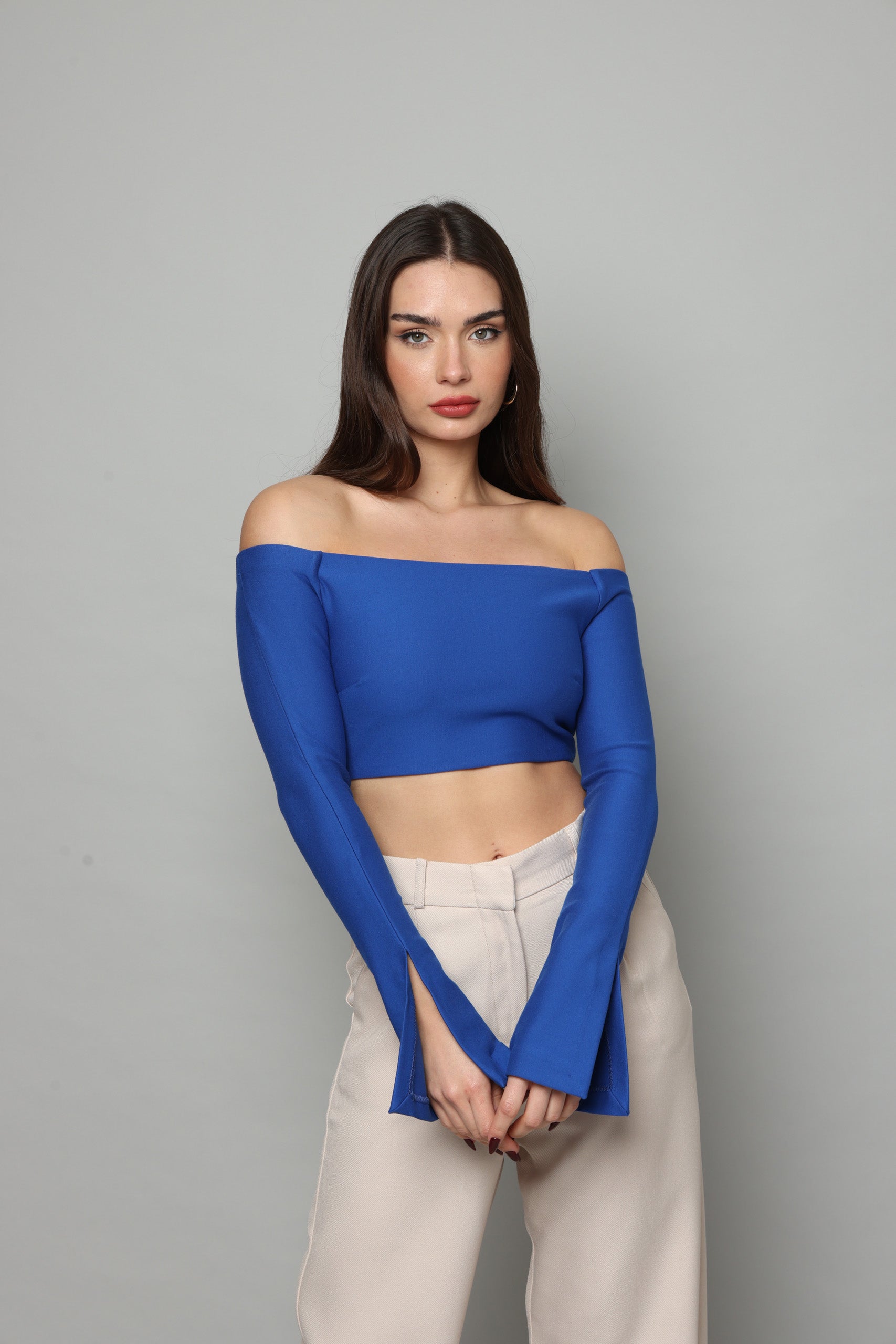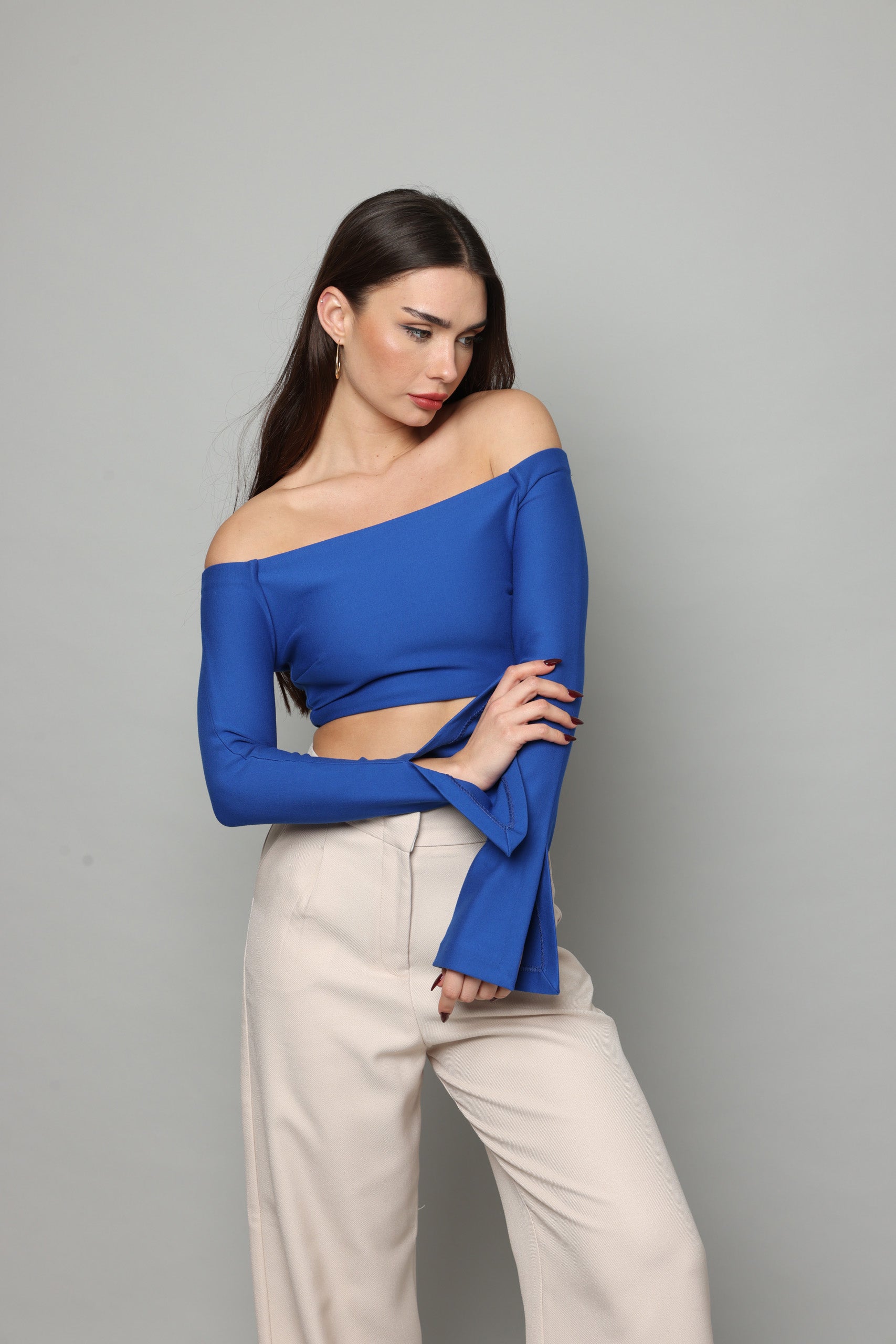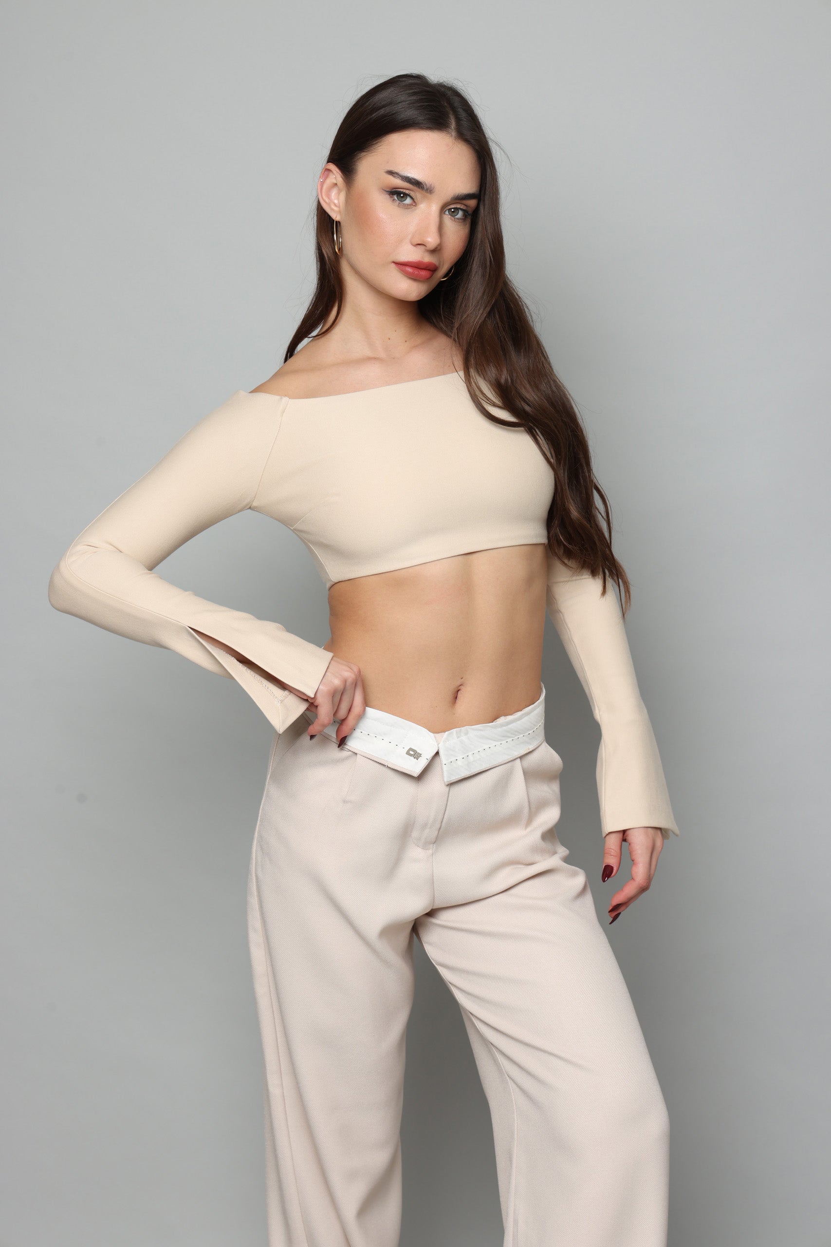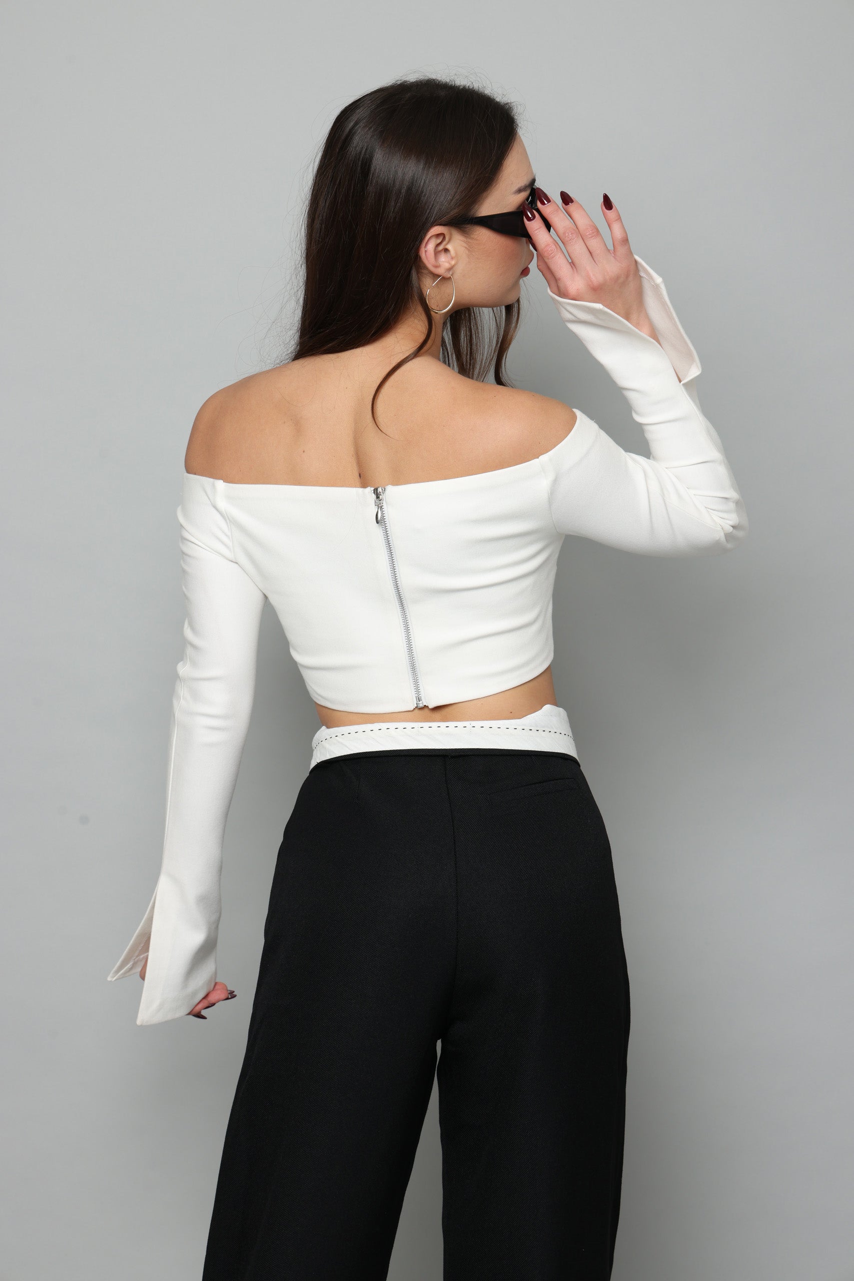 חולצה בטן עם שרוולים ארוכים מתרחבים עם שסע בצד נסגרת מאחורה עם רוכסן מבד מחטב
