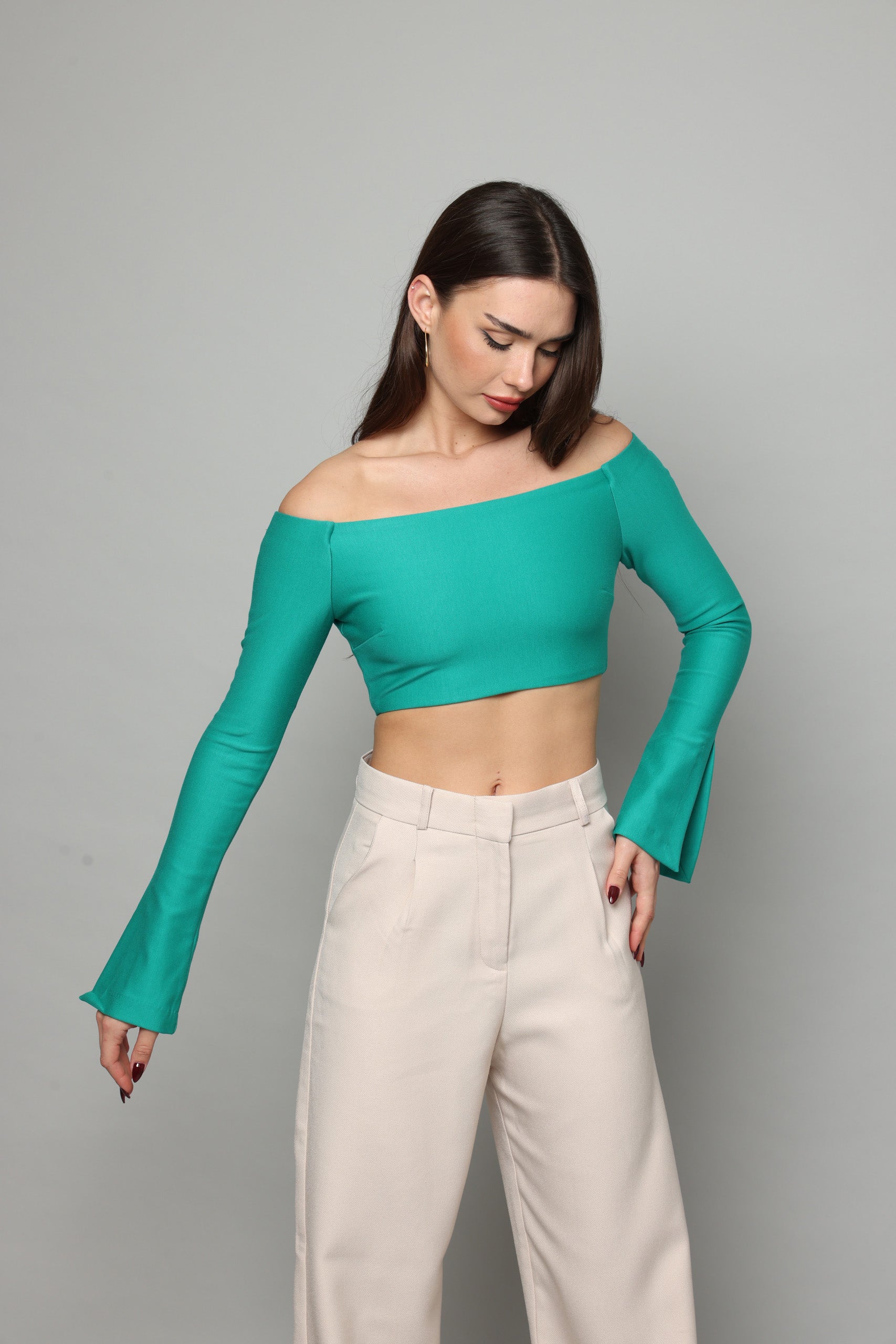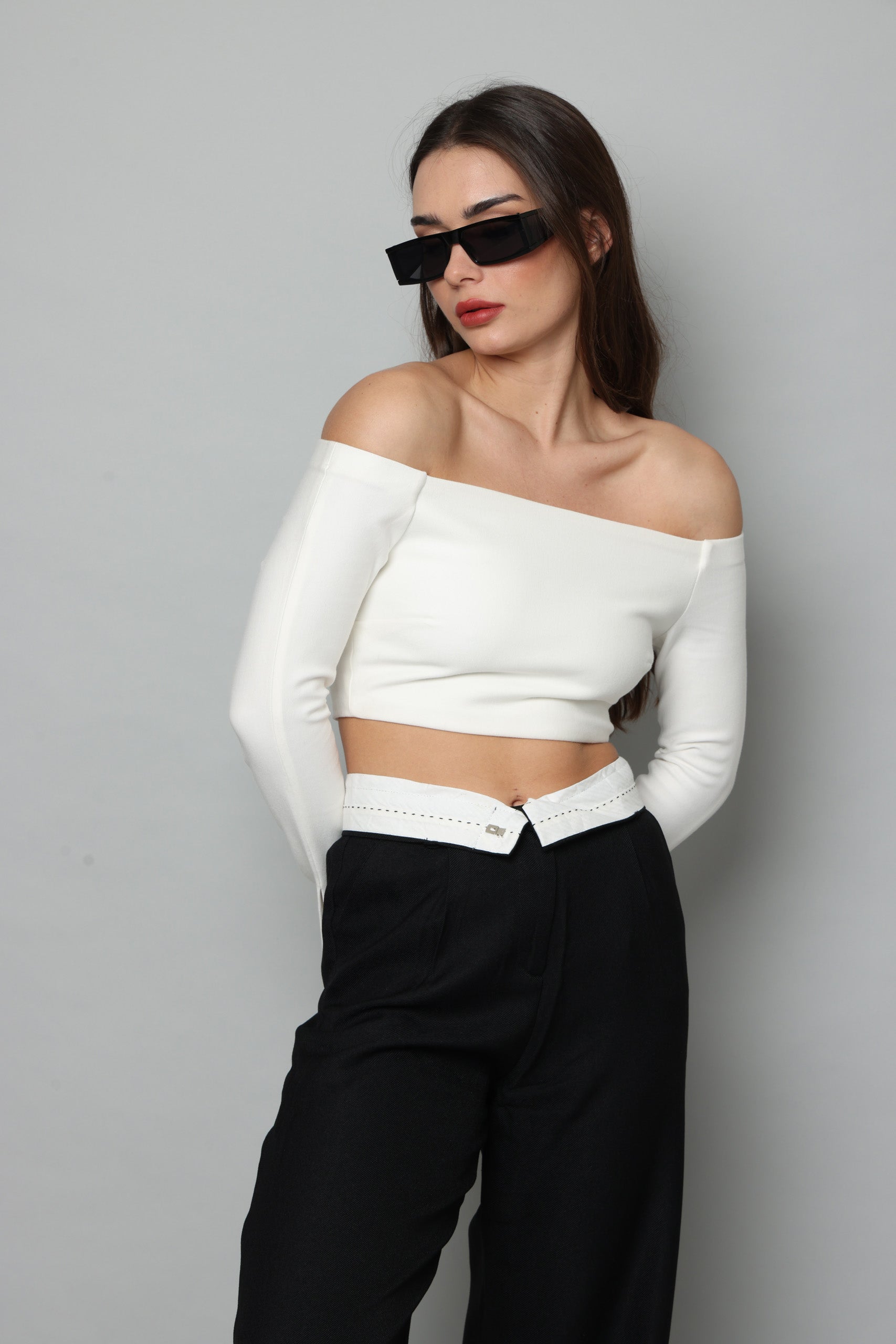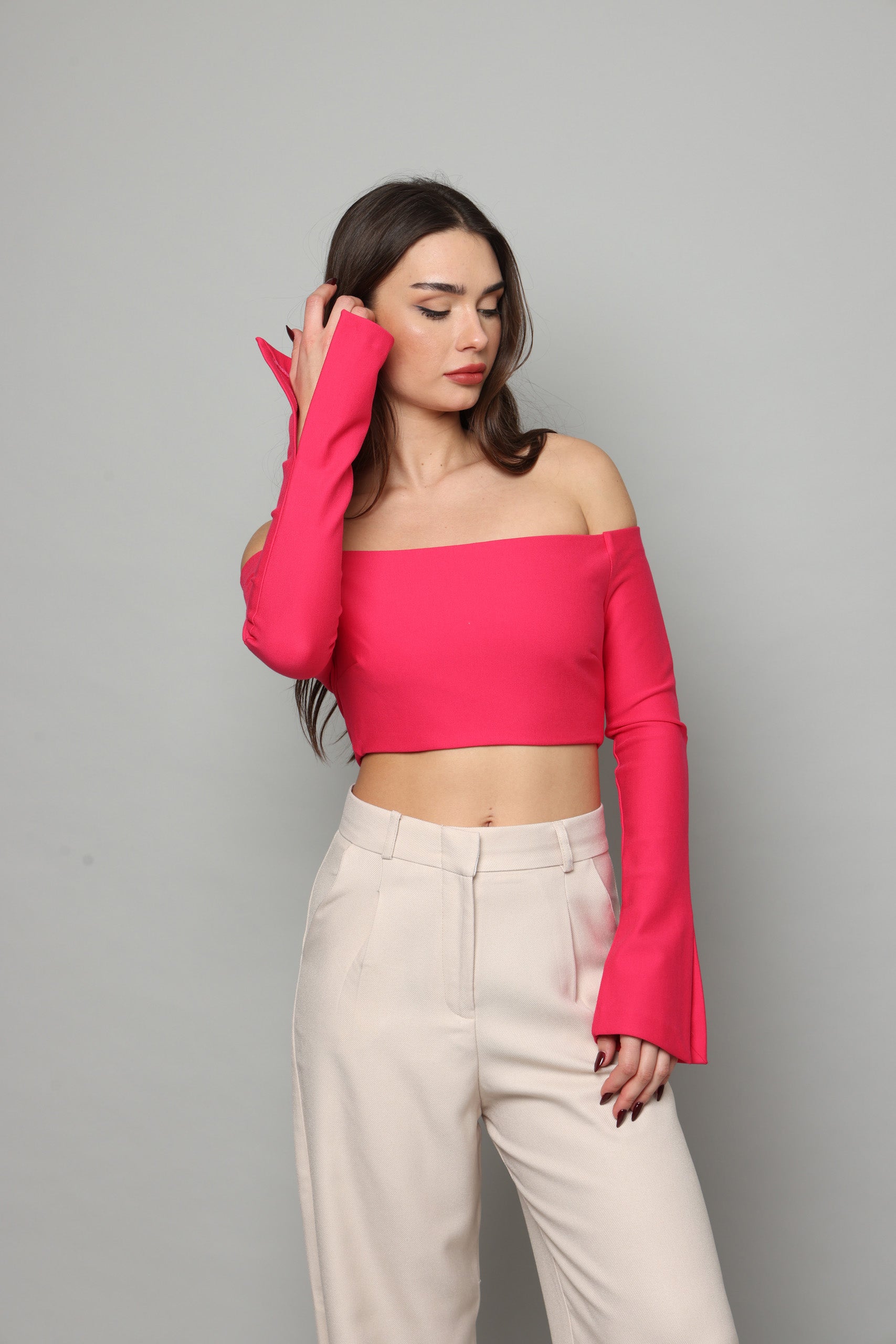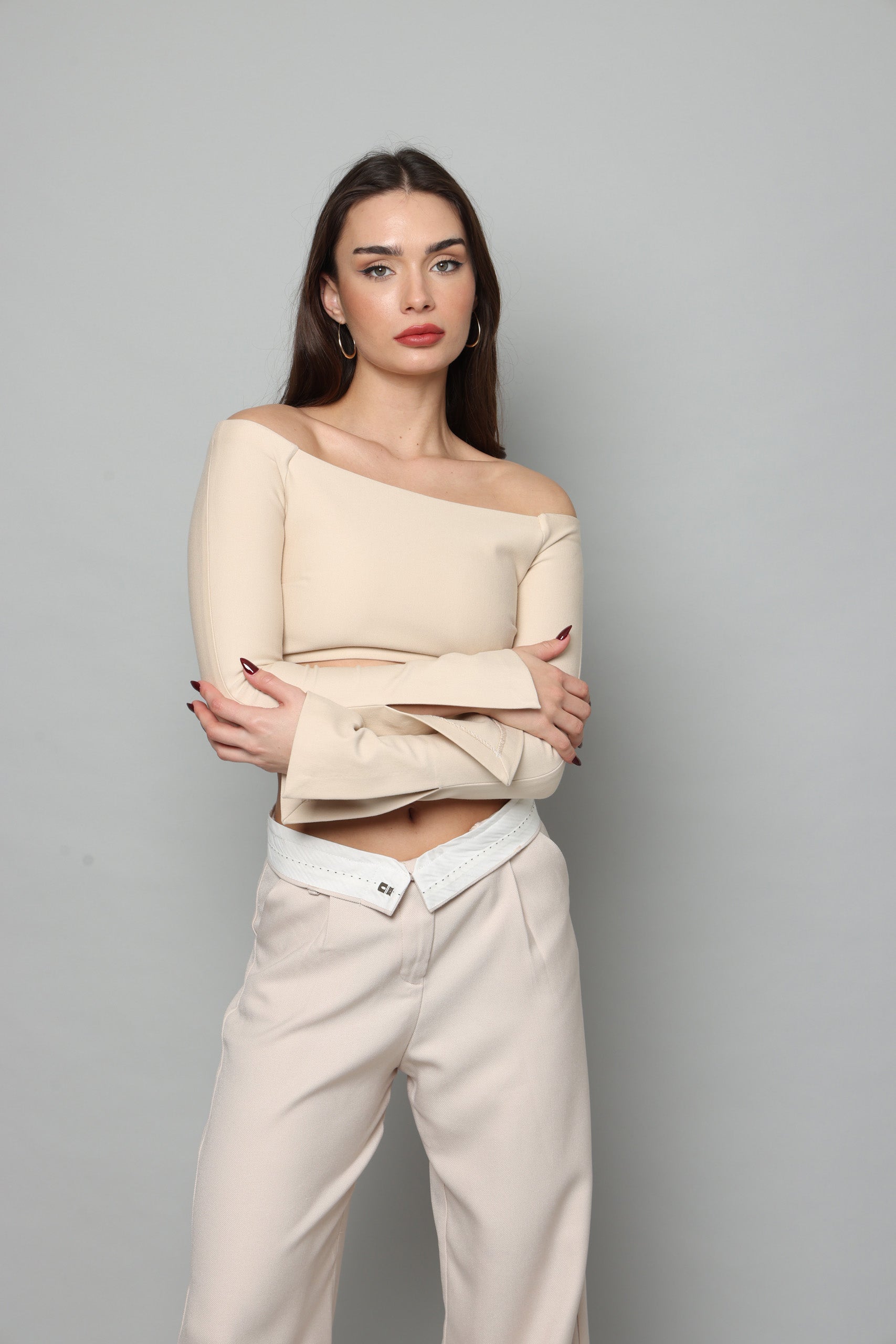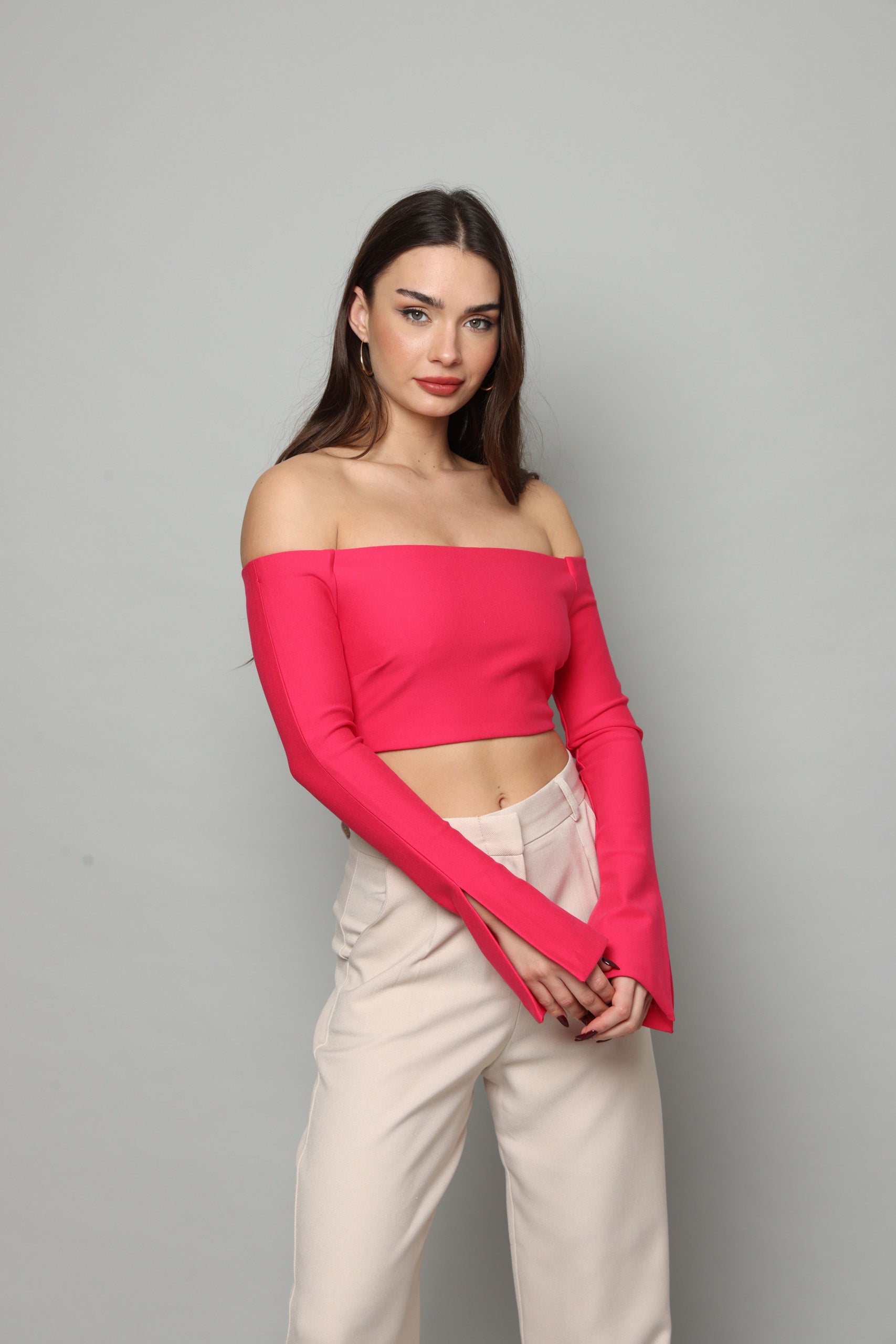 חולצה בטן עם שרוולים ארוכים מתרחבים עם שסע בצד נסגרת מאחורה עם רוכסן מבד מחטב