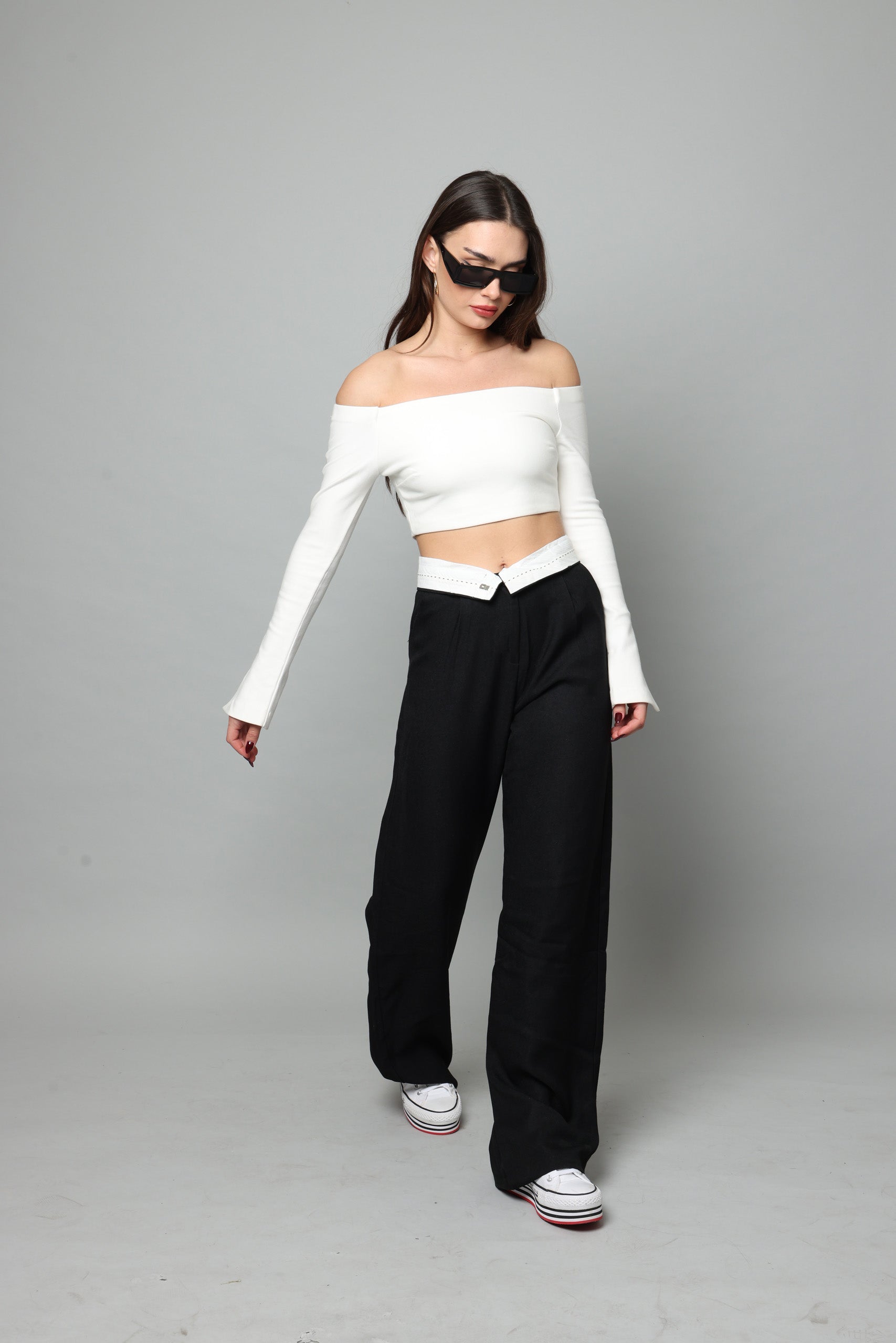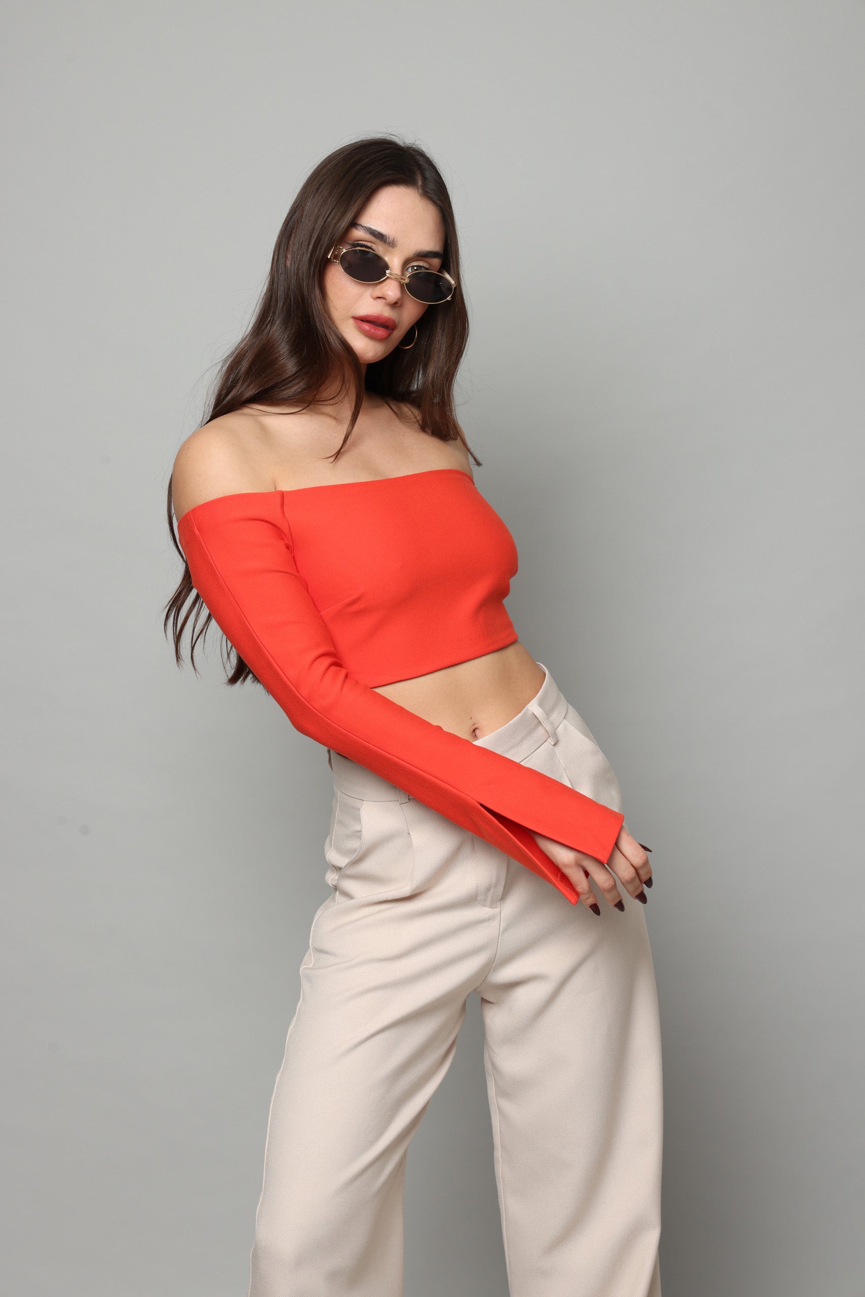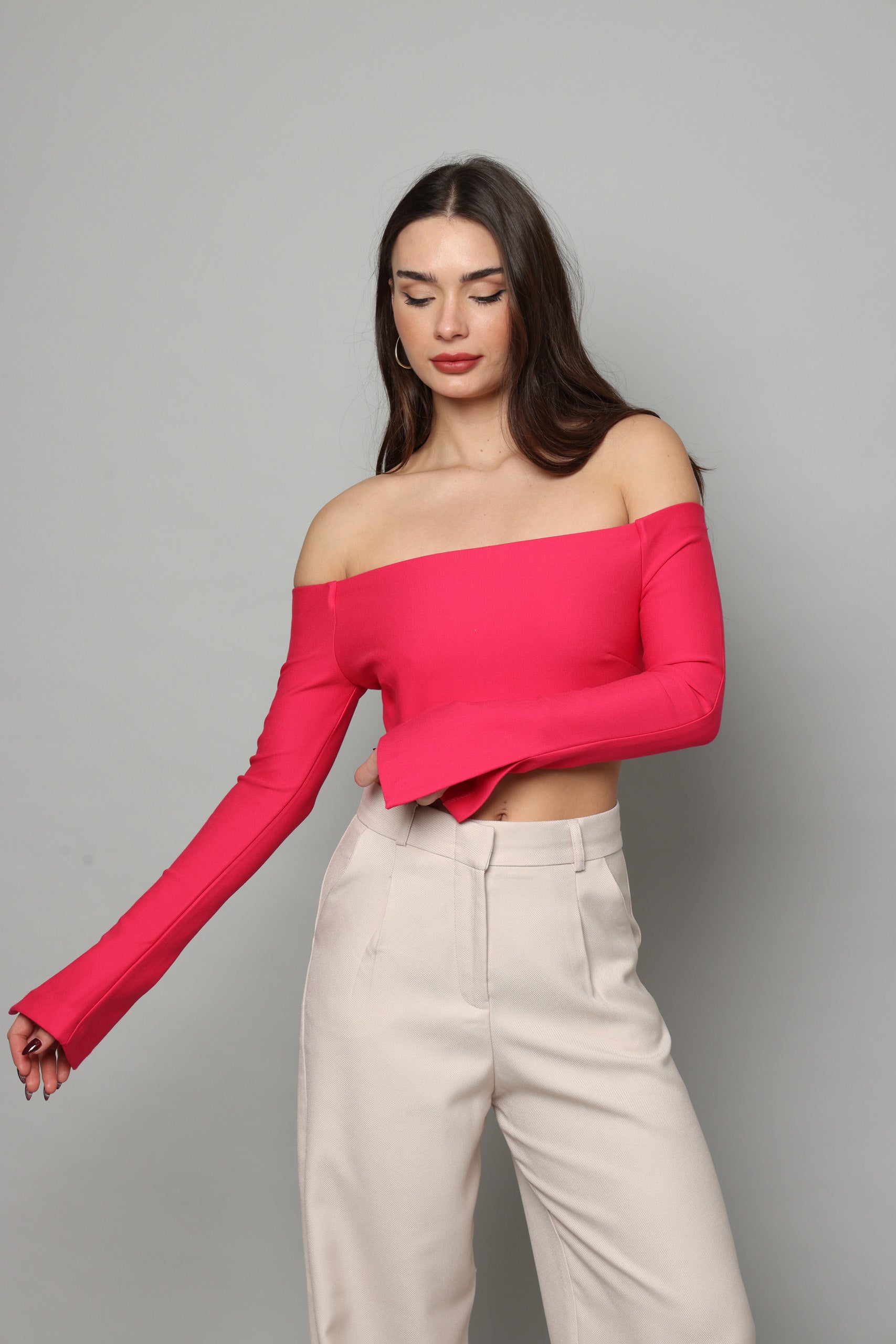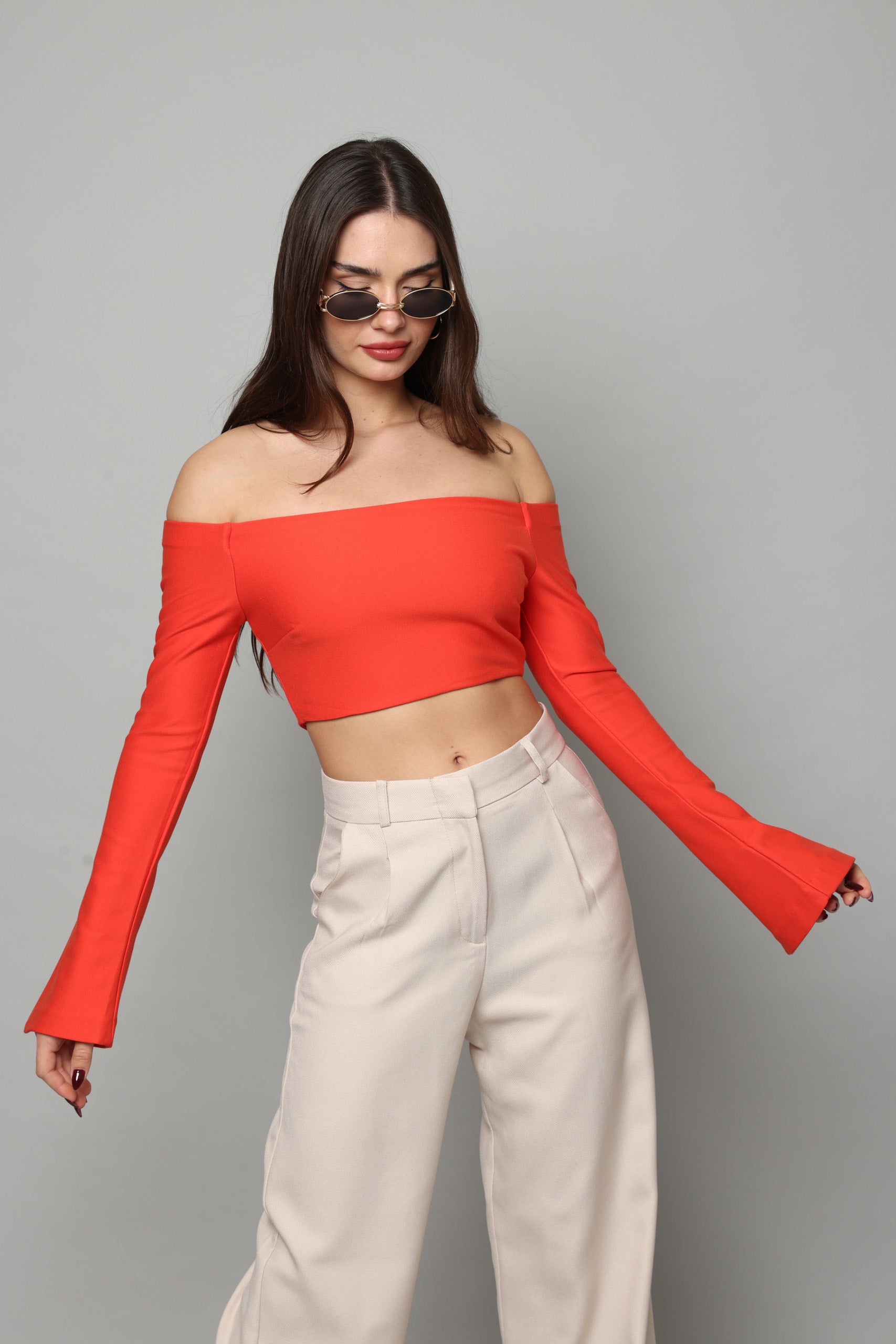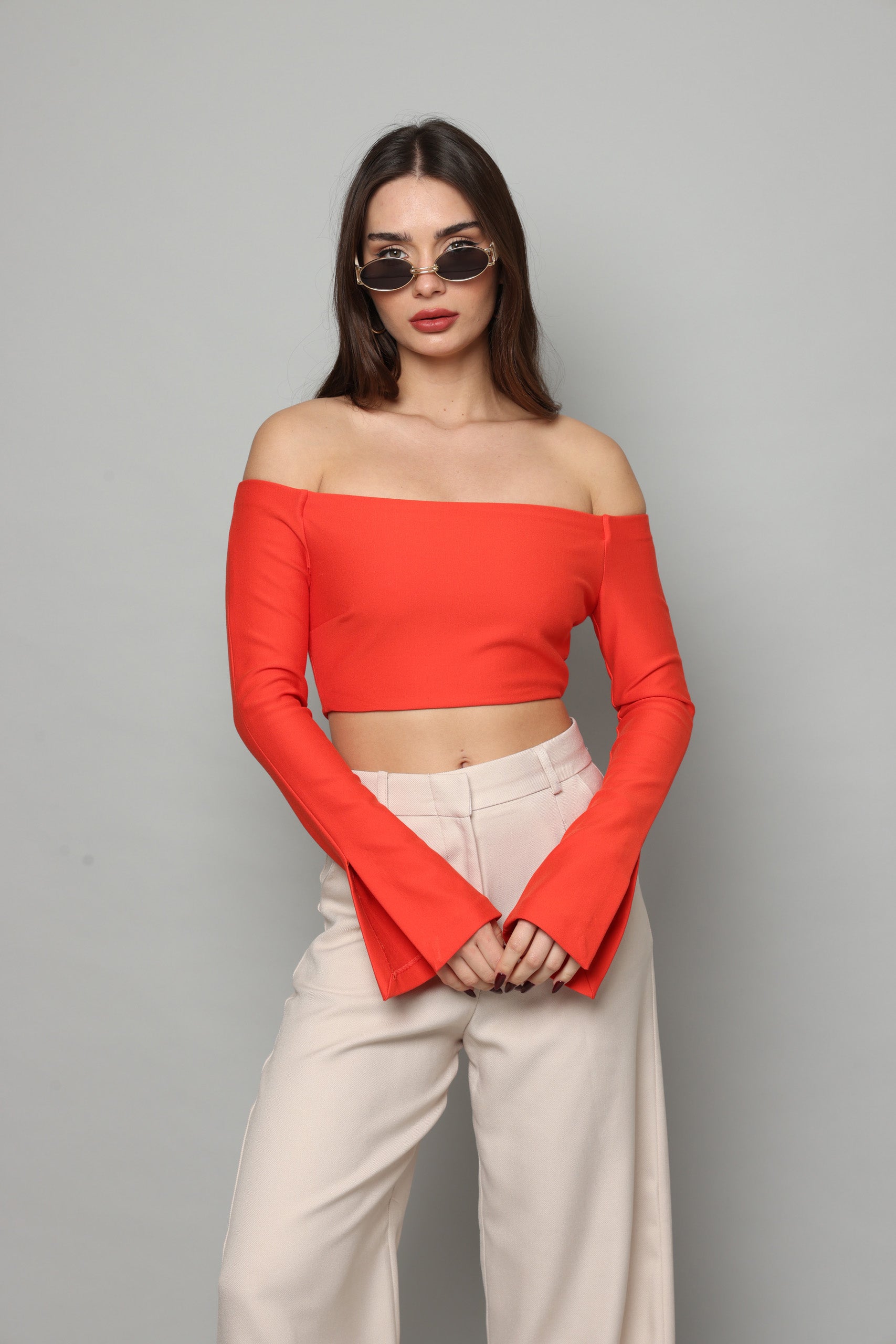 חולצה בטן עם שרוולים ארוכים מתרחבים עם שסע בצד נסגרת מאחורה עם רוכסן מבד מחטב