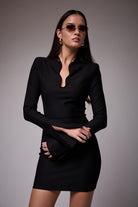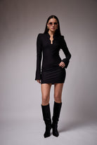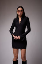 שמלה מיני צמודה עם שרוולים מתרחבים מבד מחטב ואיכותי , מחשוף גלים בעיטור אלמנט בצבע כסף