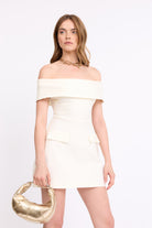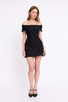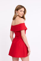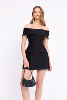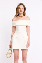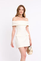 שמלה מיני כתפיים חשופות מבד מחטב בגזרת A מחמיאה , עיצוב דמוי כיסים בחזית וסגירה בגב ורוכסן נסתר בגב להשלמת הלוק