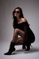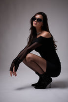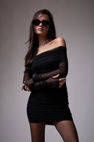שמלה מיני מבד שיפון בגזרת כיווצים כתפיים חשופות ושרוולים ארוכים , נסגרת עם רוכסן בגב