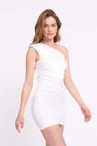 שמלה מיני אלגנטית עם כתף אחת מבד סאטן איכותי , סגירה בגב עליון בעזרת רצועה ואבזם בצבע כסף ורוכסן נסתר לנוחות מושלמת
