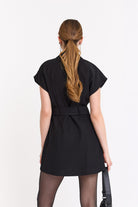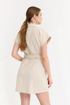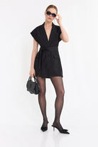 שמלה מיני קצרה עם כפתורים וחגורת קשירה במותניים ושסע קטן בצד מבד לייקרה