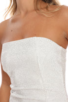 שמלה מיני סטרפלס מבד מחטב בעיטור אבנים השמלה נסגרת בצד עם רוכסן נסתר