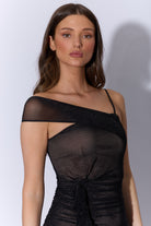 שמלה מיני כתף אחת מבד לורקס שקוף ובטנה בצבע גוף עם כיווצים סגירה בגב עם רוכסן
