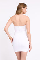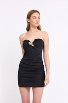 שמלה מיני מחטבת בגזרת סטרפלס , עשויה בד איכותי עם אלמנט פרח זהב בולט בחזית , לשיק זוהר נועז וייחודי.