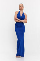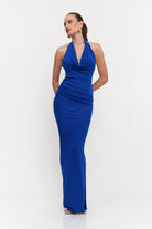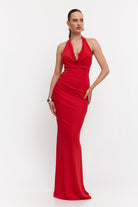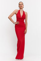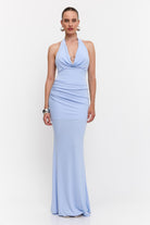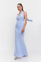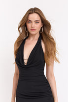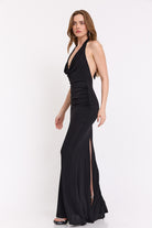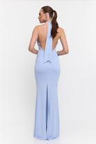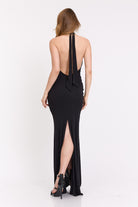 שמלה מקסי קולר רבידה מקדימה עם אלמנט לב בצבע כסף , גב חשוף עם שסע אחורי מבד נשפך ואיכותי