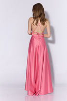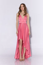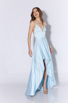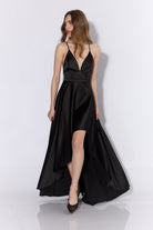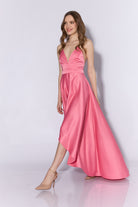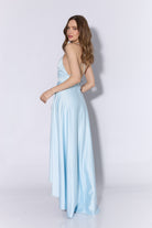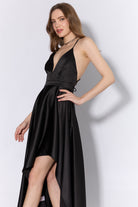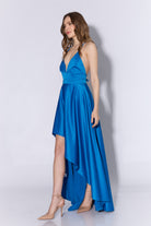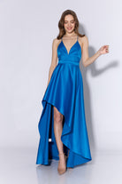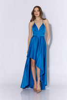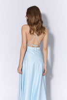 שמלה ערב מקסי מבד סטן ,כתפיות דקות איקס בגב, החצאית קצרה יותר בחלק הקדמי מהאחורי.