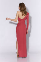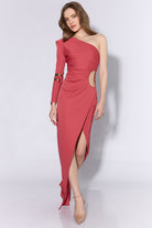 שמלה ערב מקסי מבד מעוצב ,שרוול טרזן צד אחד ארוך וכתף אחת חשופה עם פתח בבטן שסע בחצאית