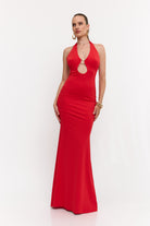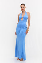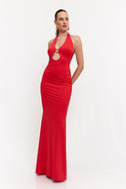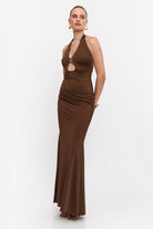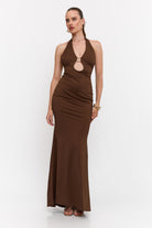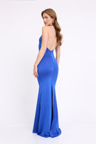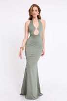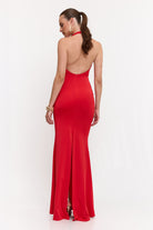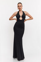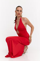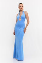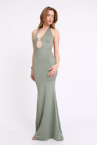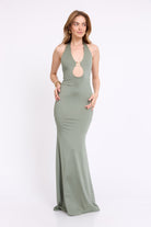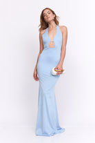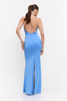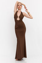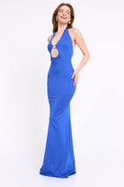 שמלה מקסי קולר בעיטור של אלמנט זהב מקדימה , גב חשוף ושסע מאחורה מבד מחטב ואיכותי