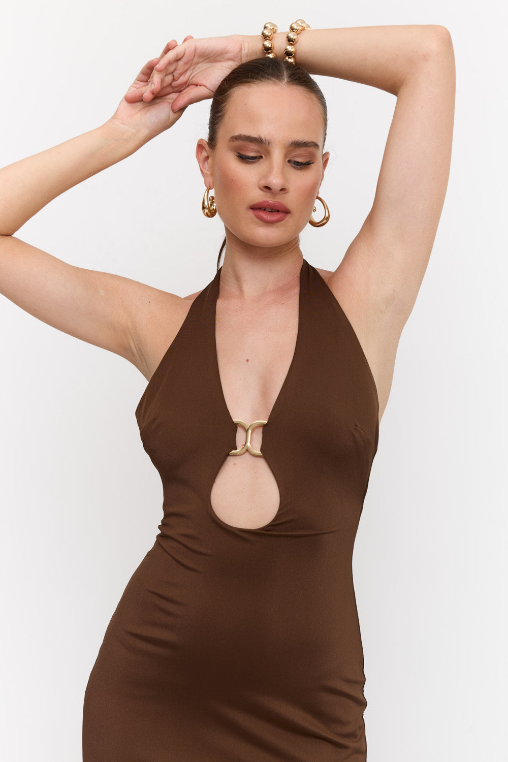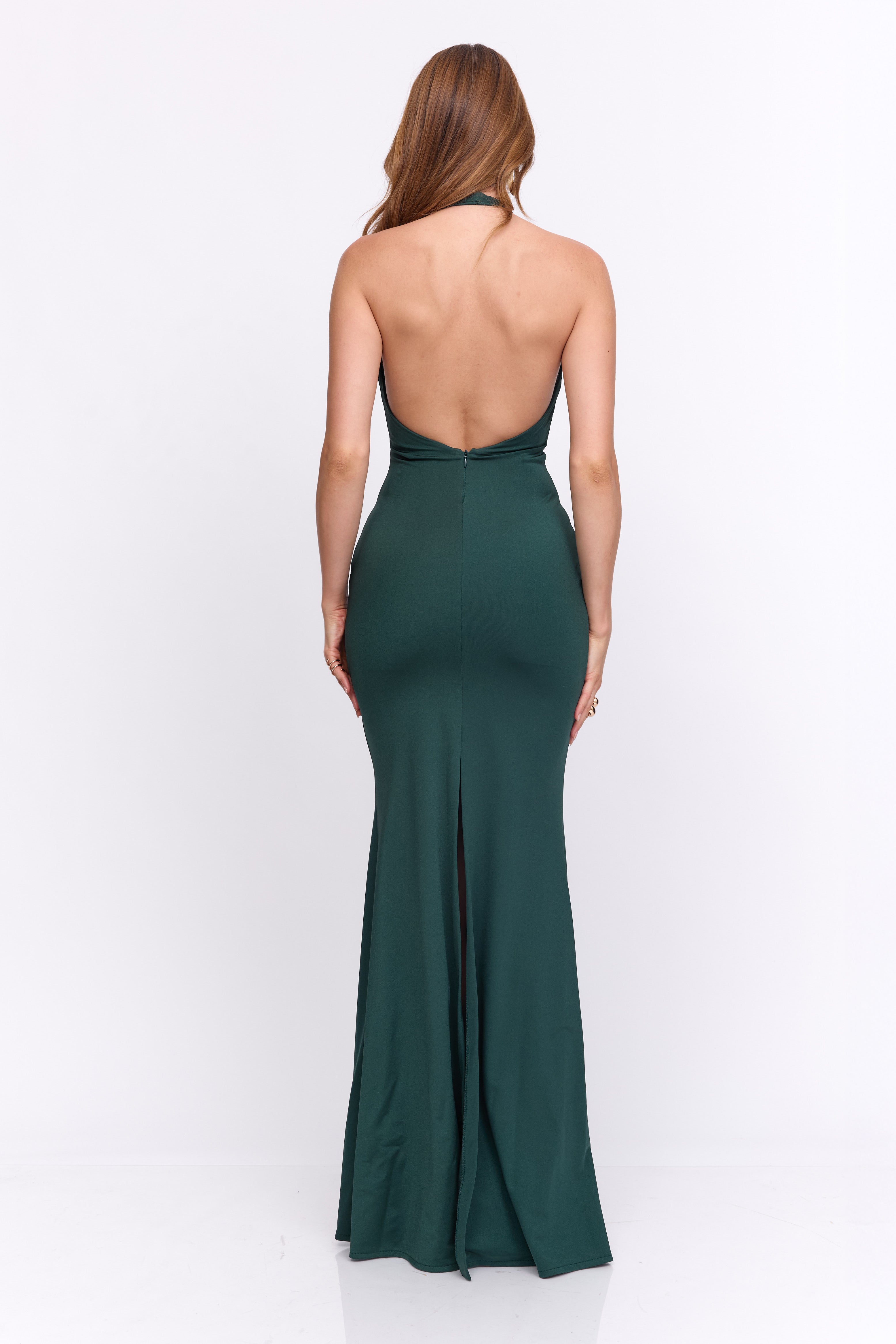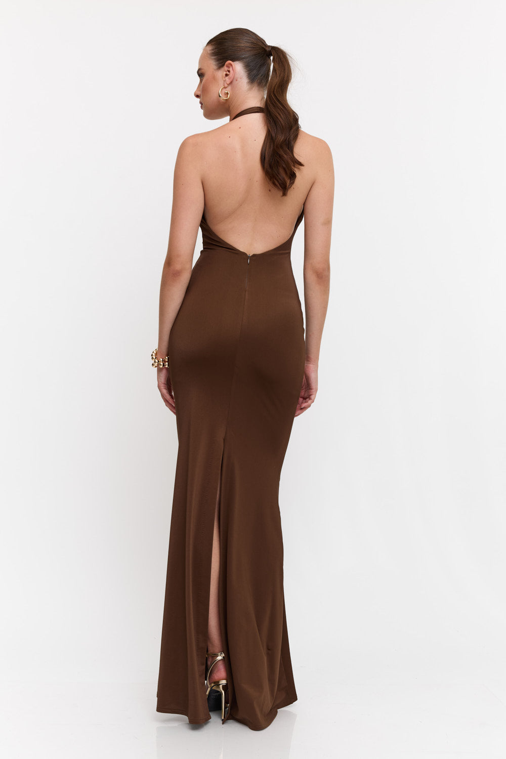שמלה מקסי קולר בעיטור של אלמנט זהב מקדימה , גב חשוף ושסע מאחורה מבד מחטב ואיכותי