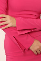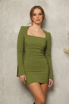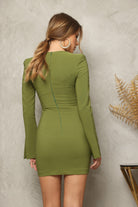 שמלה מיני שרוולים ארוכים עם כריות בכתפיים נסגרת בגב עם רוכסן נסתר מבד מחויט