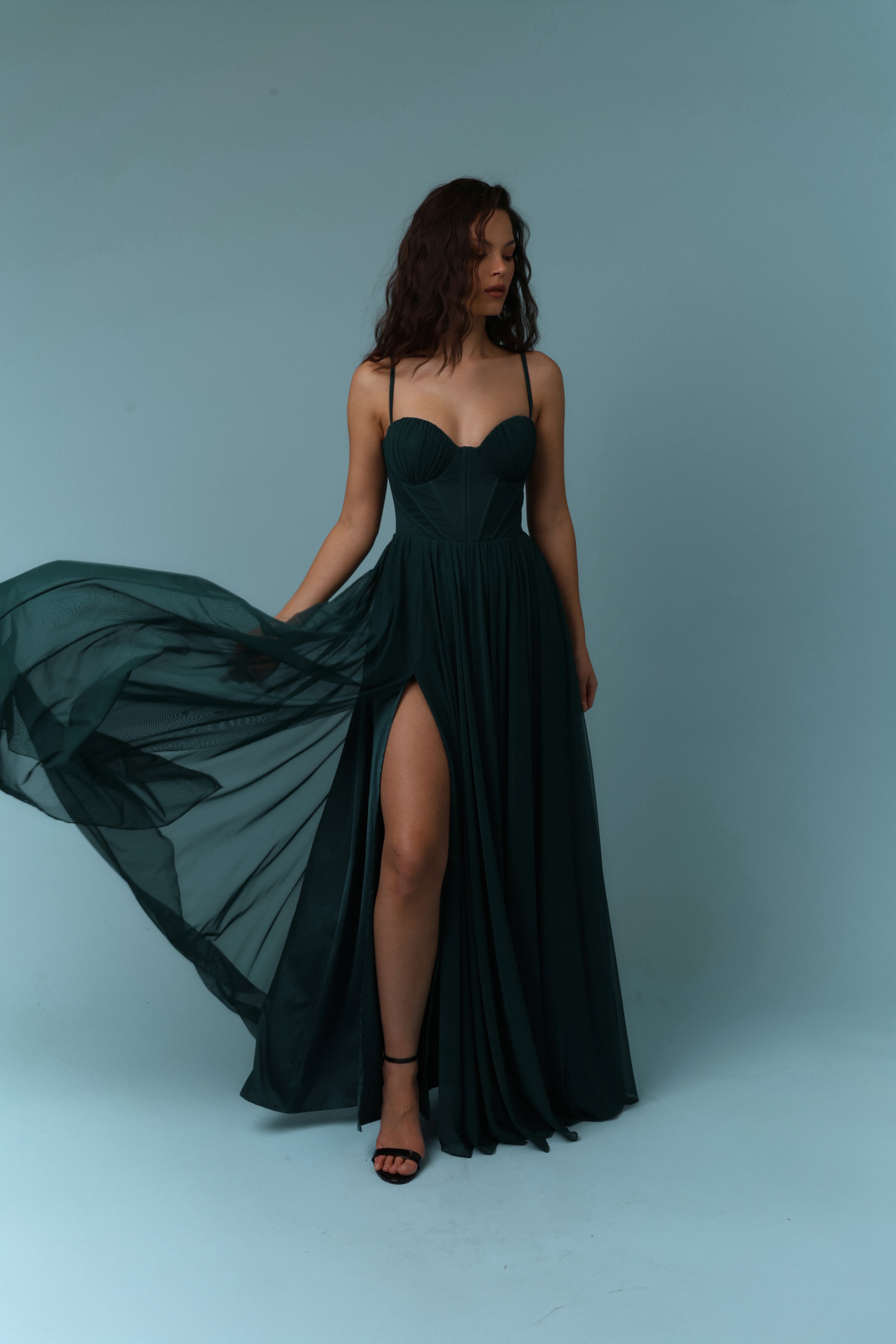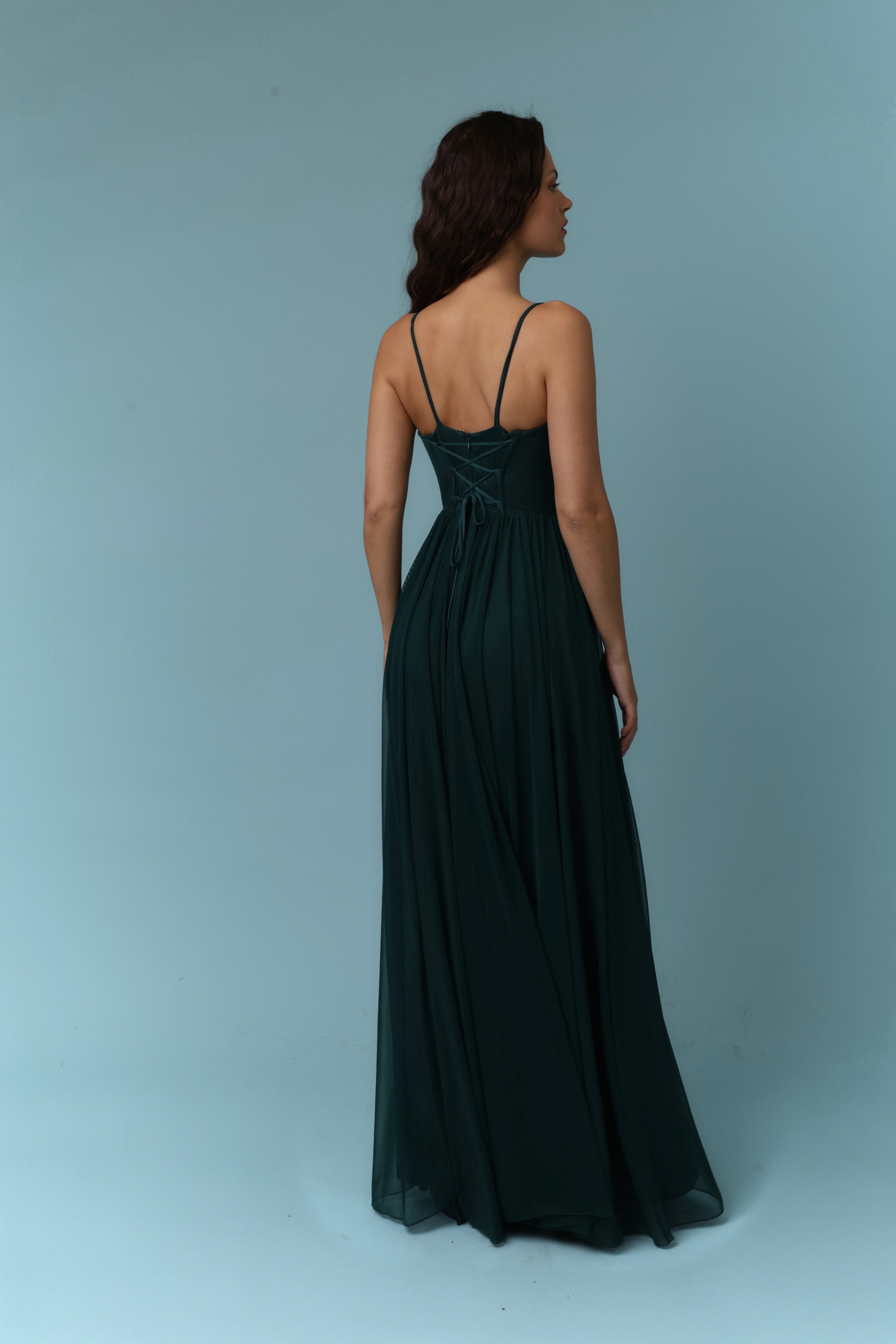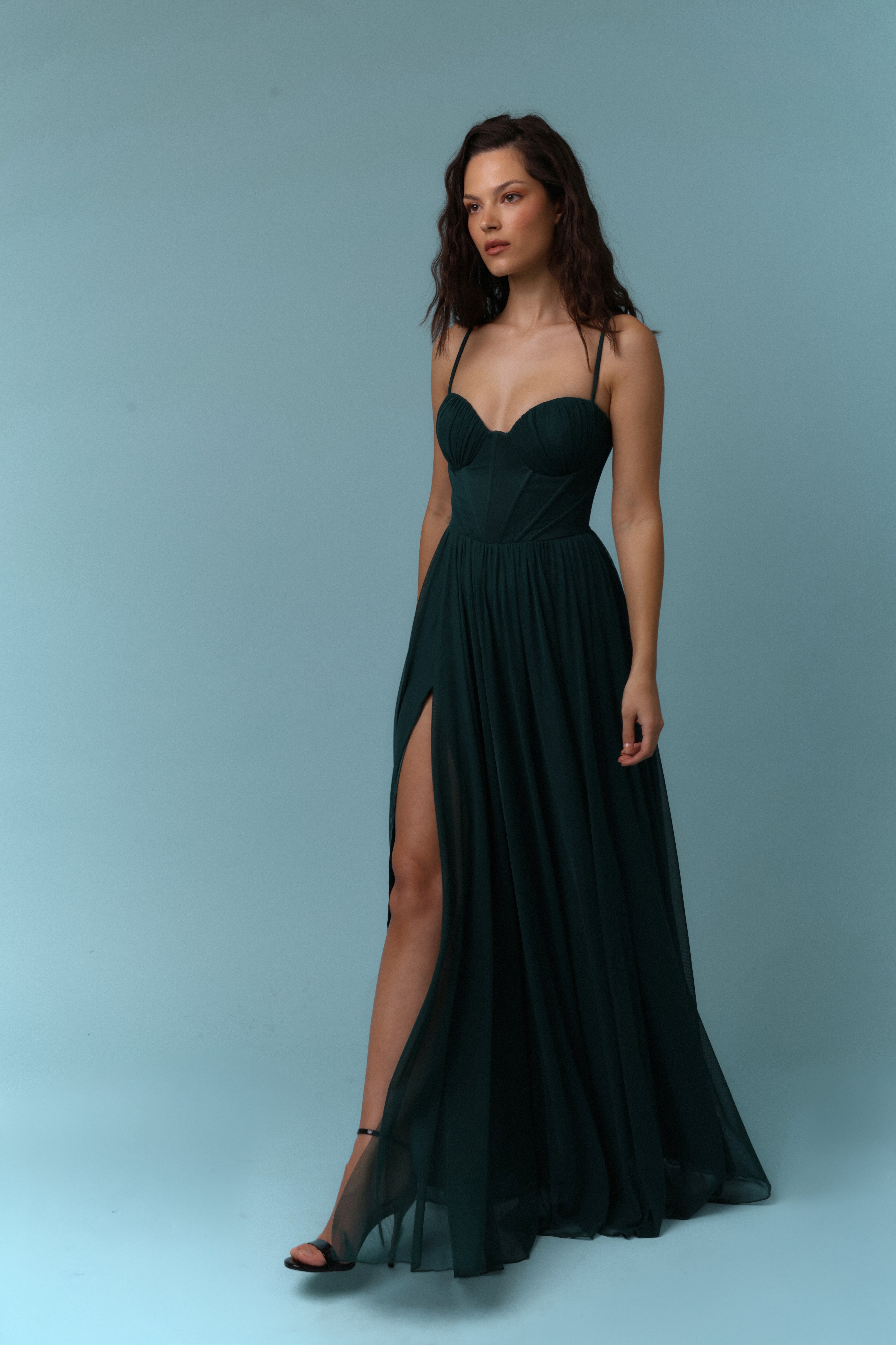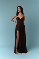 שמלה מקסי נשפכת ואלגנטית בגזרת קאפ מחטבת מבד שיפון איכותי , עם בטנה פנימית ושסע עמוק בצד הרגל, נסגרת בגב עם רוכסן נסתר ושרוך קשירה - מושלמת לאירועים